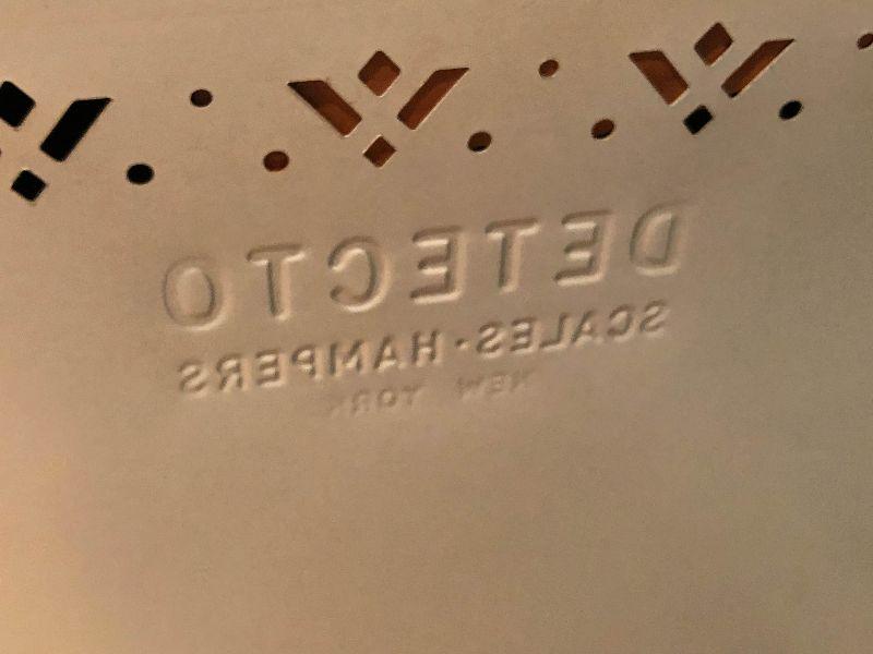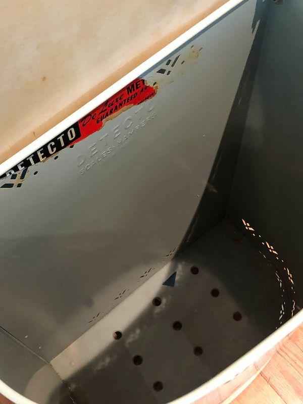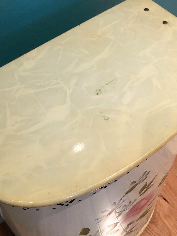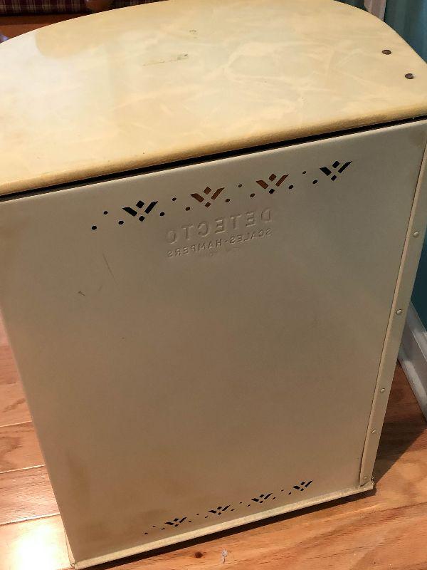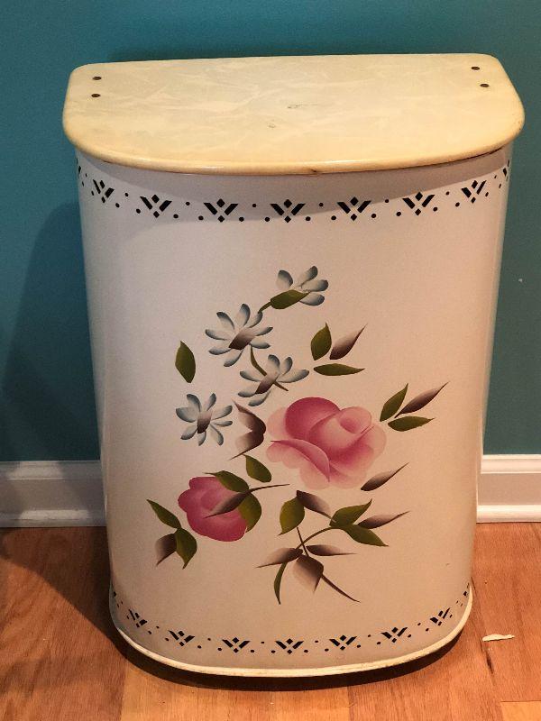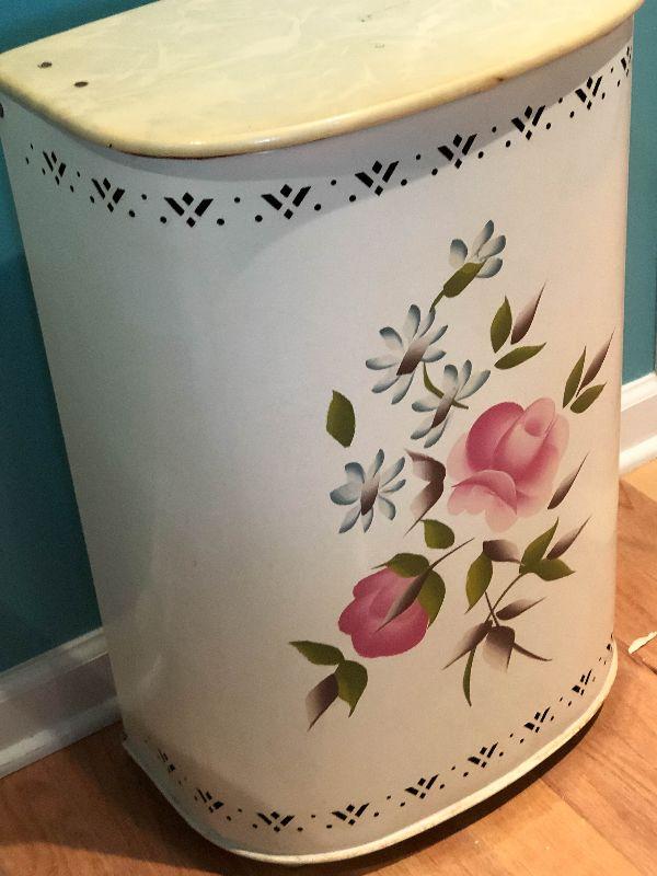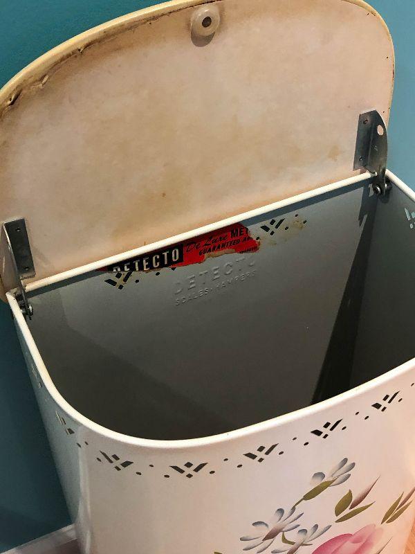 Vintage Detecto metal hamper with flowers on front and a hinged lid.