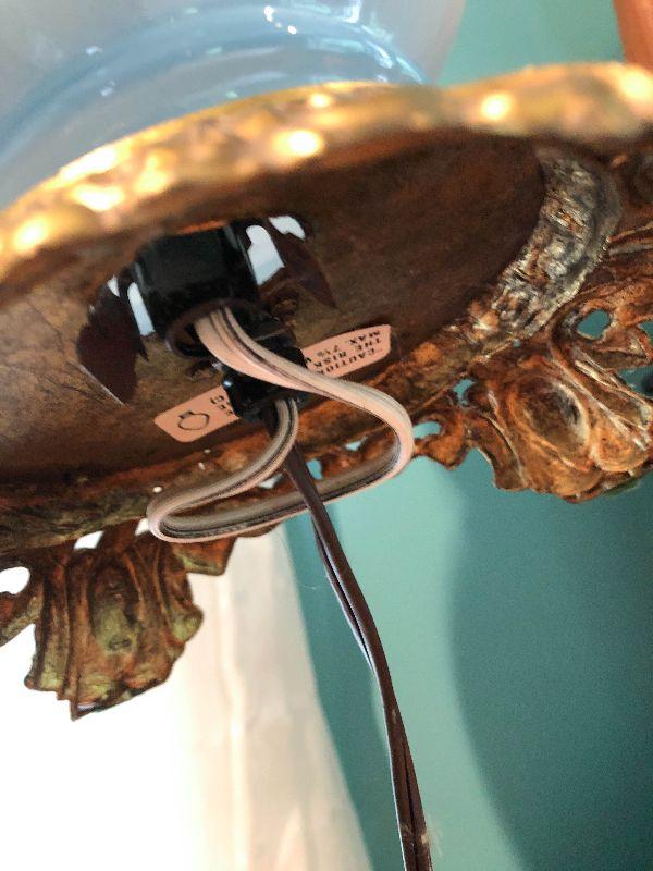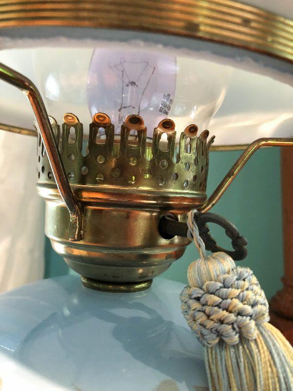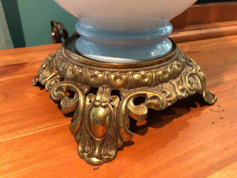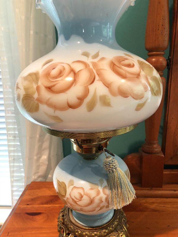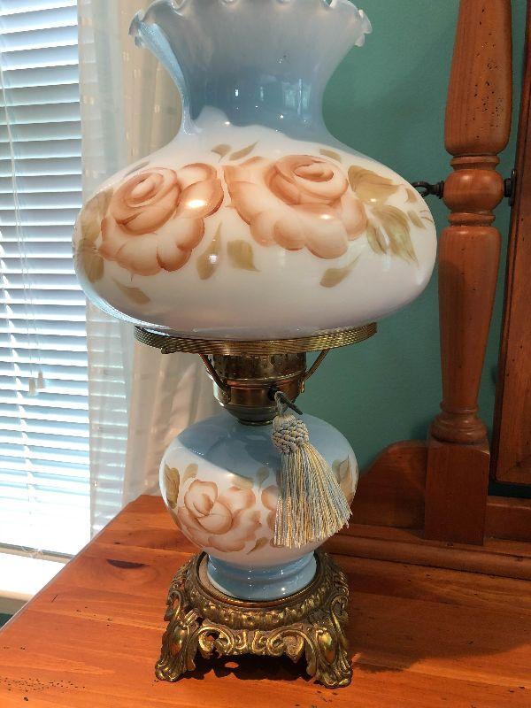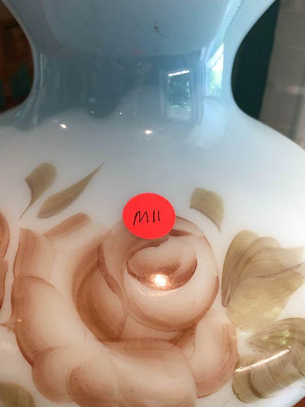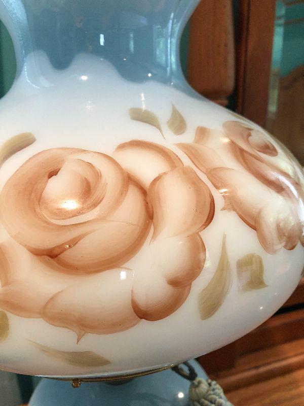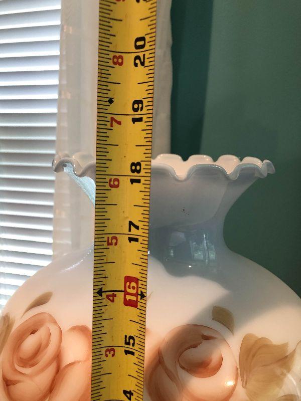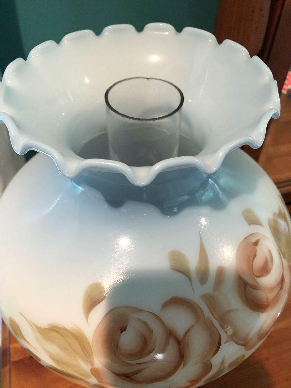 Milk glass hurricane lamp with flowers. Brass base. Untested.