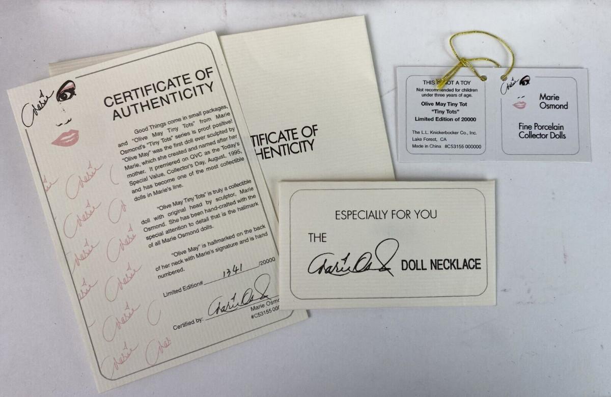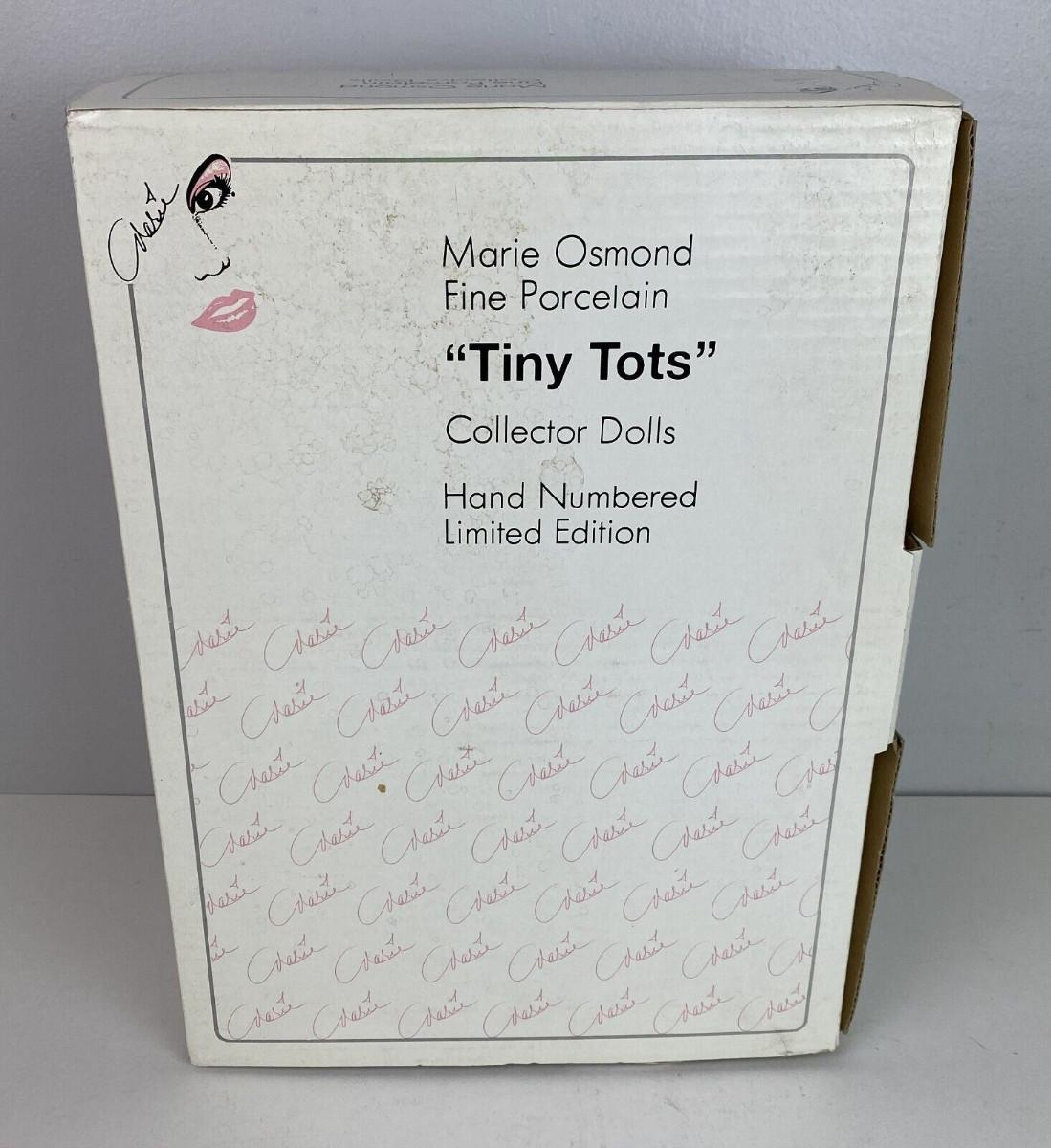 Marie Osmond Fine Porcelain Tiny Tots porcelain dolls..set of four...Hand numbered..Limited edition...Found new in box from a collector's estate...as shown...with COA...Olive May Tiny Tot..Ashley Tiny Tot..Baby Marie Tiny Tot..Baby Alexis Tiny Tot...Hallmarked...in new condition.