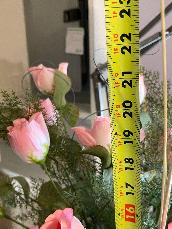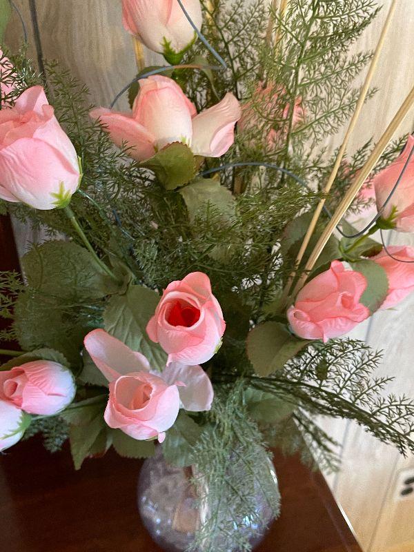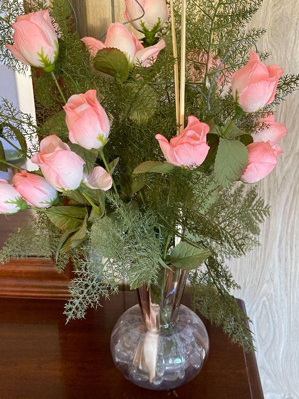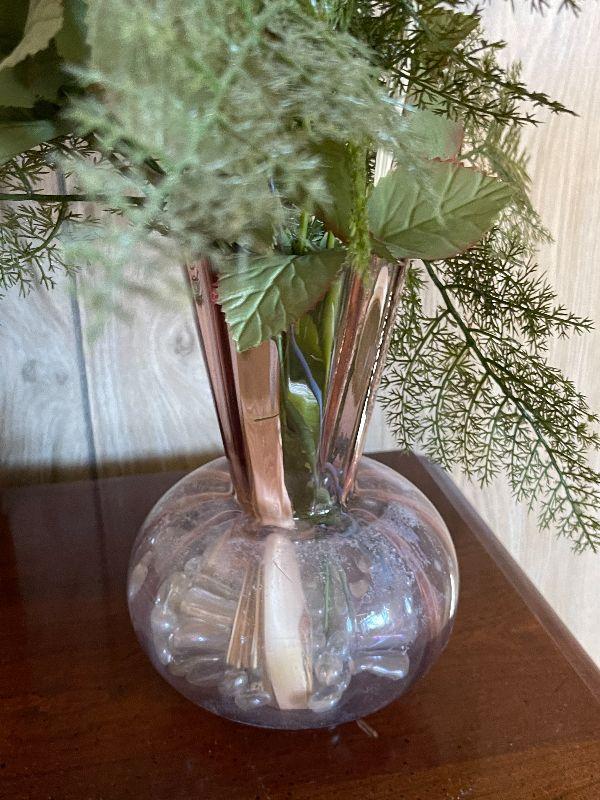M139: Faux Flowers in a Pink Depression Glass Vase