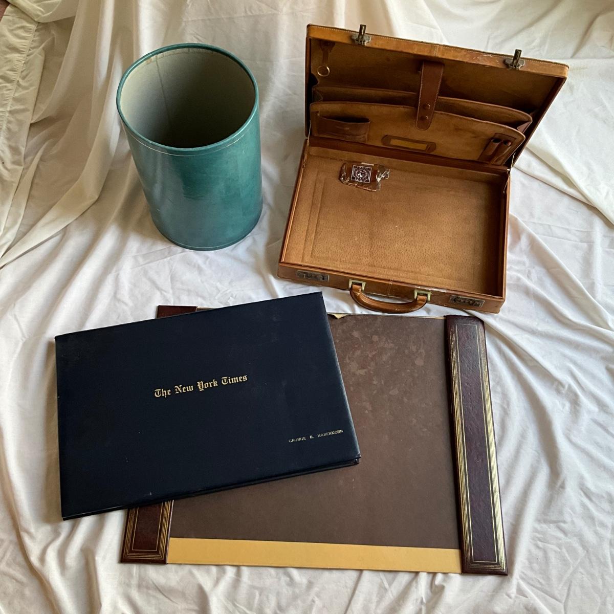NYT in leather cover with desk mat, leather trash can and leather briefcase