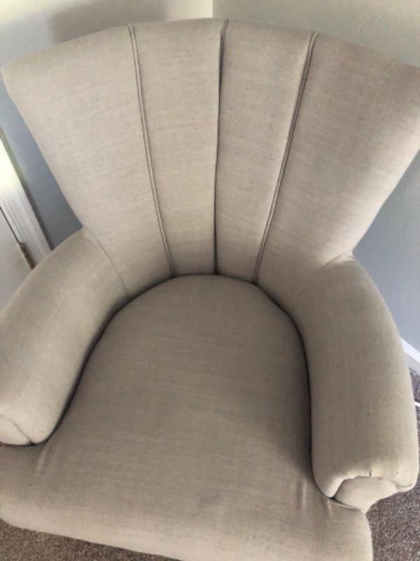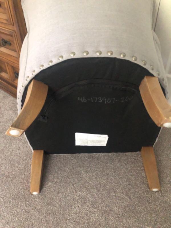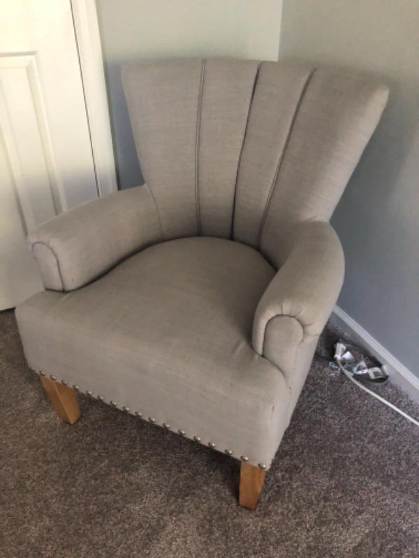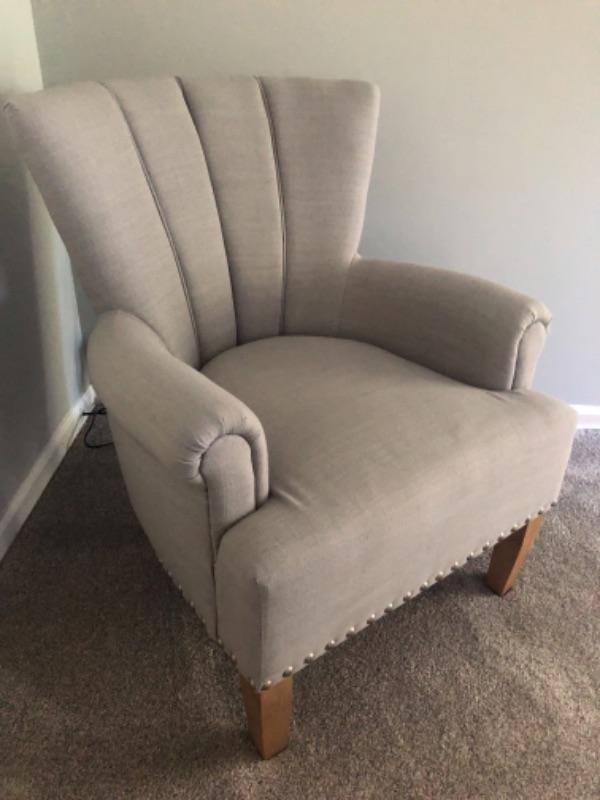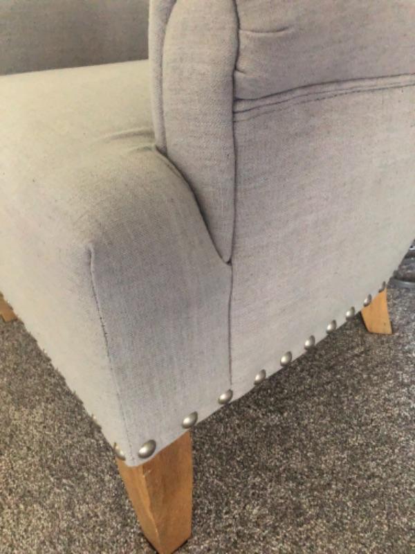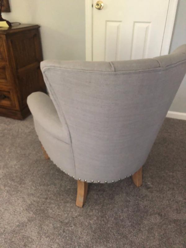 The photos don’t pick up the light blue of thiis chair. Stylish occasional chair. 28" x 26"