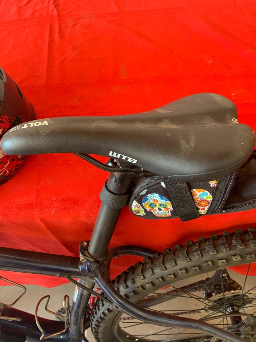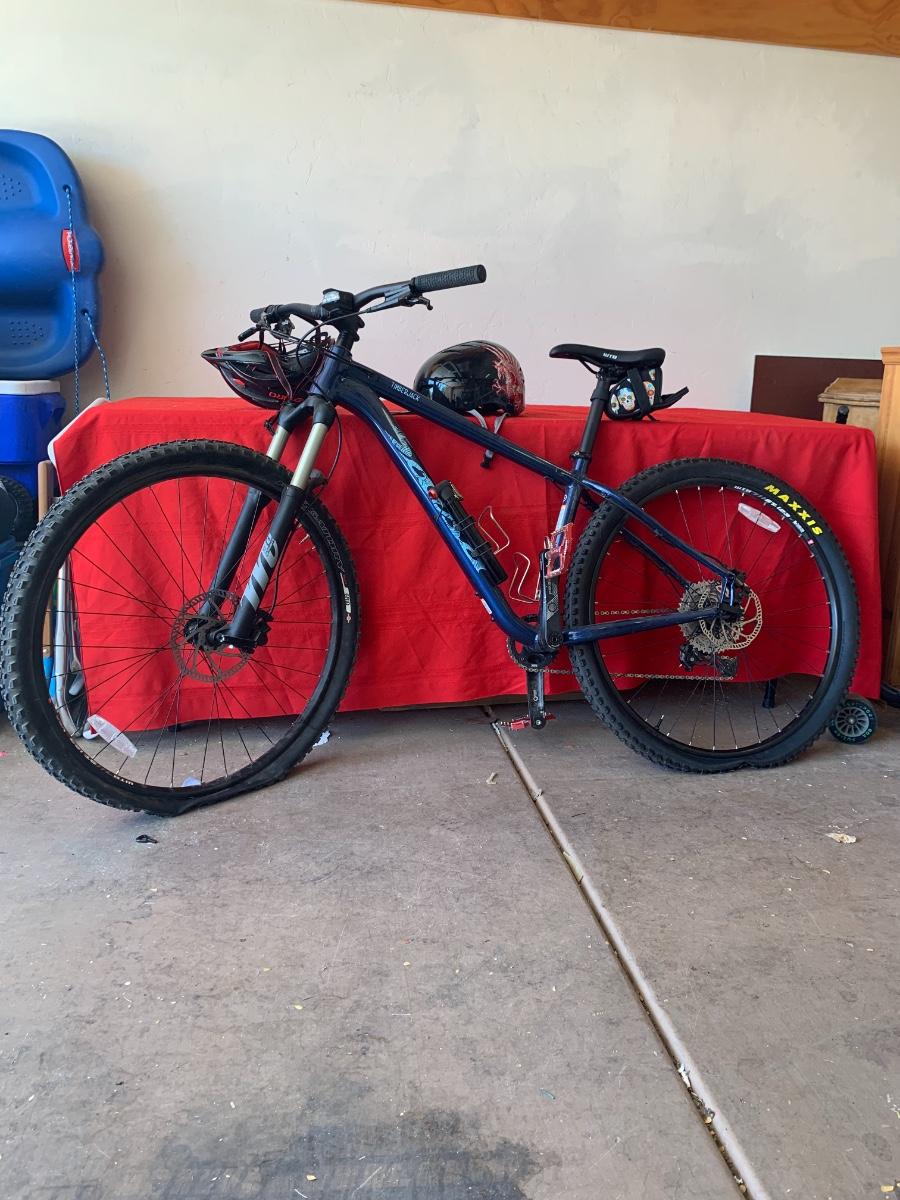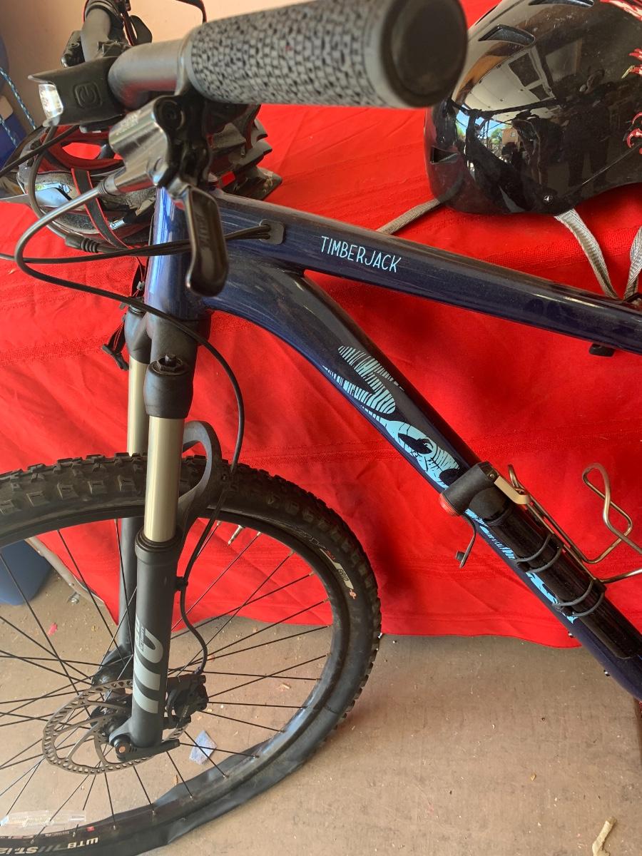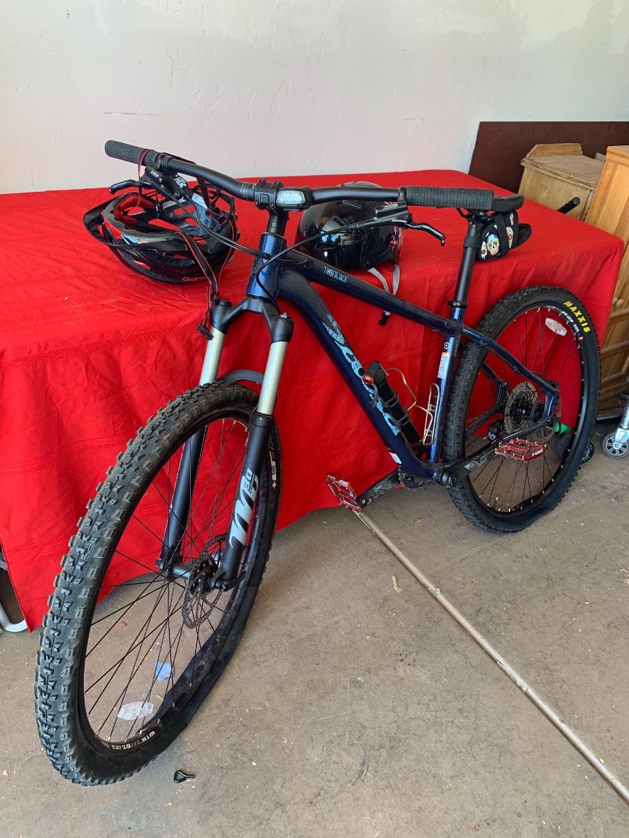 Comes with two helmets and a pump. 29” Mountain Bike. After market seat, pedals, etc.