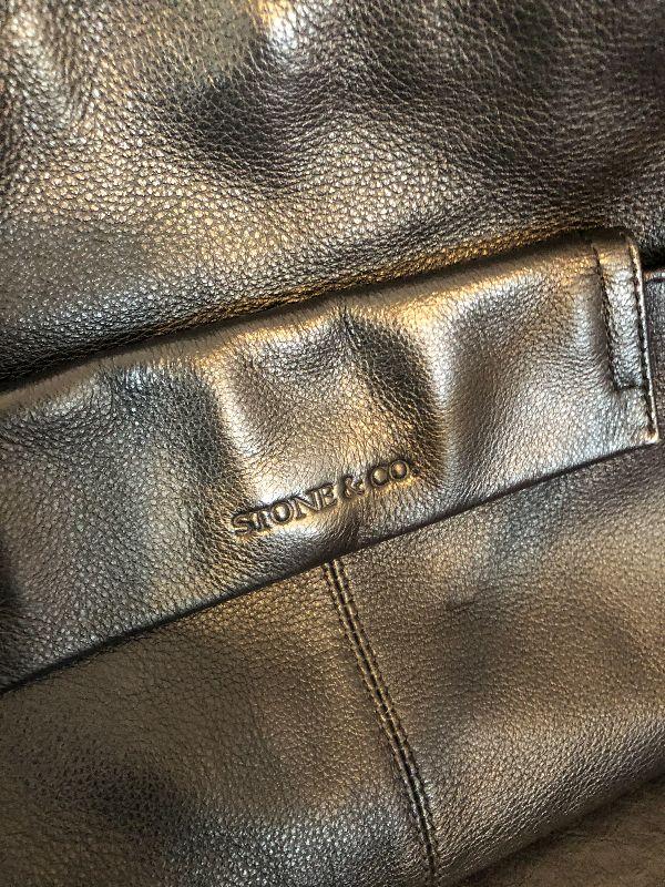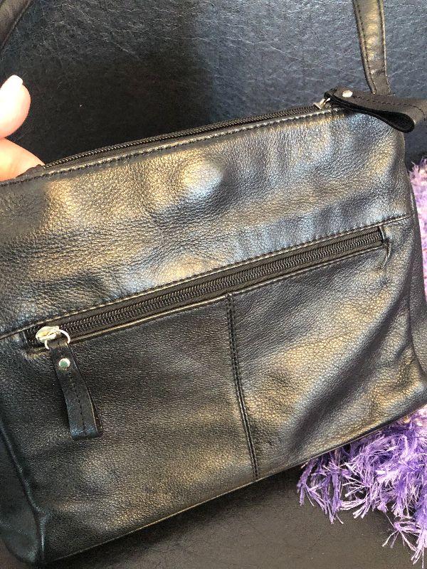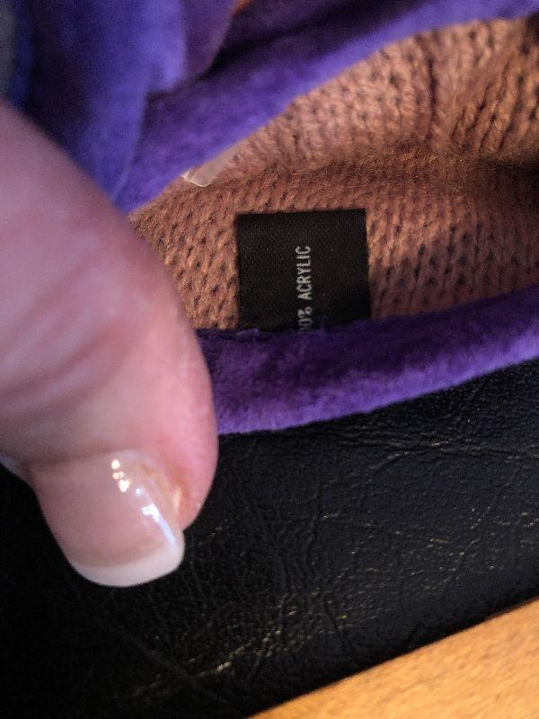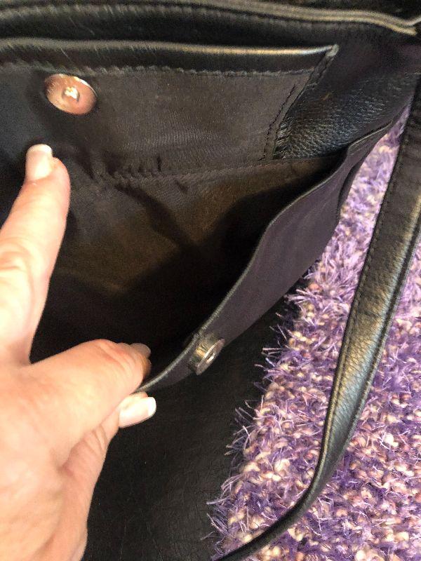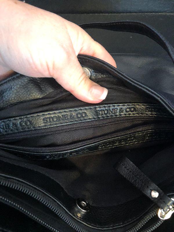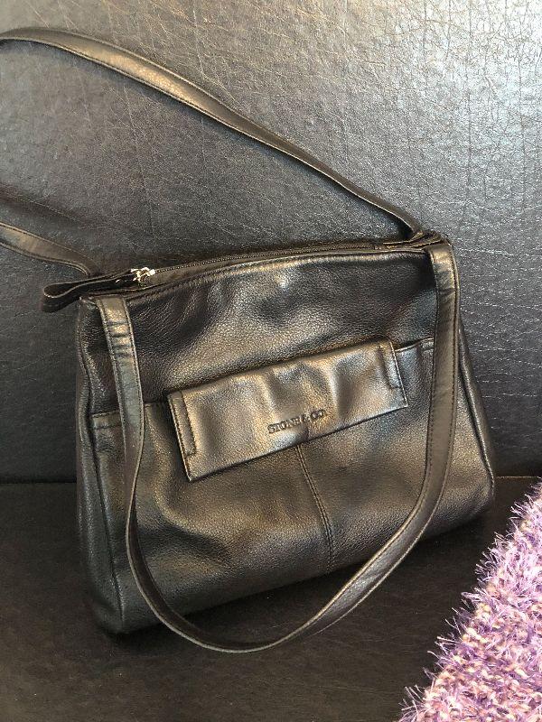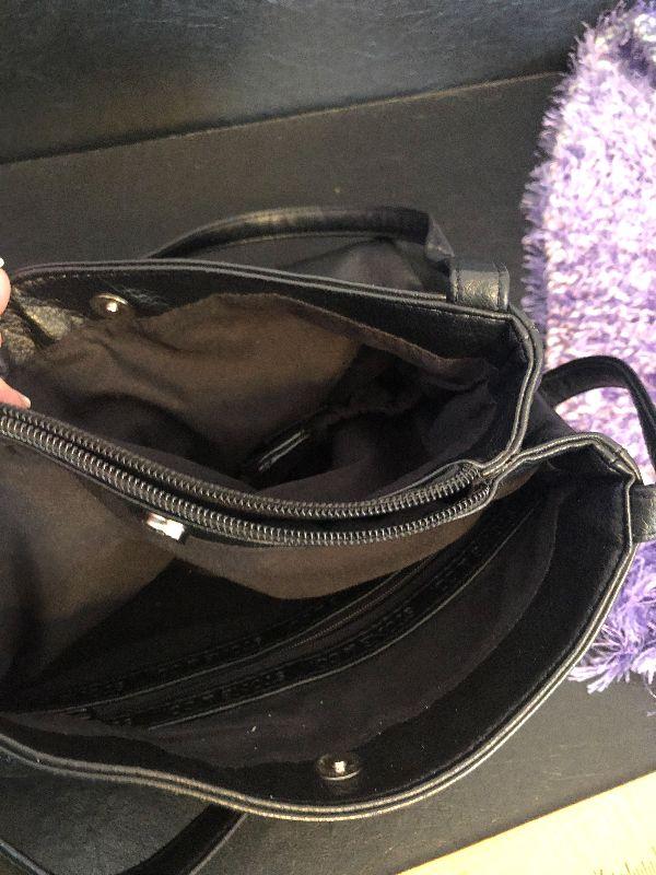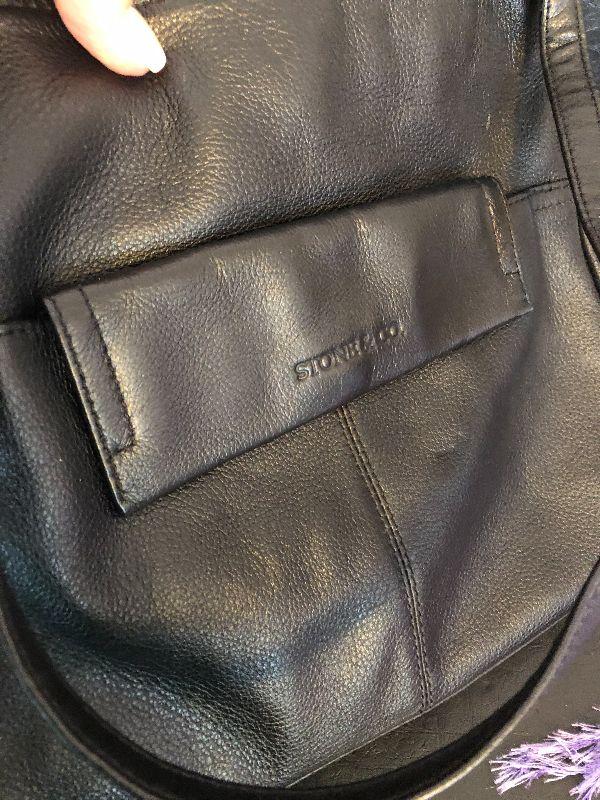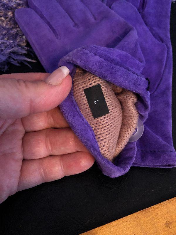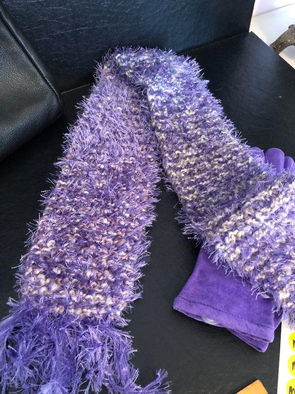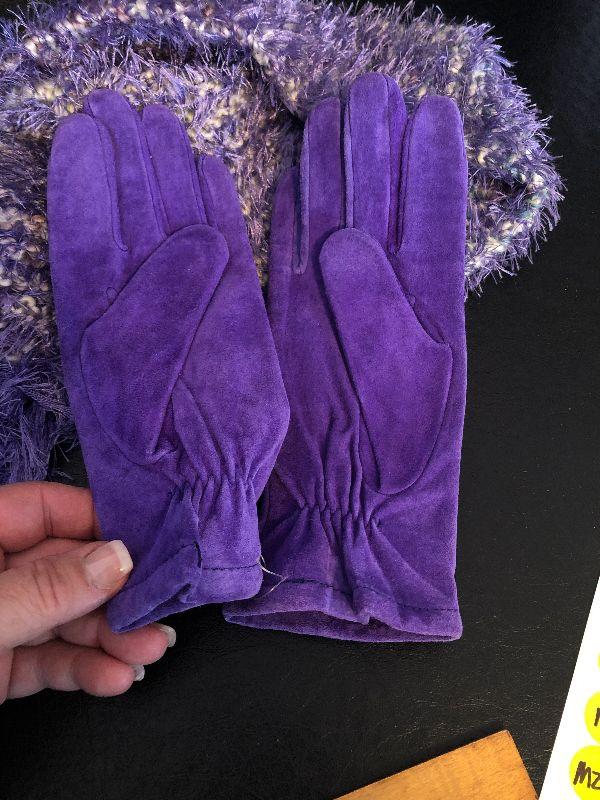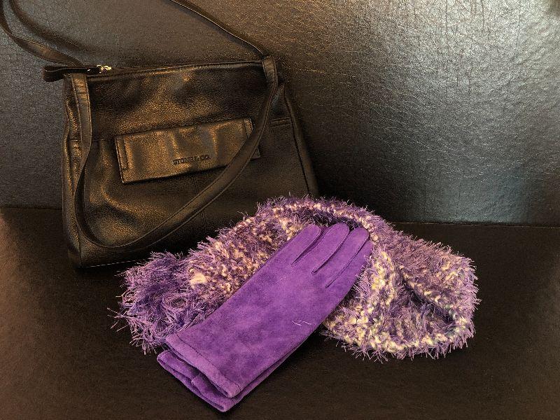 M5: Stone & Co Black Handbag. Purple Leather Gloves size L and Purple Scarf.
