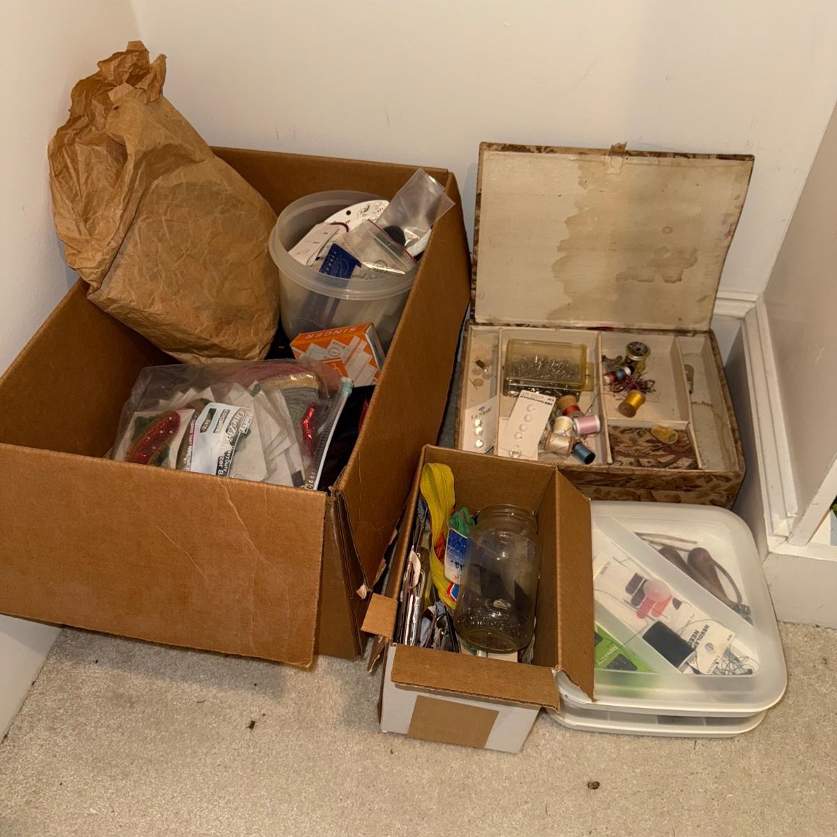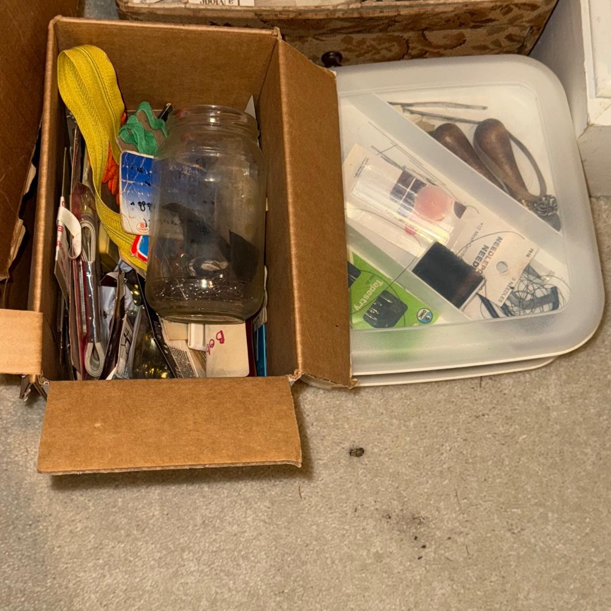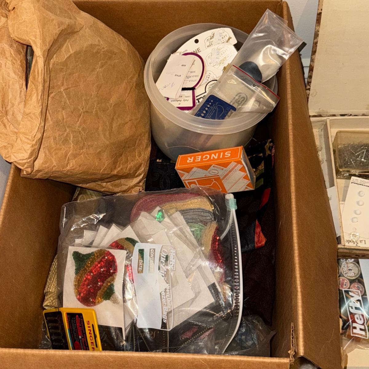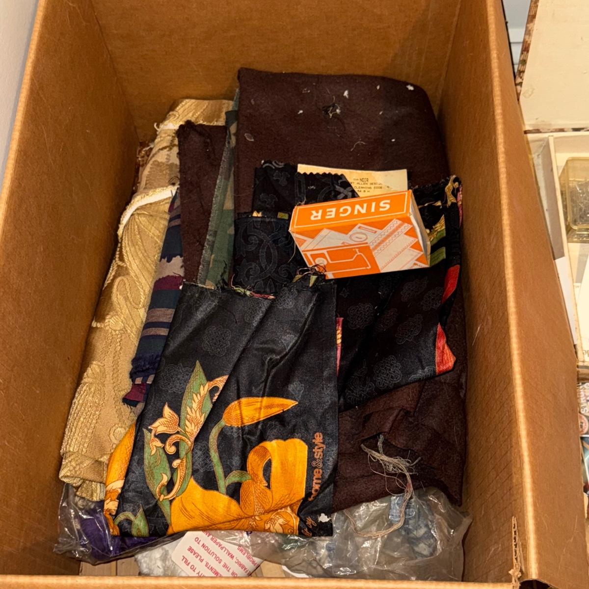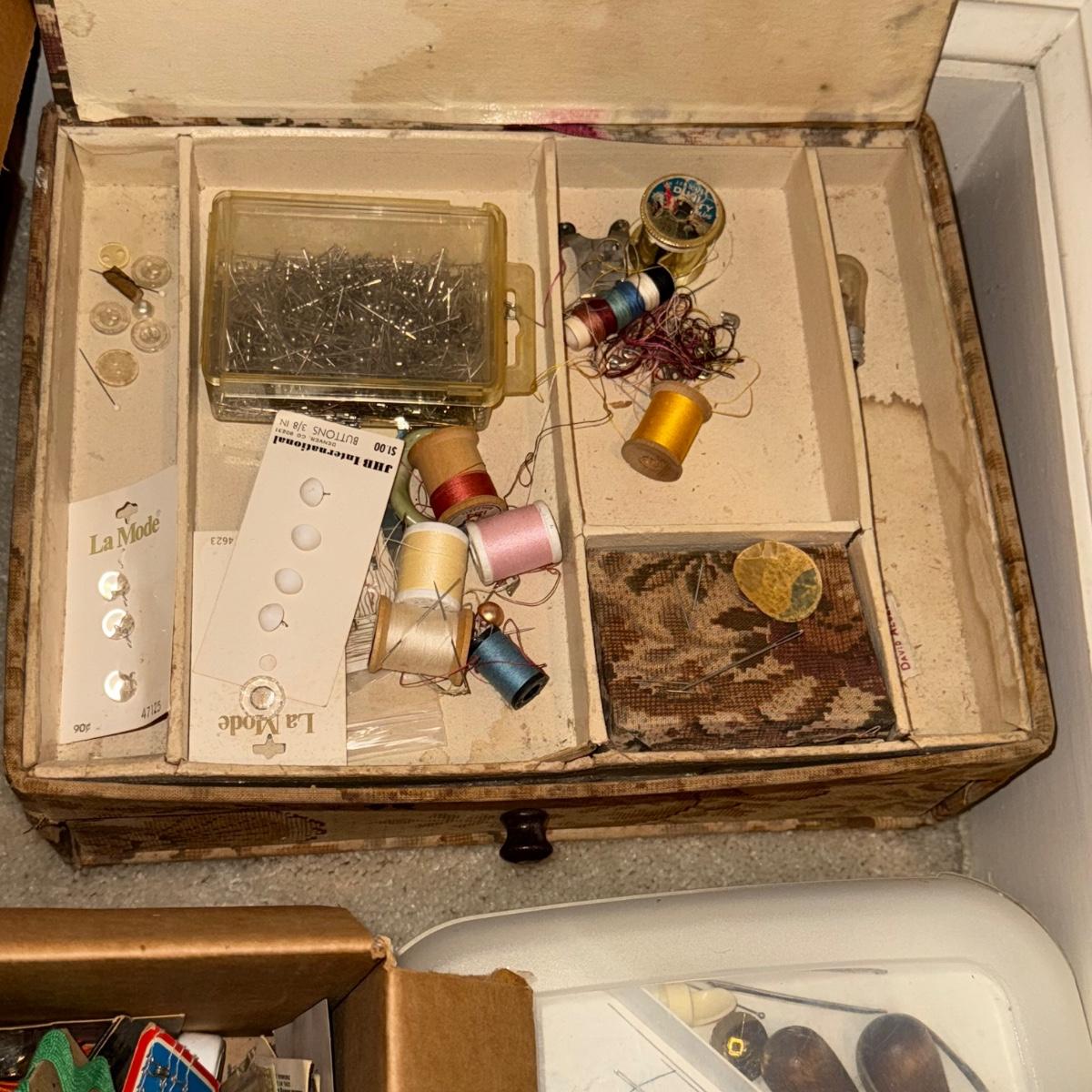 Comes with small sewing box and smaller bags with different types of fabrics and sewing threads ,materials, etc.
