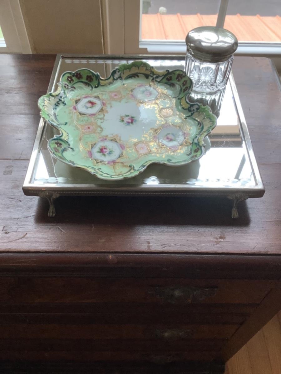 M750 Mirrored Tray with Handpainted Scalloped Dish and Dresser Jar