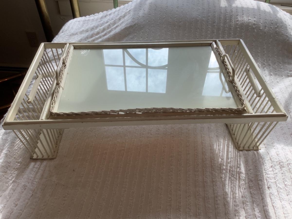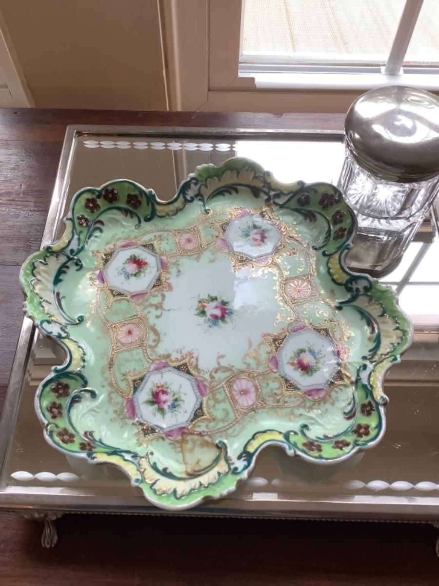 Footed Mirror Vanity Tray with Handpainted scalloped edge tray with dresser jar