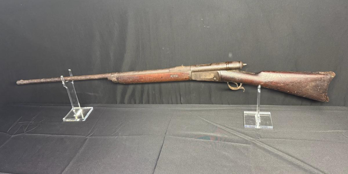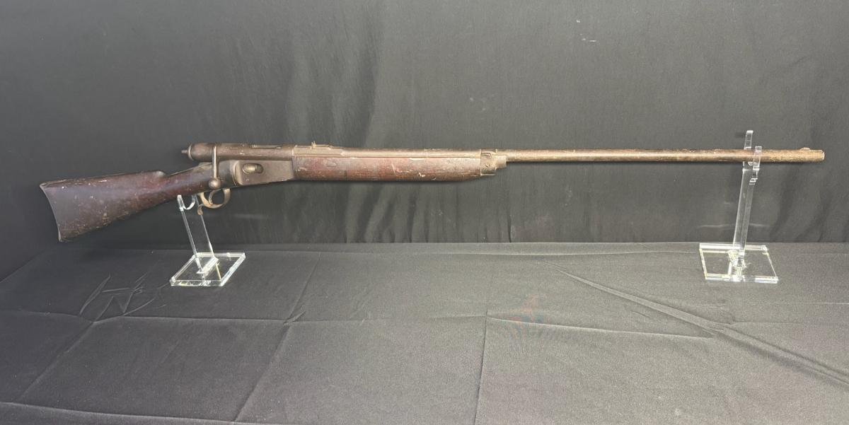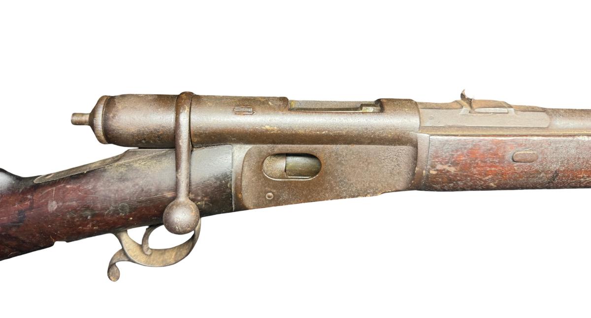 The Vetterli rifle is a rifle designed in Switzerland for the Swiss Army. It is arguably the first repeating military bolt action rifle to chamber a metallic cartridge in a usable manner. These rifles were used in service from 1869 until 1889. It has a tubular feed with a bolt action. The Waffenfabrik Bern uses the .41 (10.4x38MMR) rimfire cartridge. This rifle appears to have been sportarized to a certain extent. Overall length is 52 inches. Serial number 167435. Not tested. [KD]