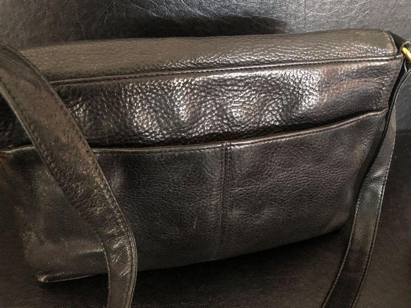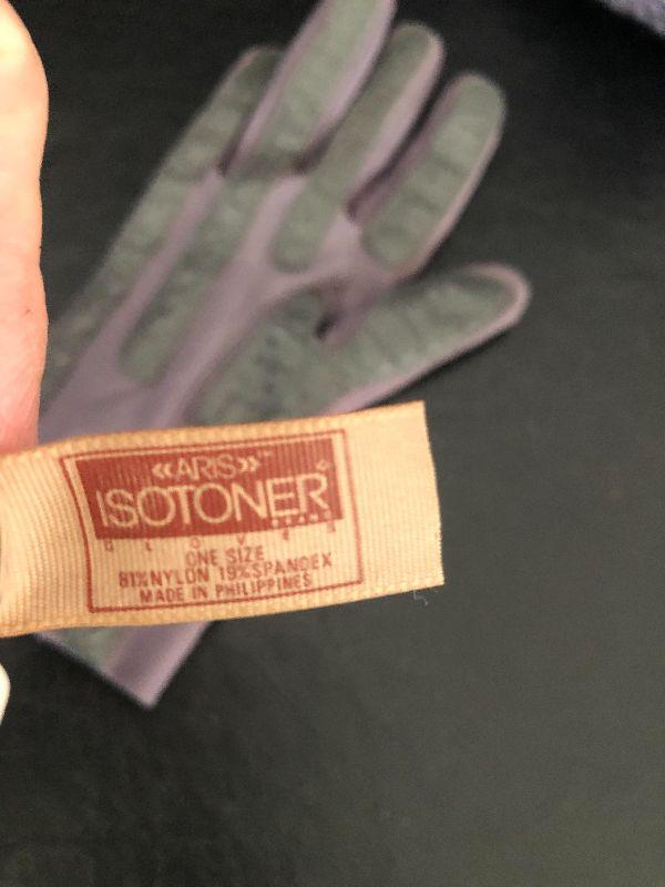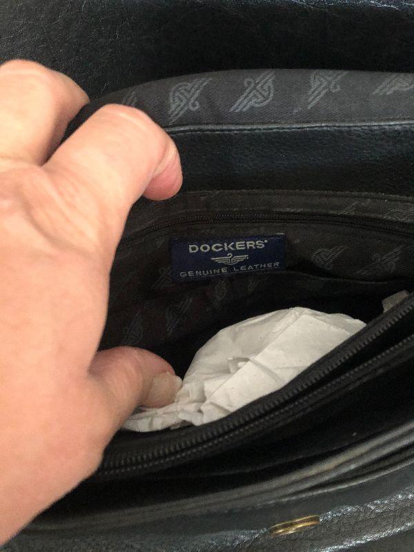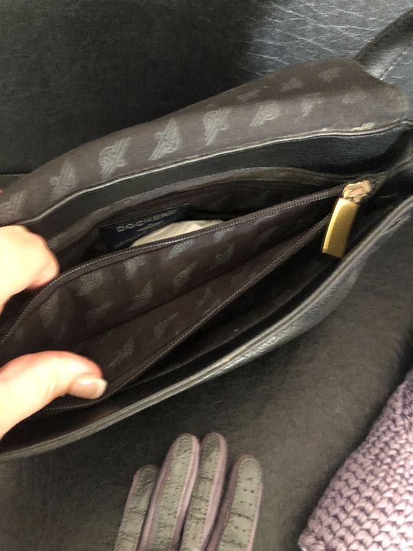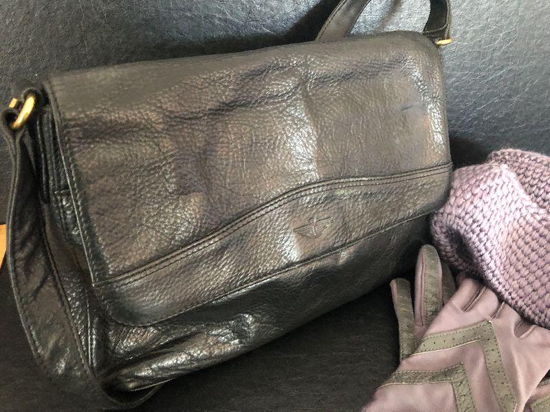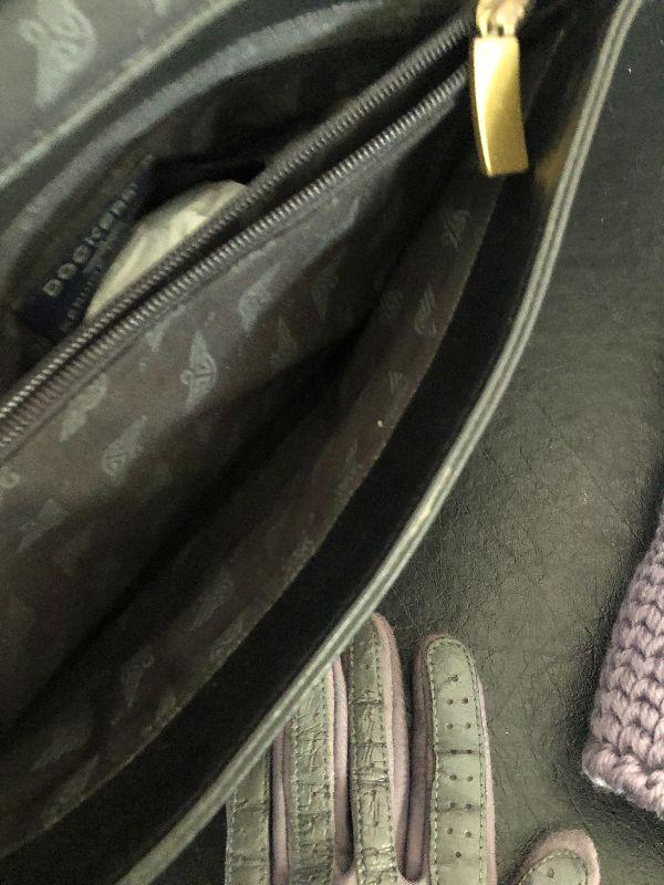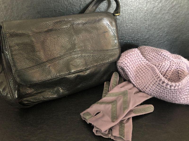 M909: Black Leather Handbag by Dockers. Isotoner Gloves and Knit Purple hat