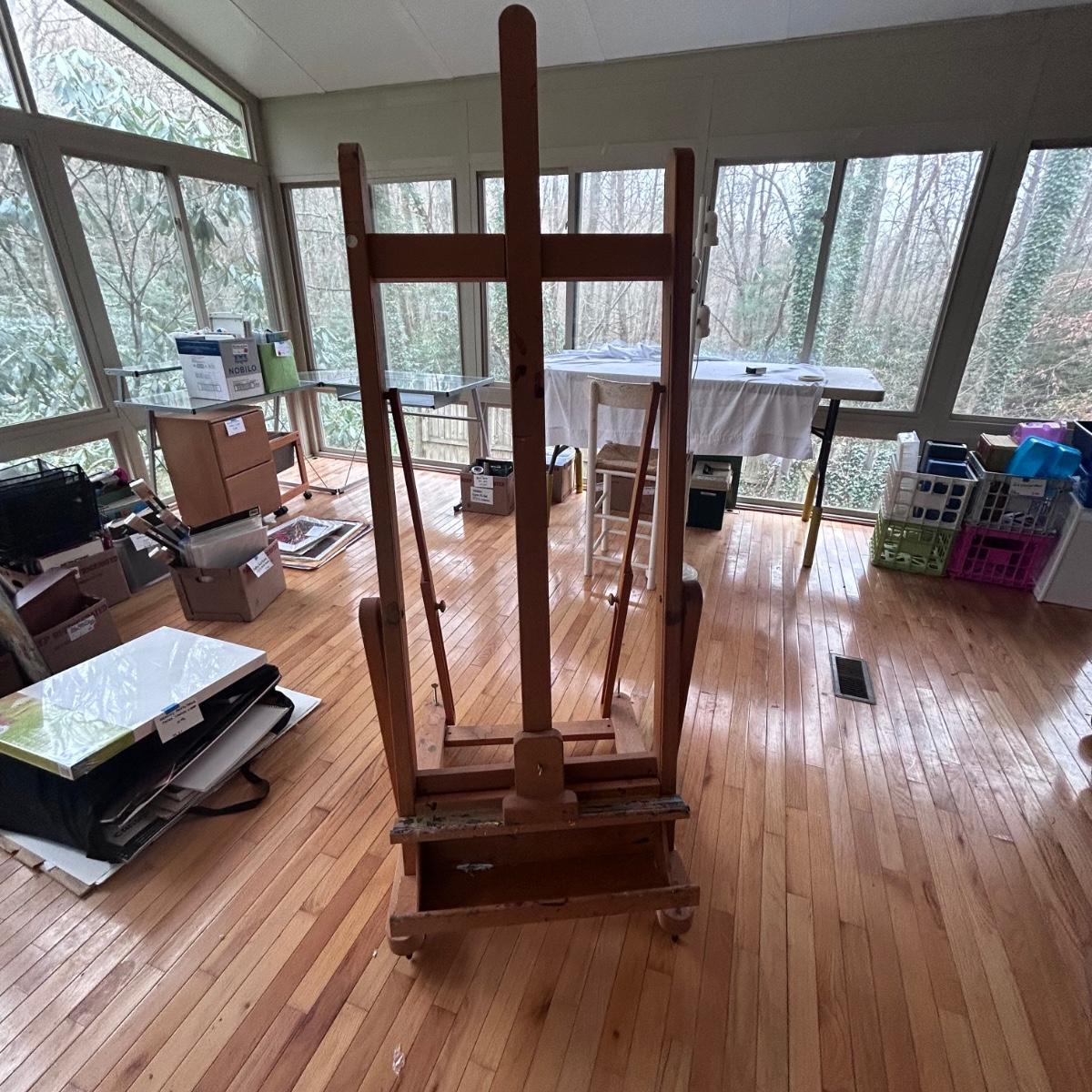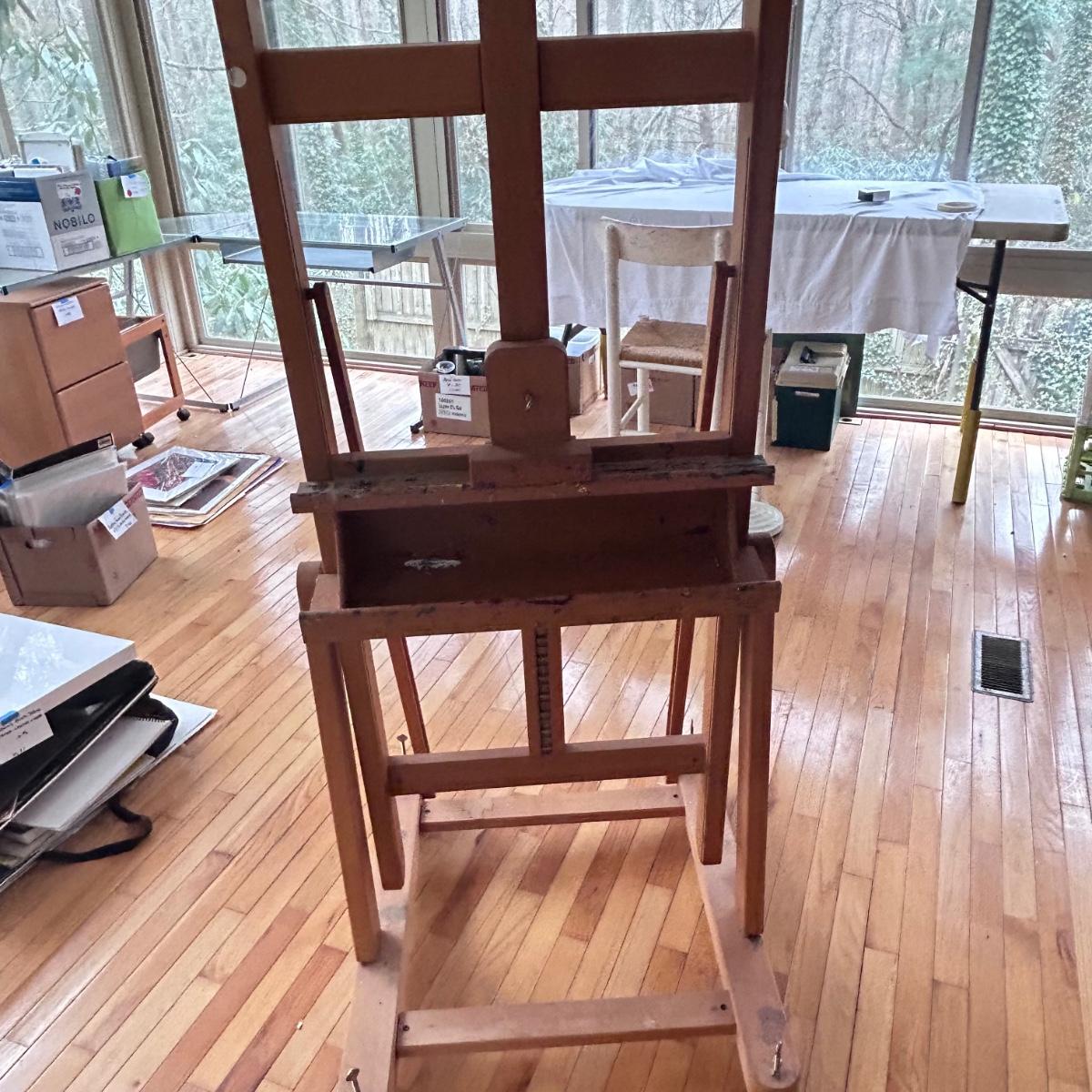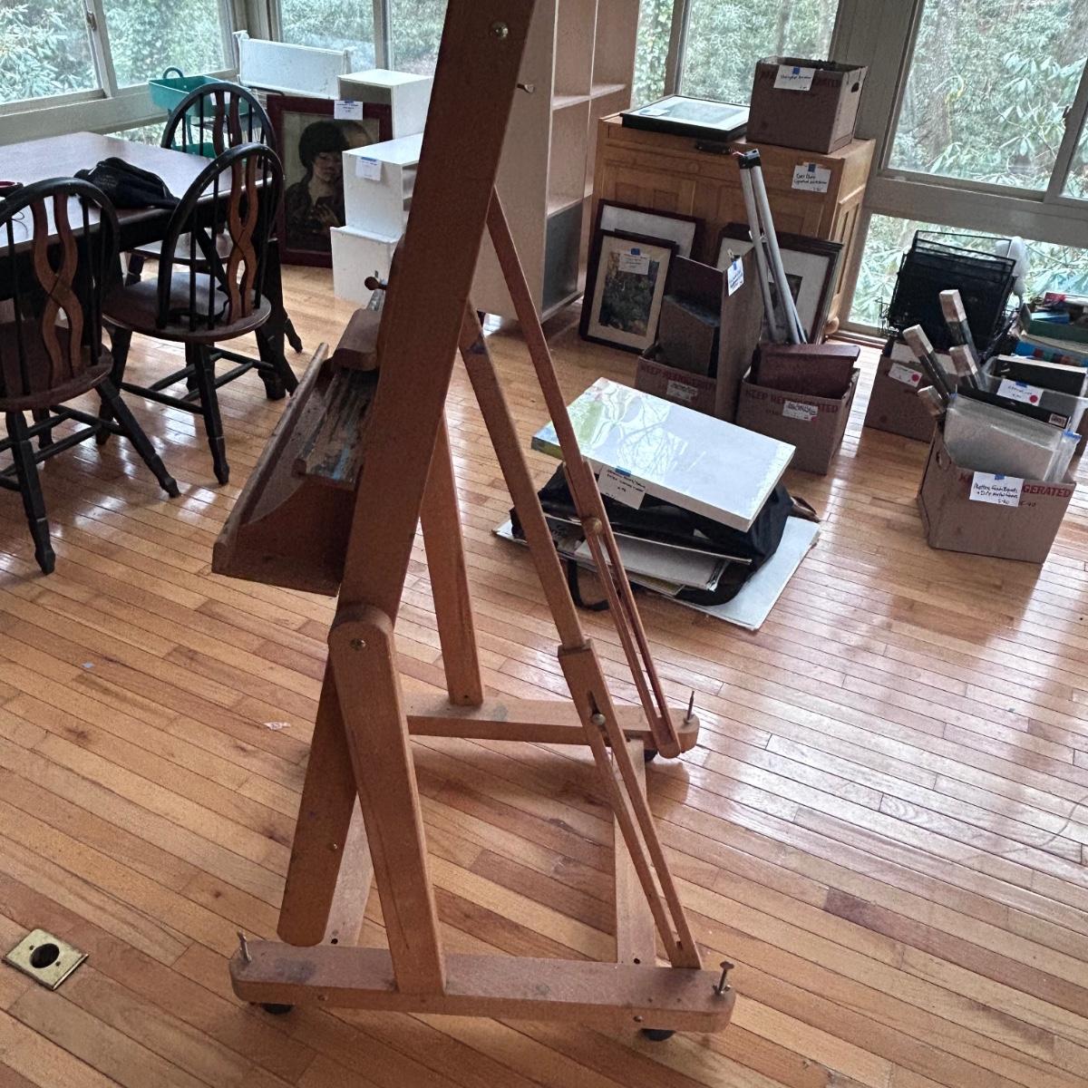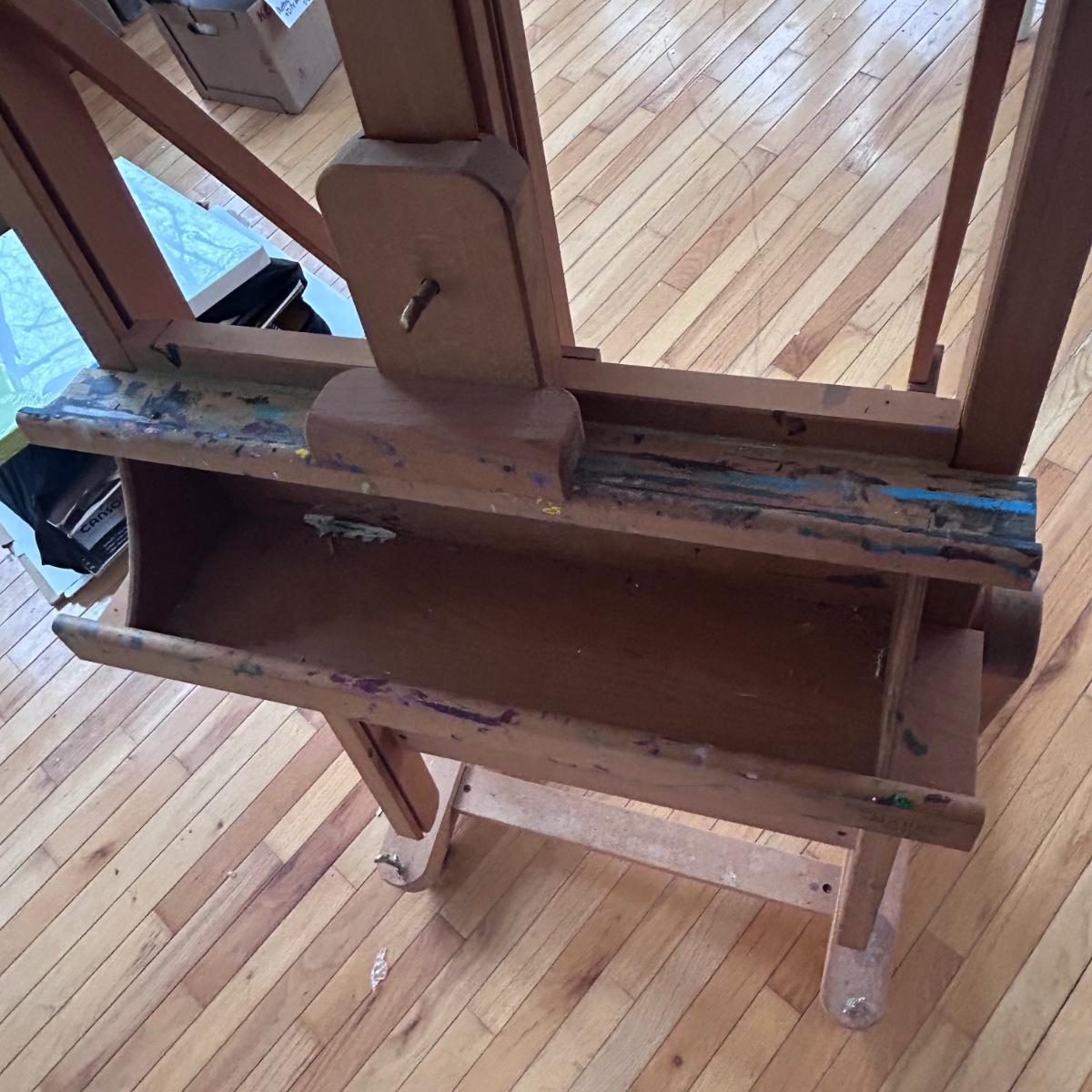 This Mabef Studio Easel has all the adjustment hardware and is on wheels. There is paint from regular use but still has good life left in it. At lowest settings measure 32”x26.5”x69”. Local pick up only.