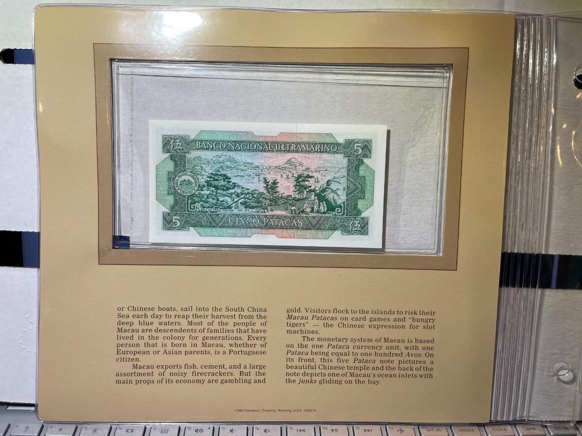 Macau 5 Pataca 1981 Banknote/Currency in Uncirculated Condition by Fleetwood as Pictured.