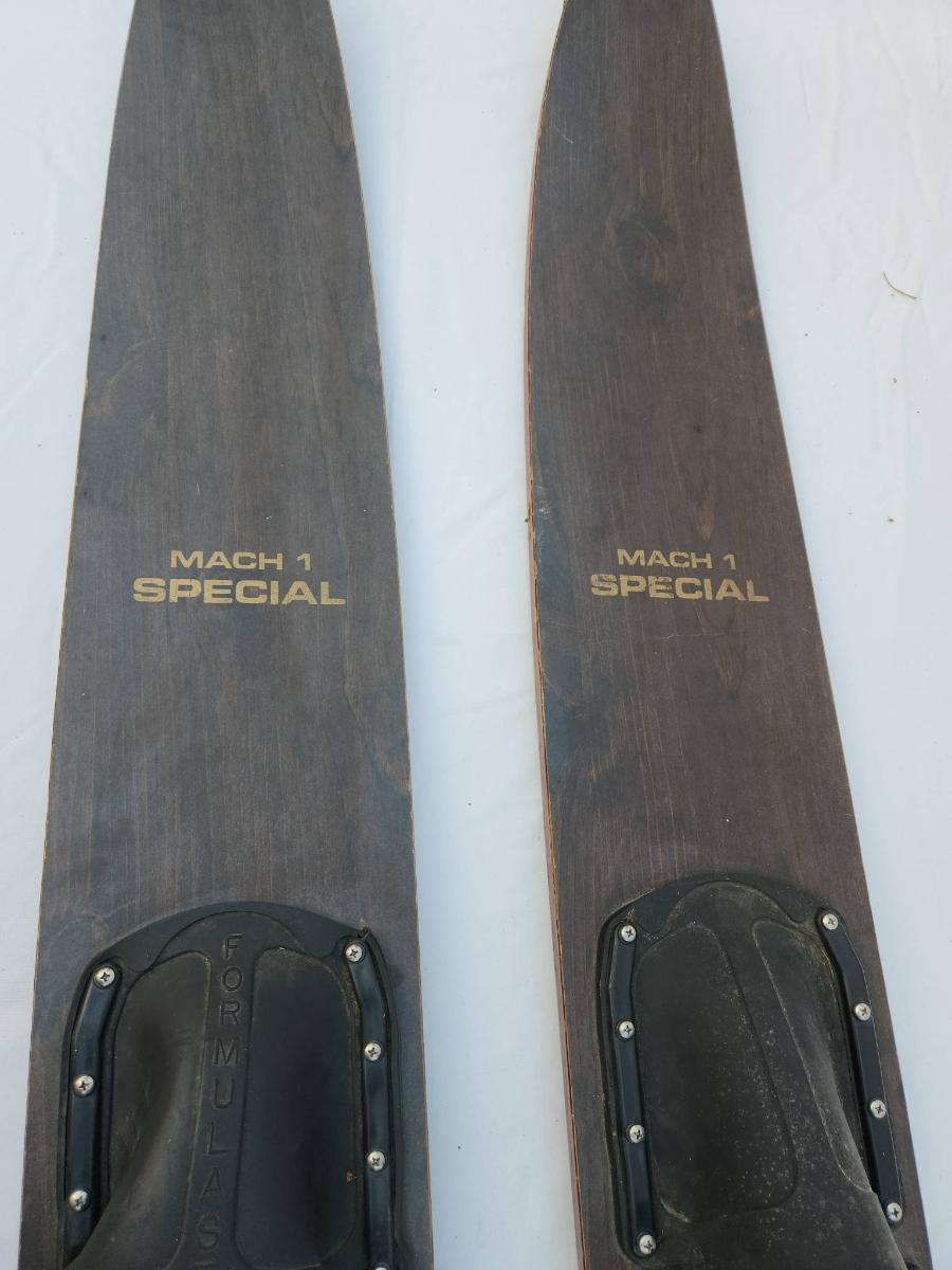 Mach 1 Special wooden water skis featuring original rubber bindings labeled 'FORMULA S.' The skis exhibit a natural wood finish with 'Mach 1 Special' printed on the top. Suitable for water sports enthusiasts and collectors. Condition suggests prior use with possible wear on bindings and wood.