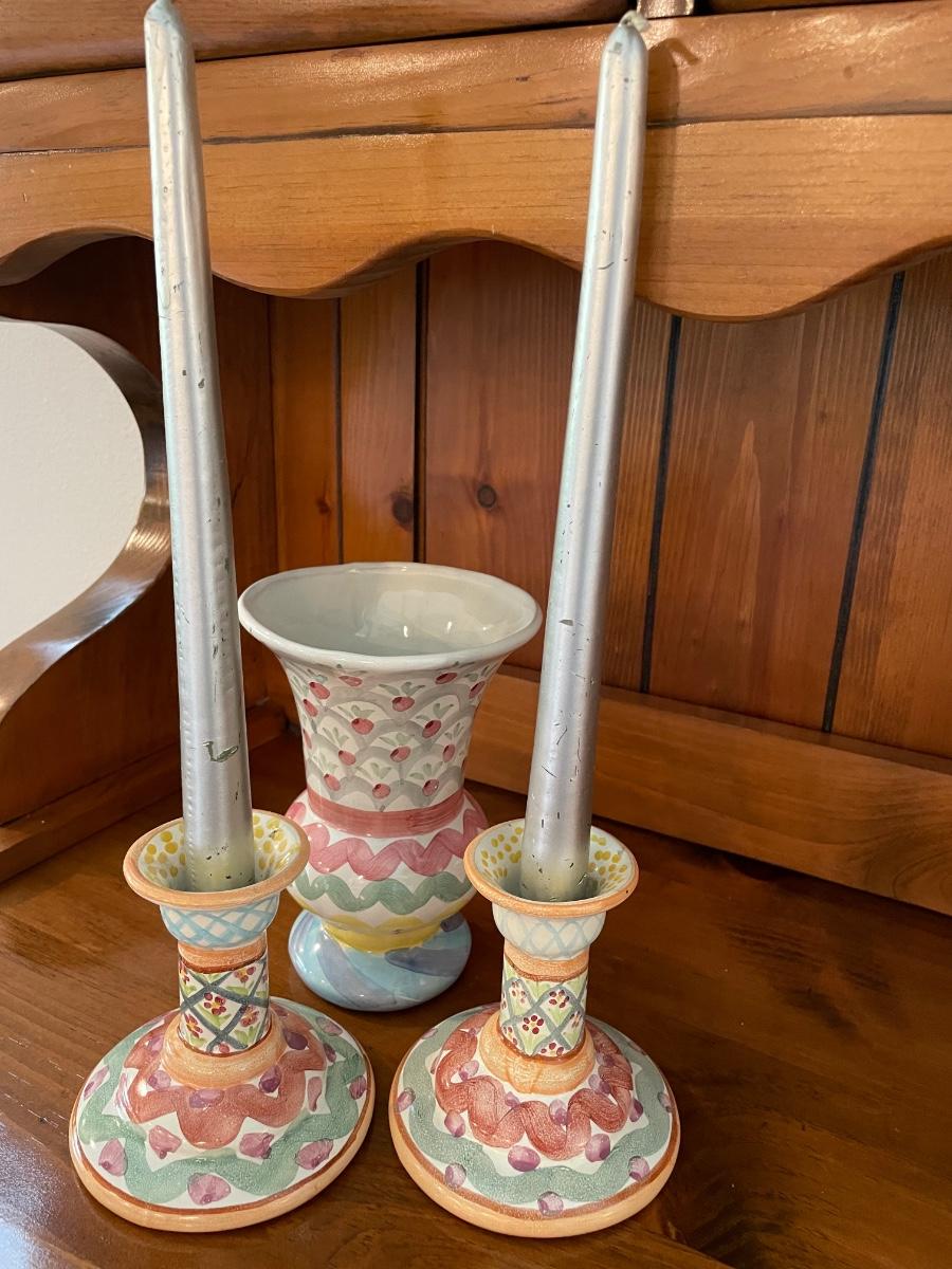 MacKenzie Child’s pair of candle sticks “Heather” pattern measuring approx 4.5" tall and 3.5" in diameter.