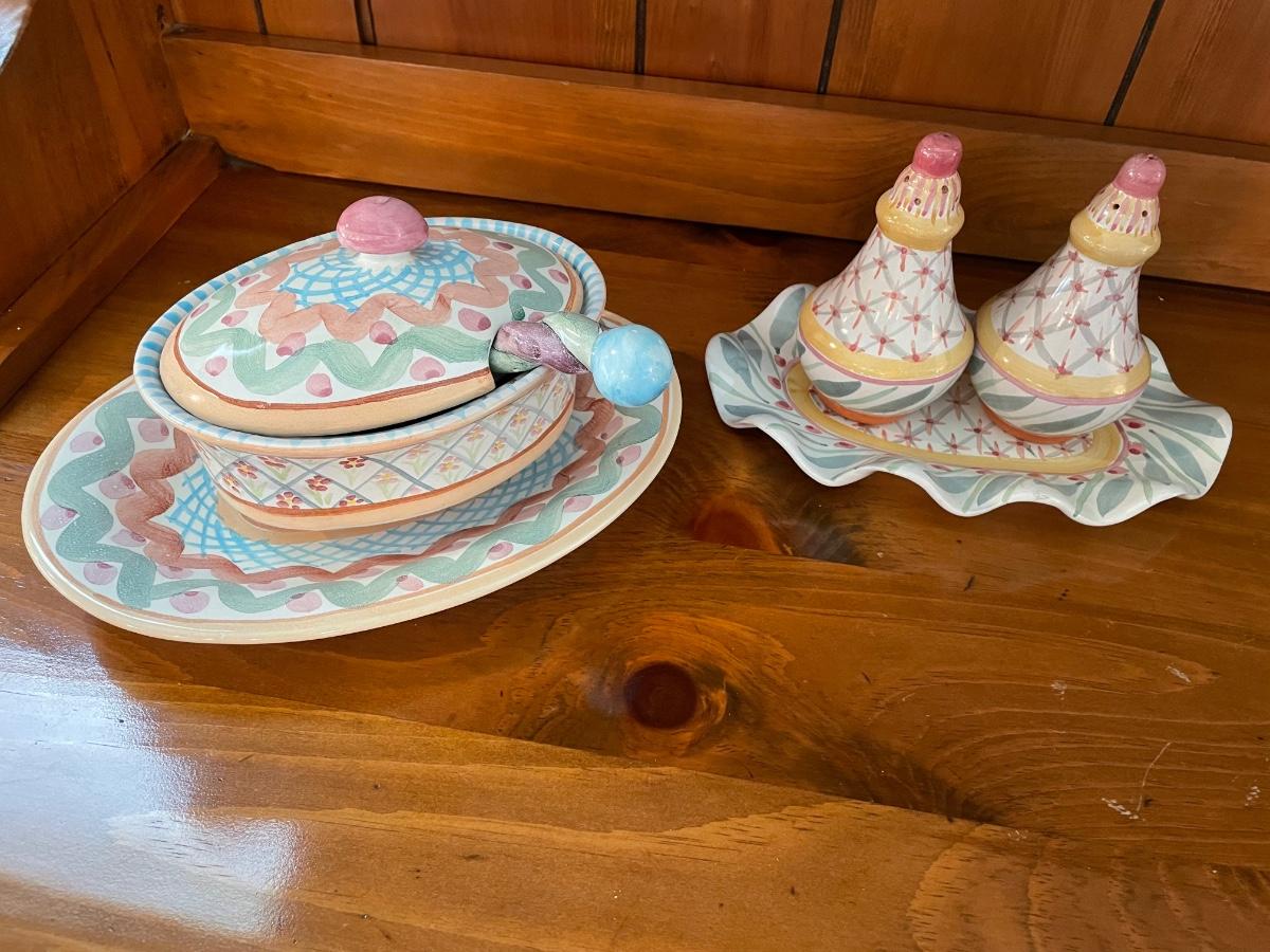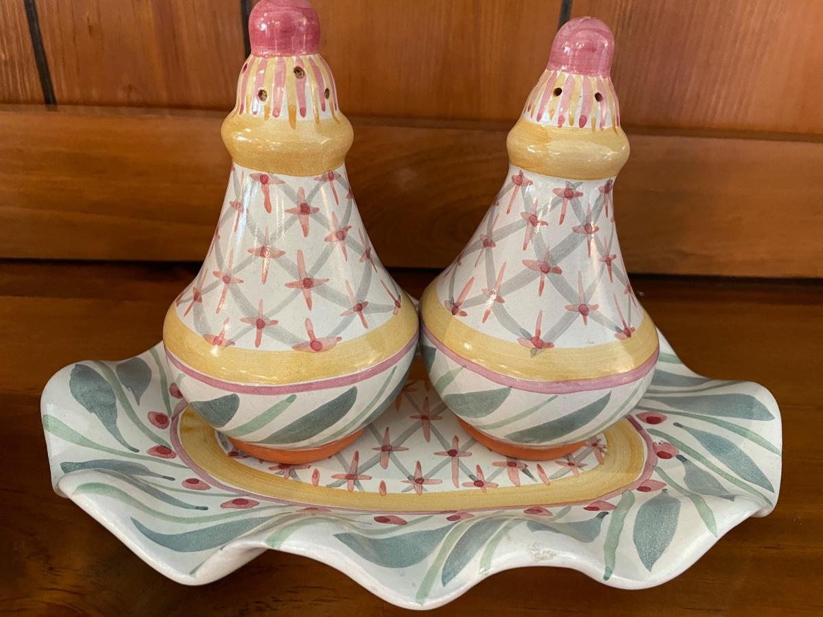Shakers stand approx. 5 1/2 inches high under plate is 9 inches long by 6 inches wide