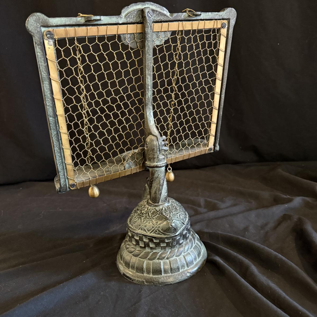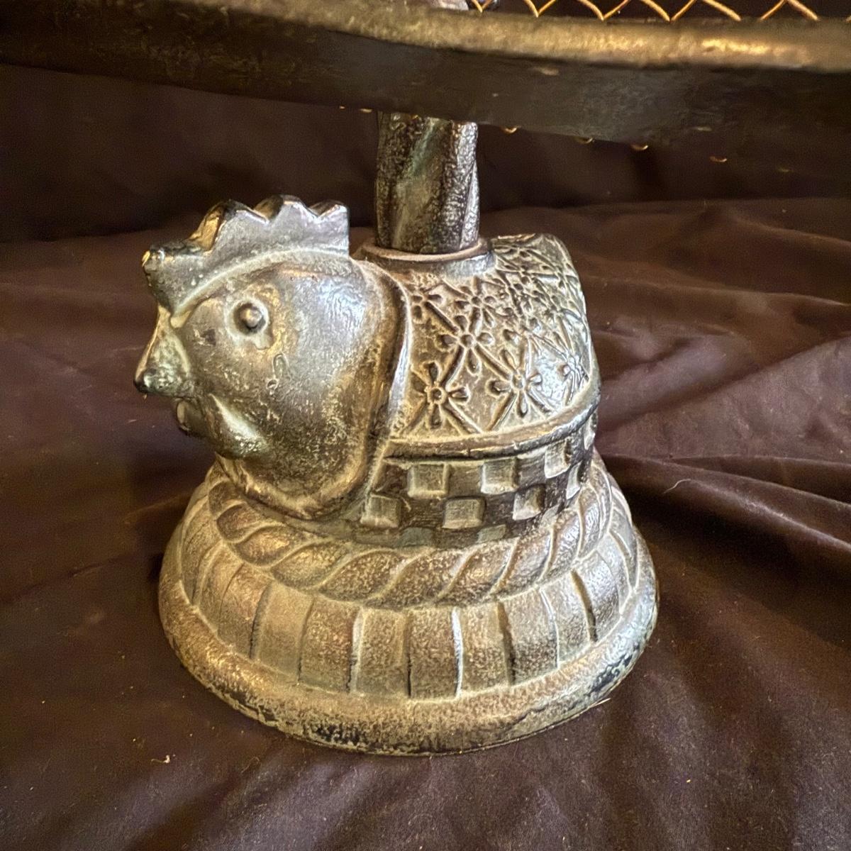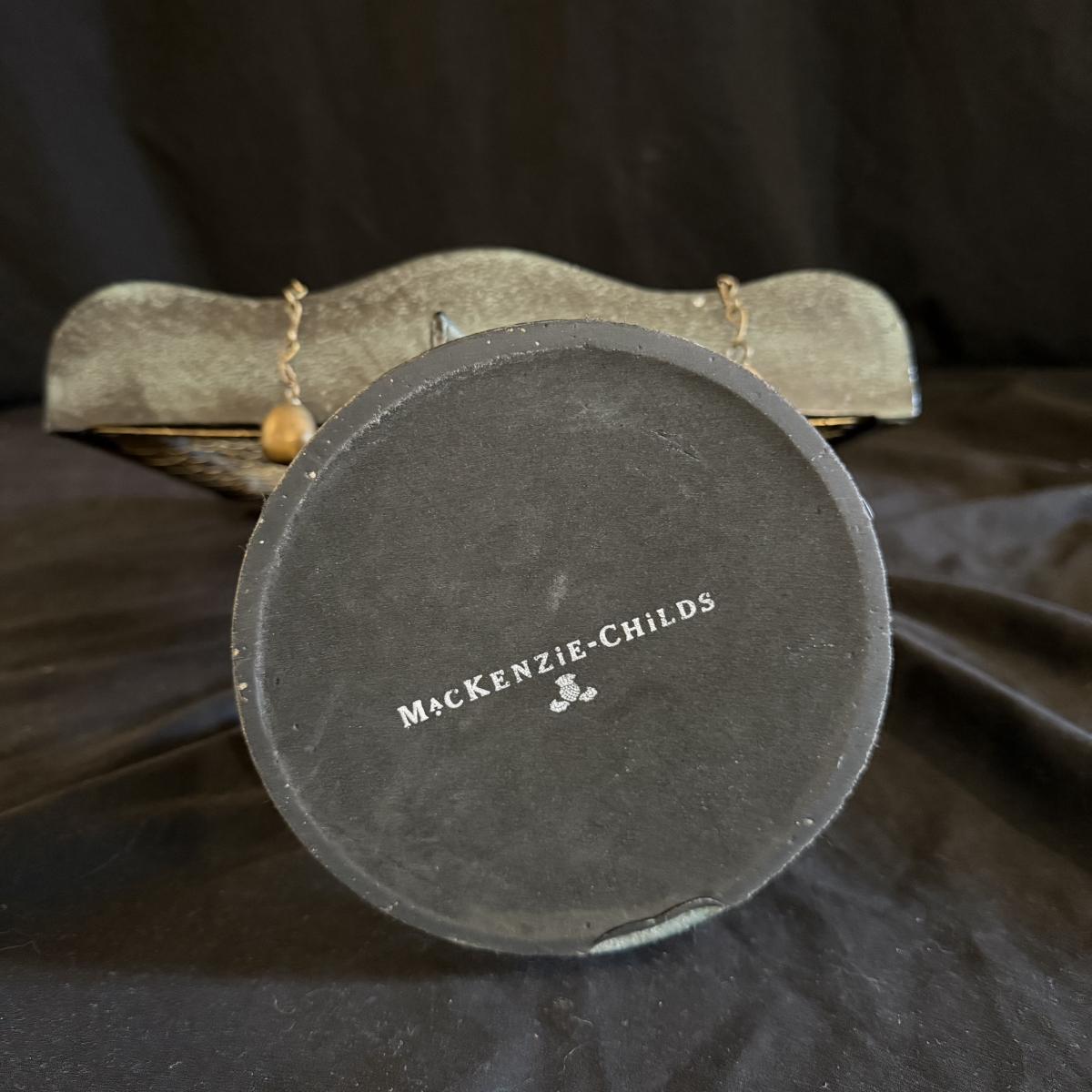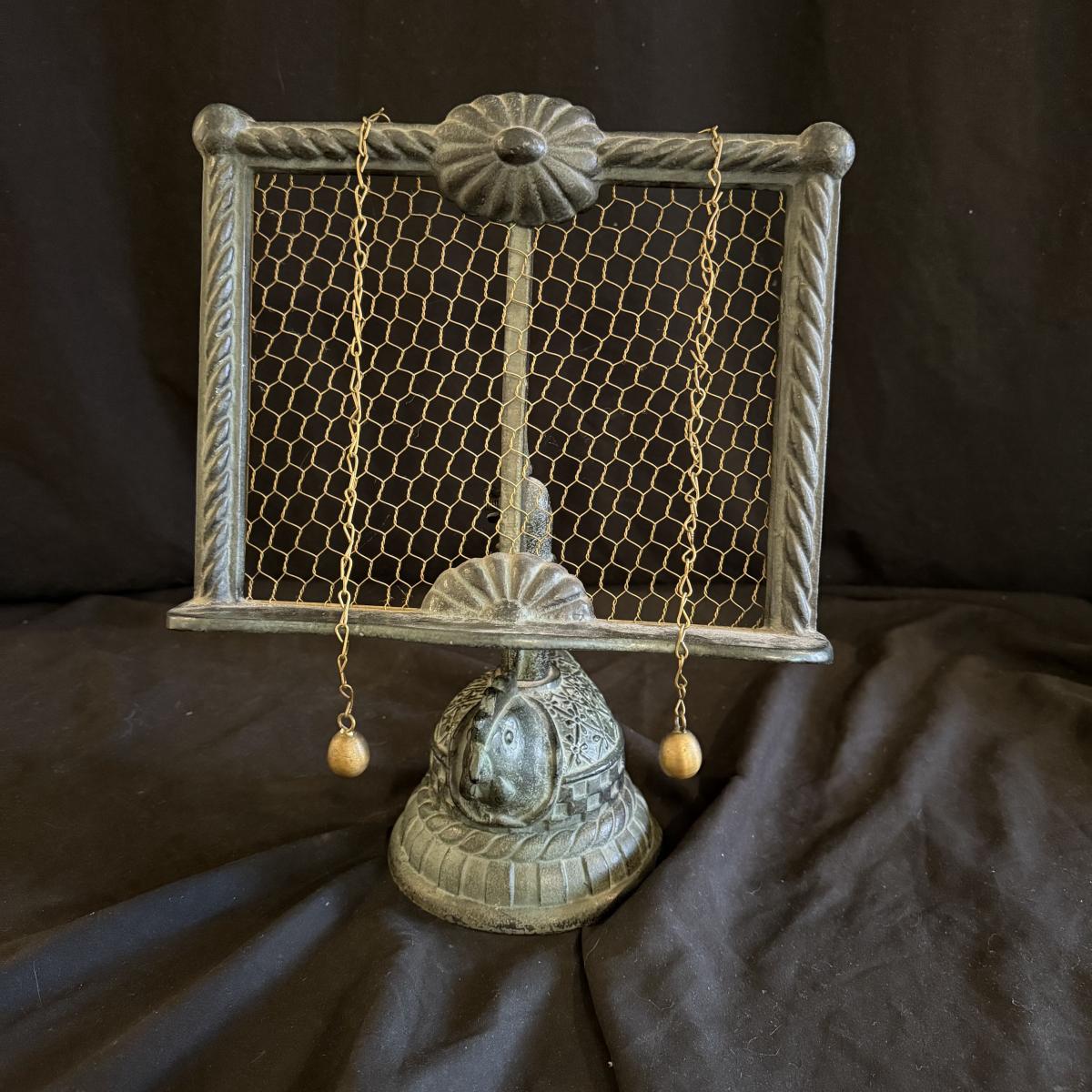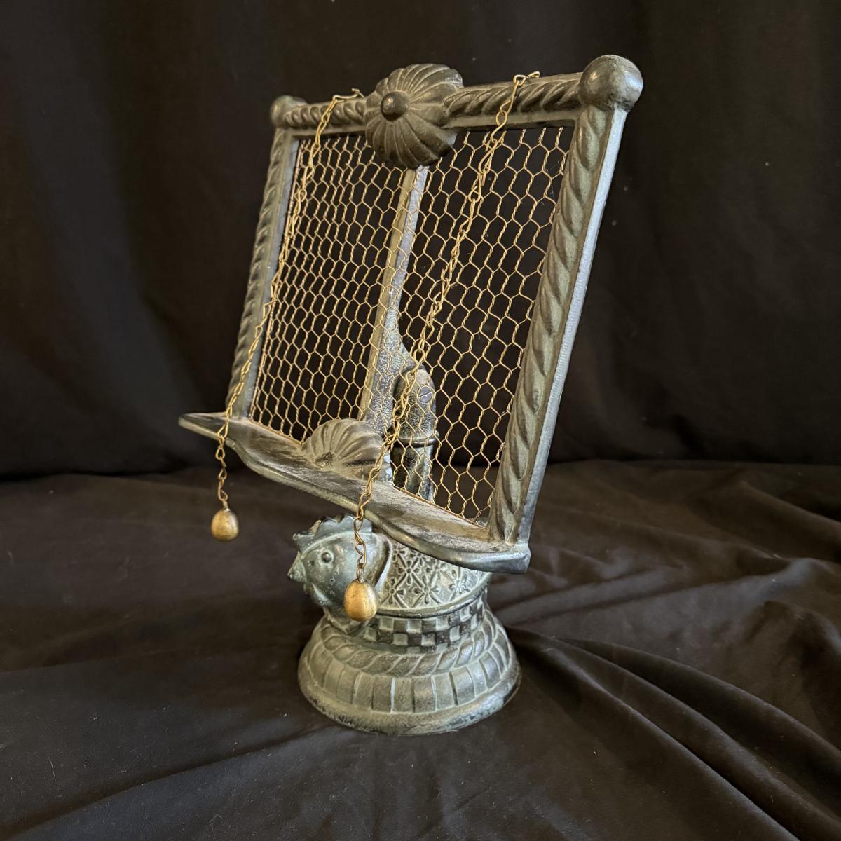 This lot contains a MacKenzie-Childs cookbook holder. This item is made of metal and features a chicken at the base, an adjustable display tray that you lean your book on with a chain on either side to hold it open. The tray that you lean your book on is a bit loose but appears to able to tighten via some screws on the back. This item measures 11.25” x 6” x 15”H. Shipping available. Shipping can be costly. We suggest contacting our preferred local shipping provider, Postage Express, with dimensions and getting an estimate before bidding: (828) 255-9250 or shipping@postageexpressnc.com.