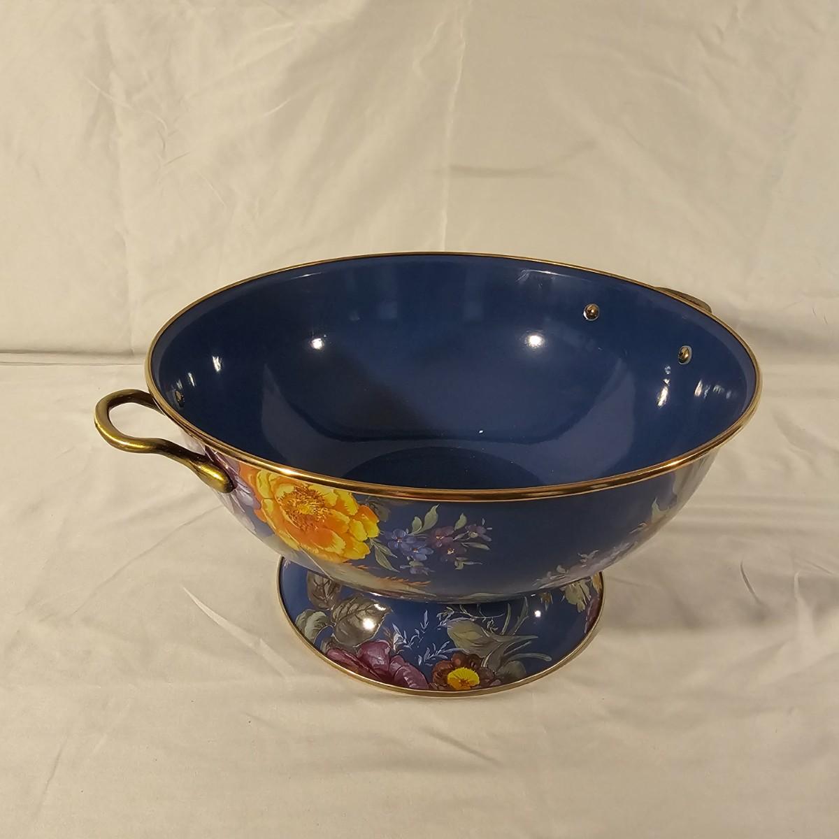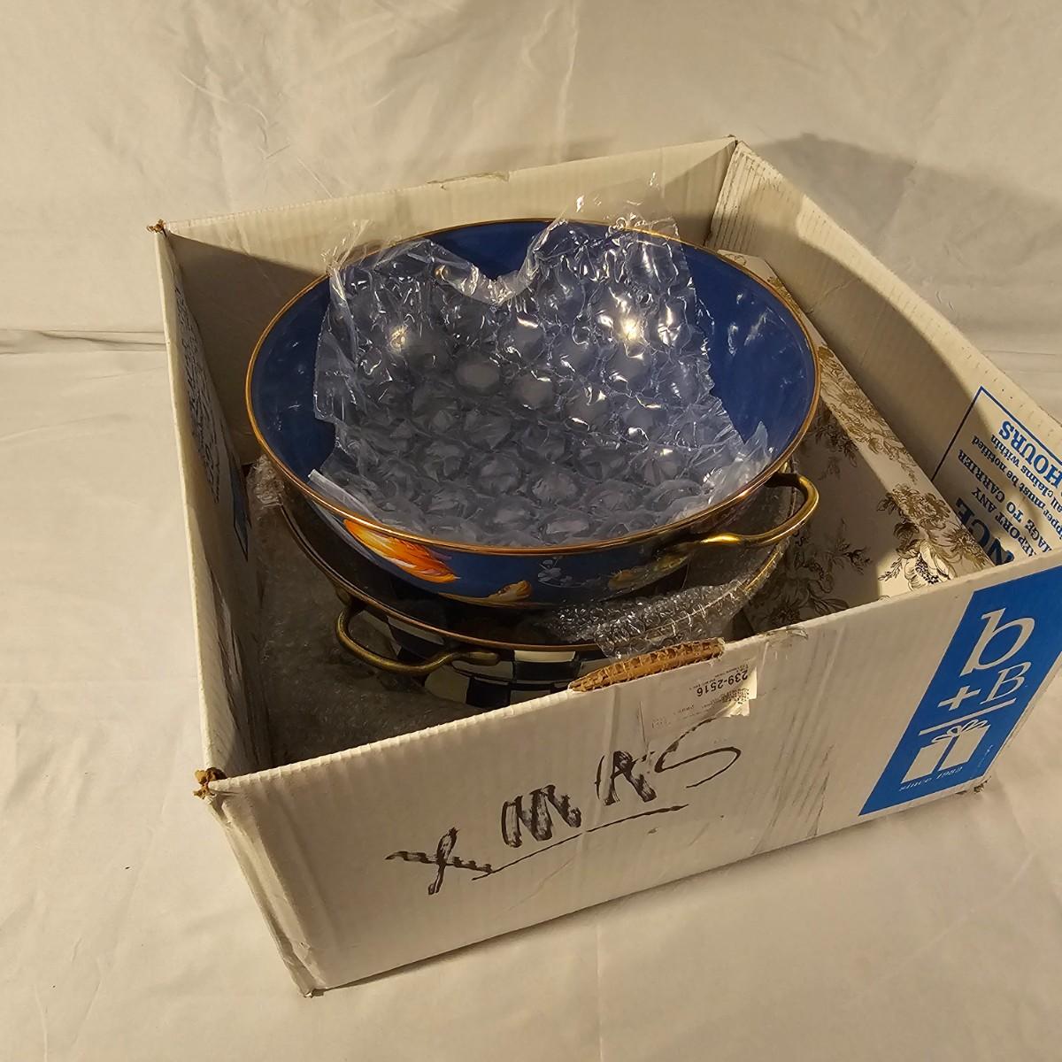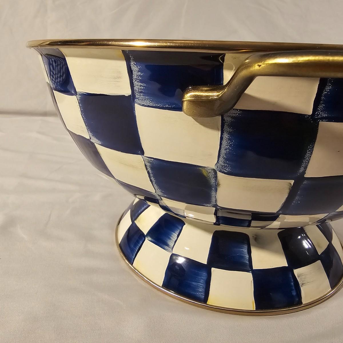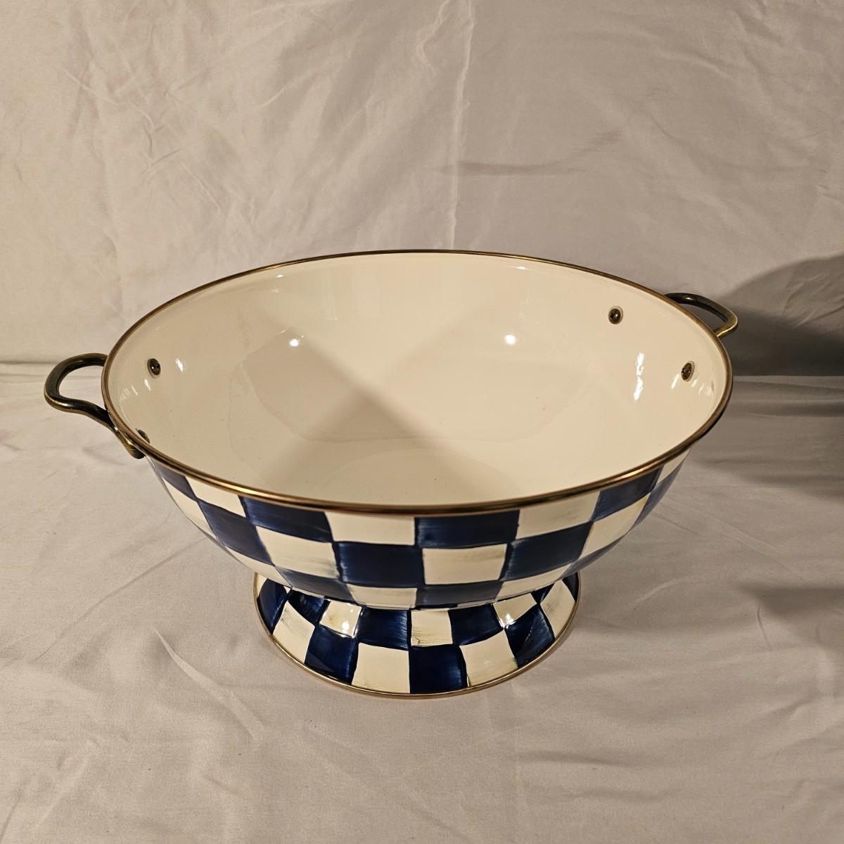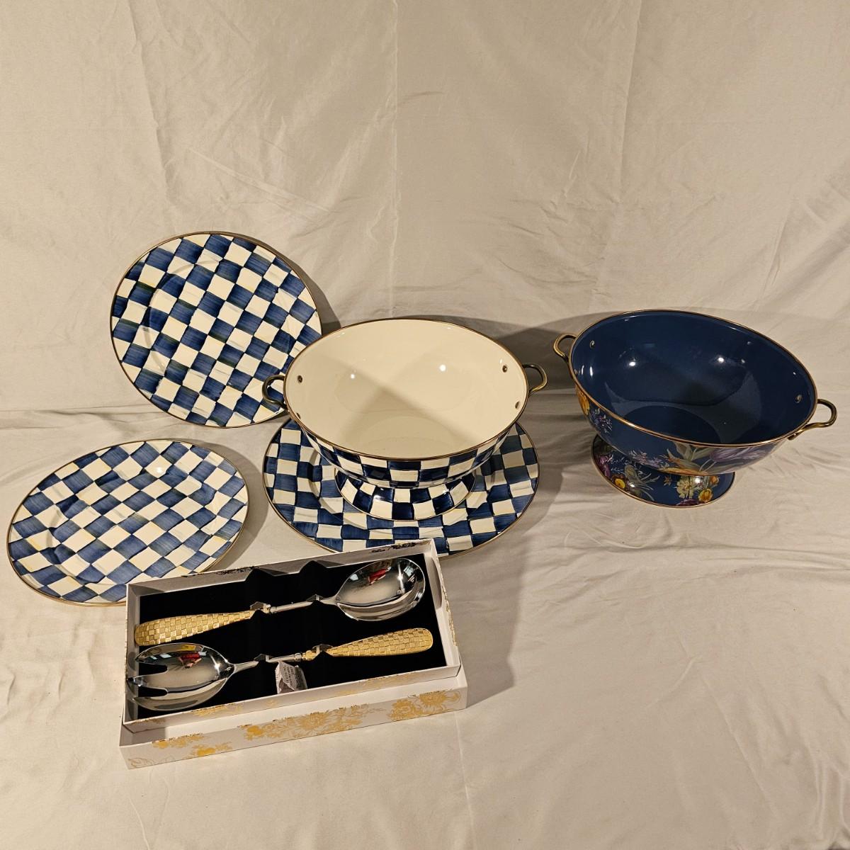 Beautiful blue/white check enameled metal "everything" bowl, serving tray, and charger/plates by MacKenzie-Childs. Salad bowl has double handles, measures 15" x 13" x 7"H. Tray is 16"D and two plates are 12"D. Also a set of gold plated serving spoon and fork in box. Additional floral themed "everything" bowl, 15" x 13" x 6.5"H. See photos for details. Shipping available.