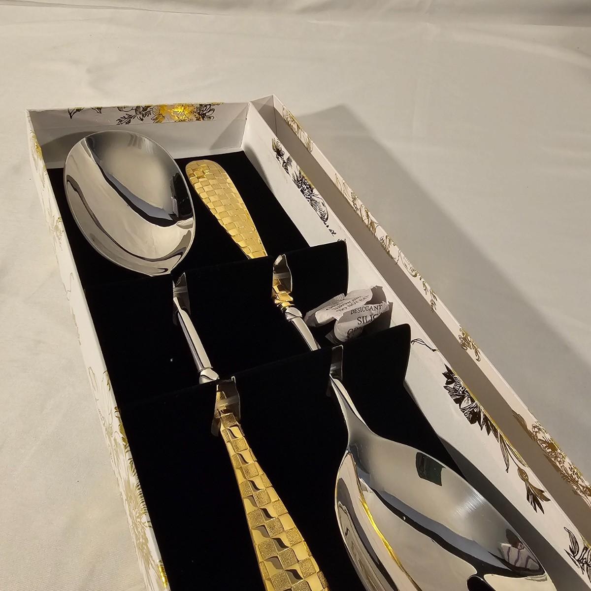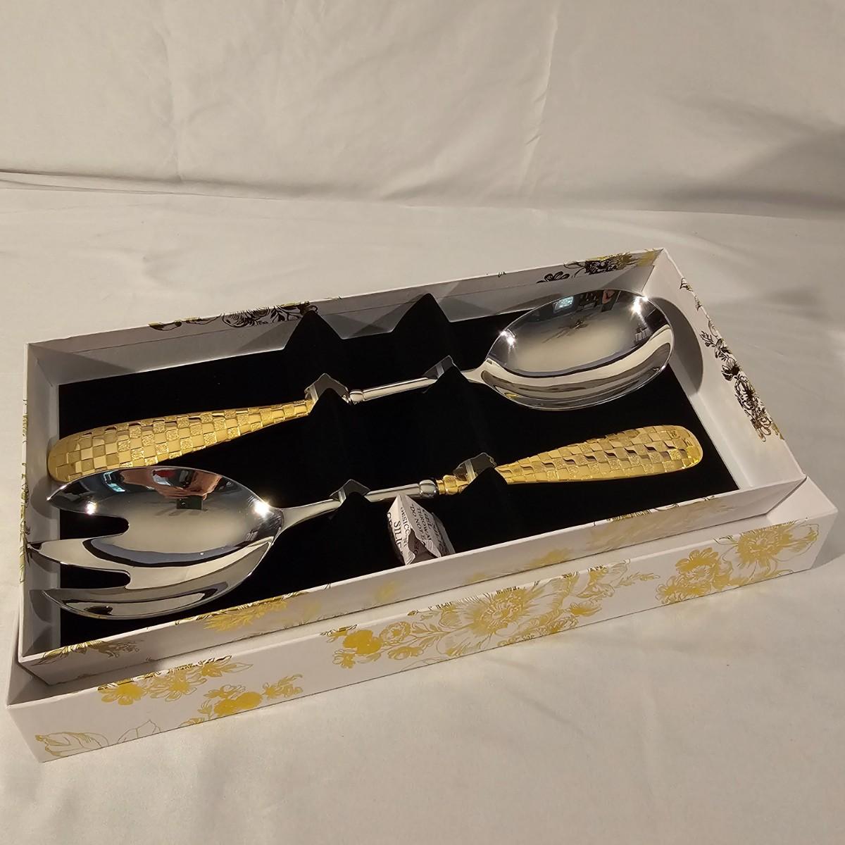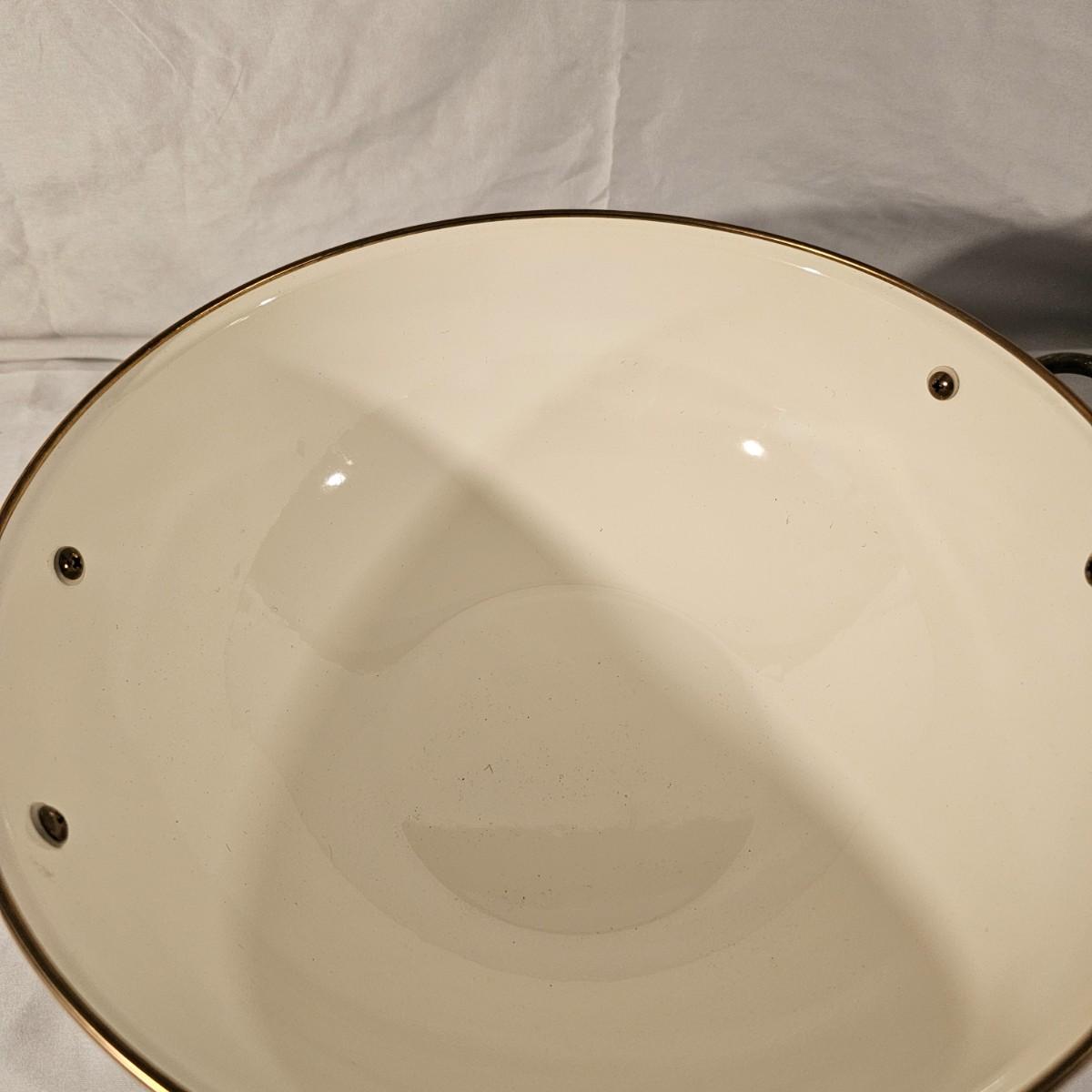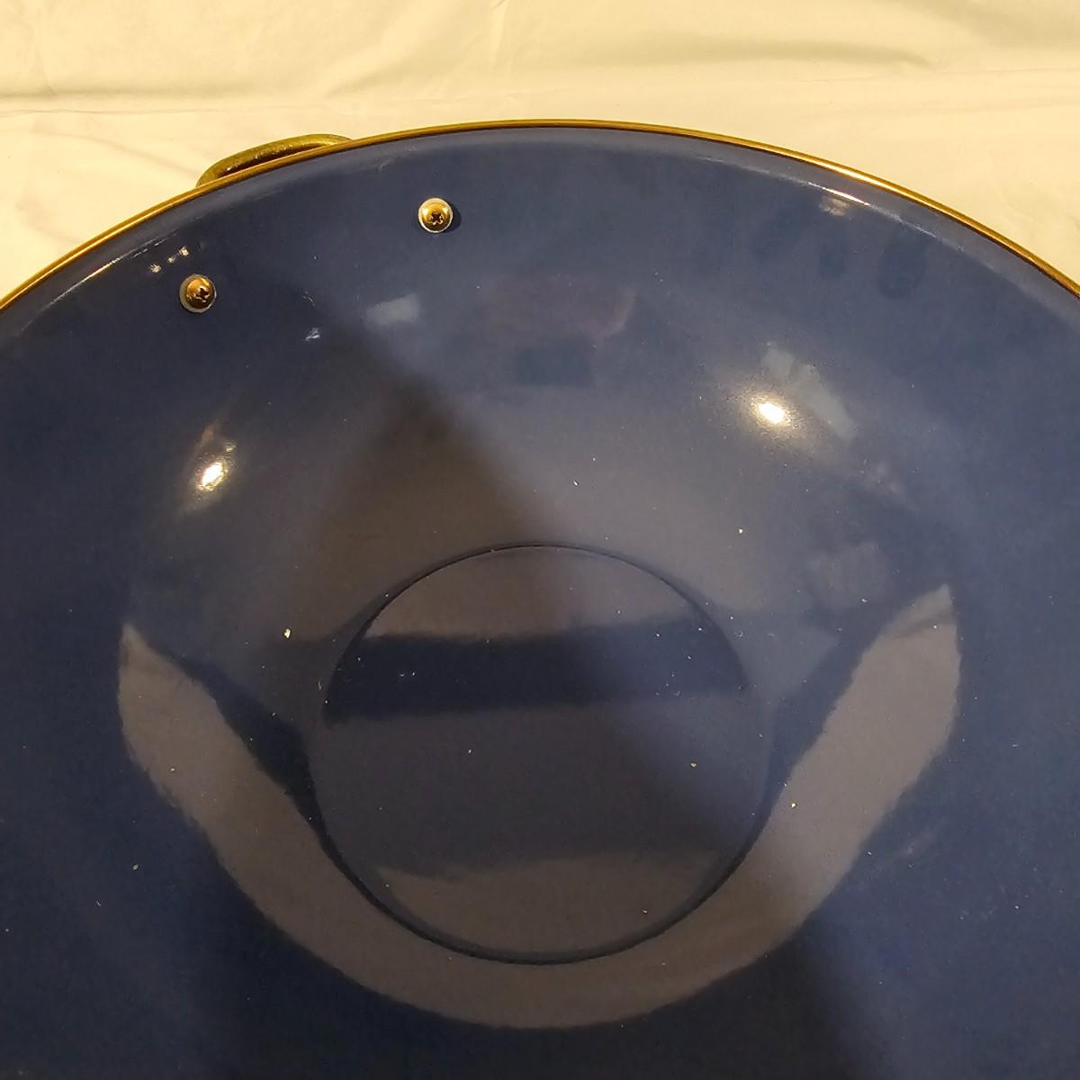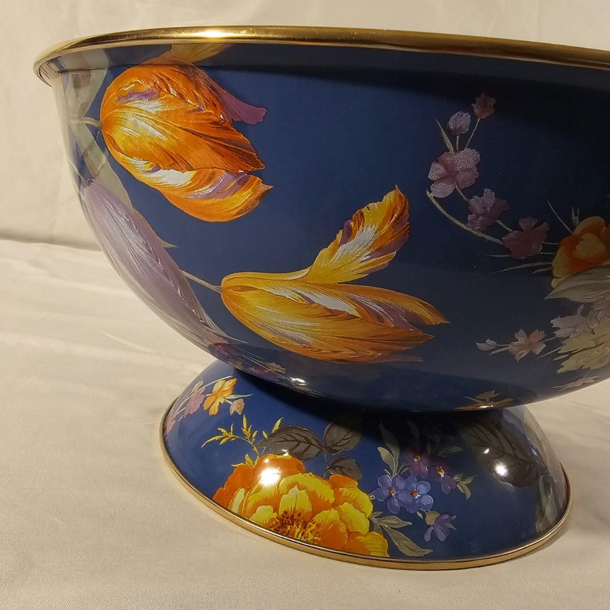 Beautiful blue/white check enameled metal "everything" bowl, serving tray, and charger/plates by MacKenzie-Childs. Salad bowl has double handles, measures 15" x 13" x 7"H. Tray is 16"D and two plates are 12"D. Also a set of gold plated serving spoon and fork in box. Additional floral themed "everything" bowl, 15" x 13" x 6.5"H. See photos for details. Shipping available.