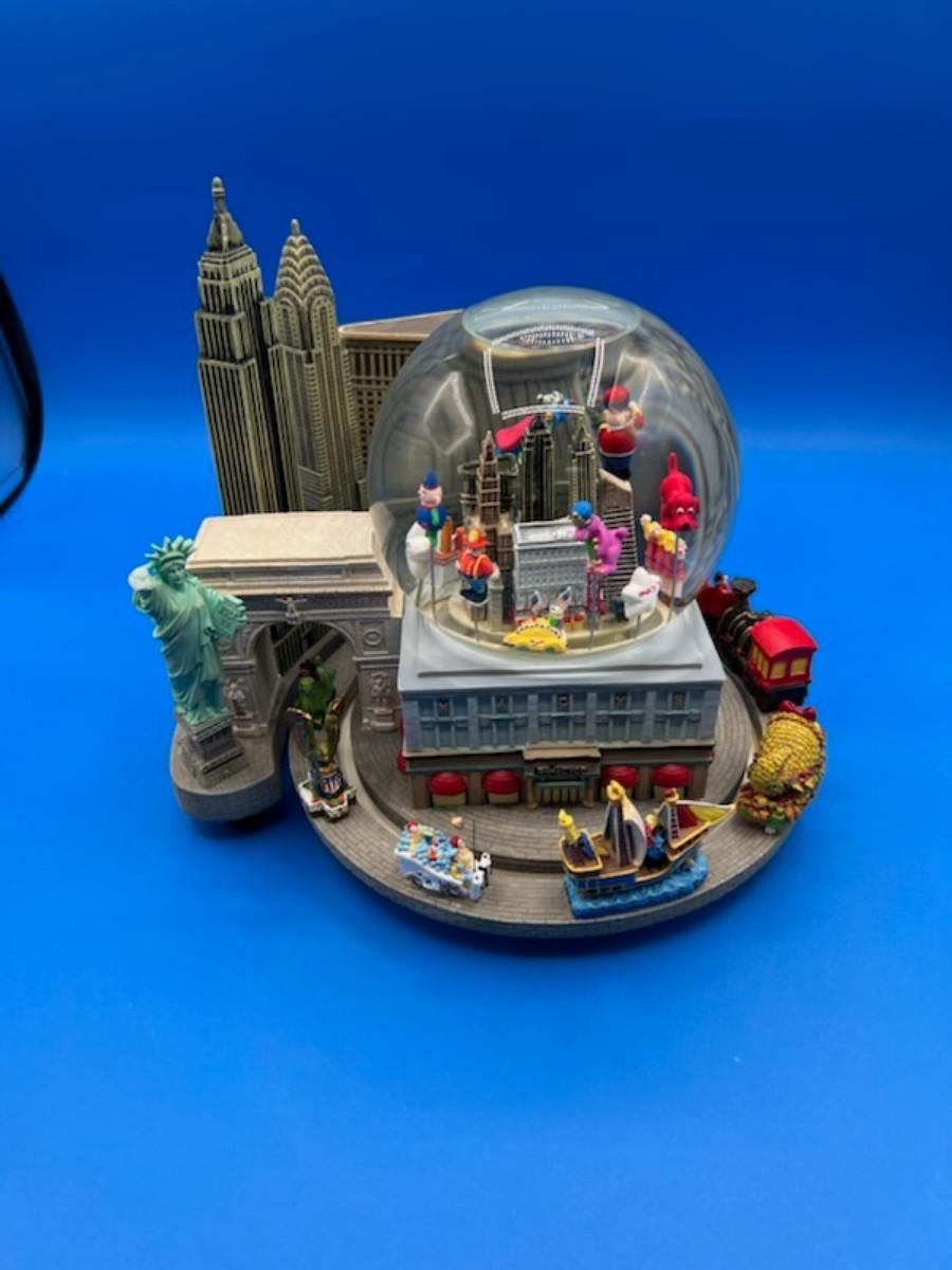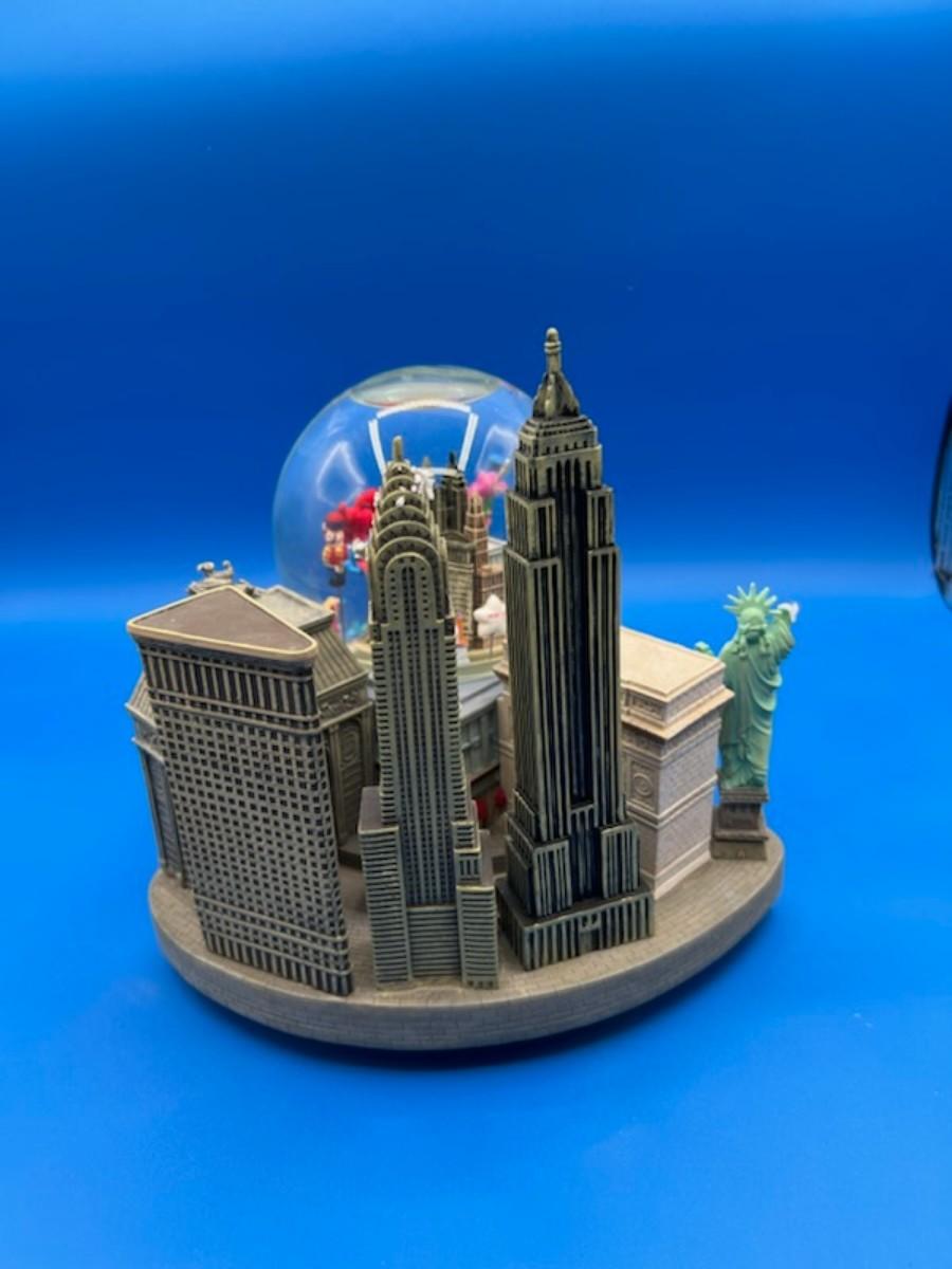 Snow Globe and Musicbox is so charming. Good condition, the torch is broken off from the statue of Liberty, but included for the buyer to repair as desired. The globe rotates and the train circles around the piece.