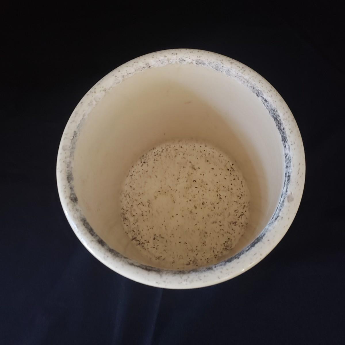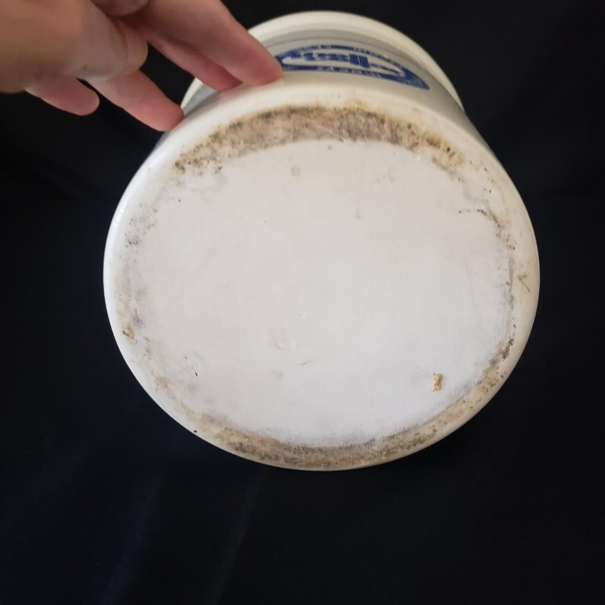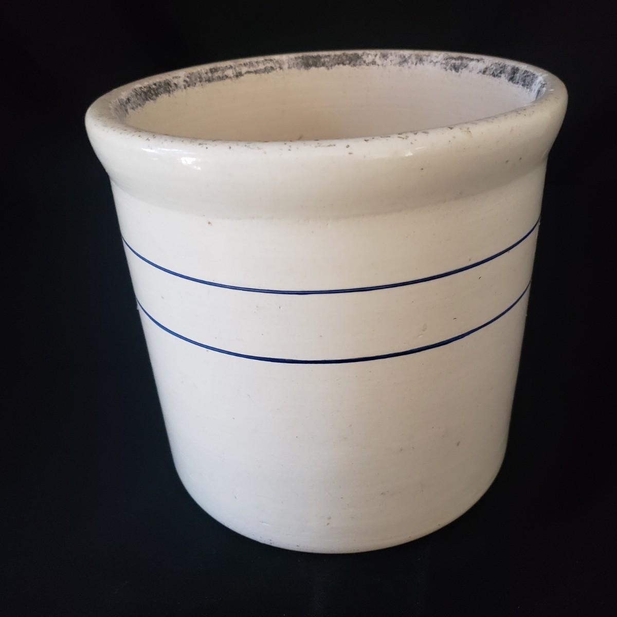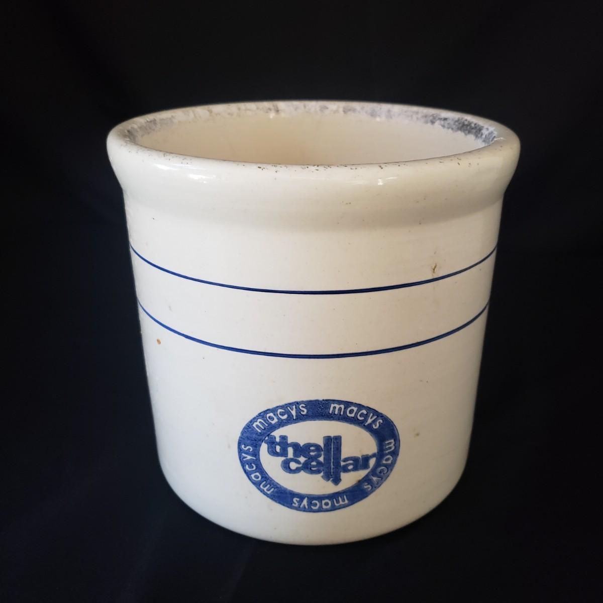 This is likely a vintage crock by Macy's. The crock measures 8"D x 8"H. The crock was previously used for metal kitchen utensils, hence the markings on the rim and bottom.