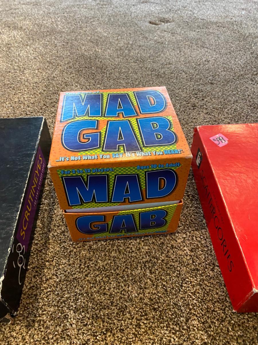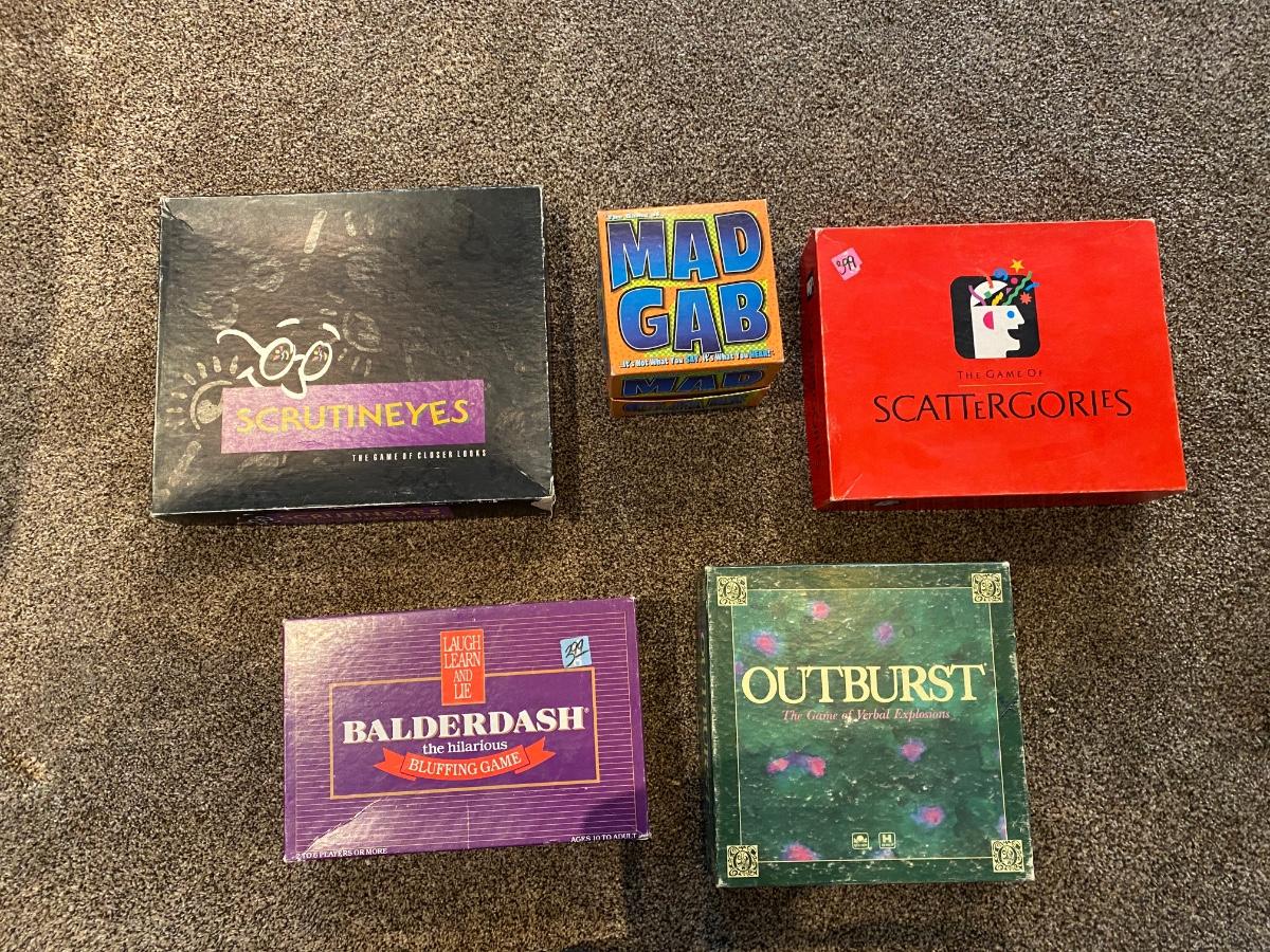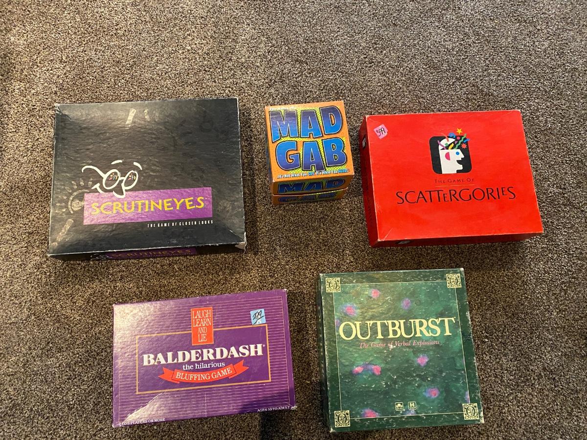 MAD GAB, SCATTERGORIES, OUTBURST, SCRUTINEYES, & BALDERDASH