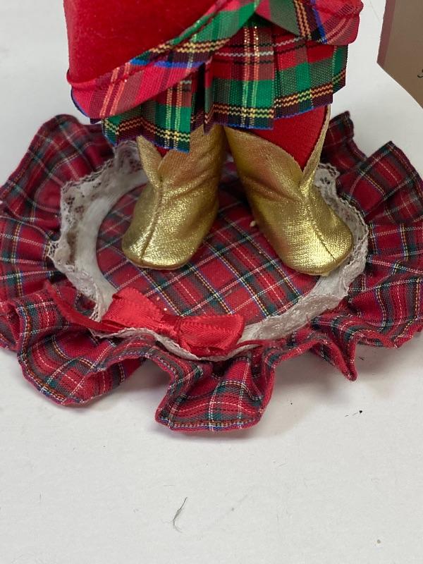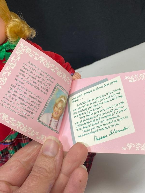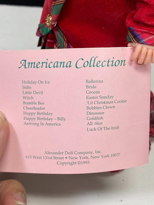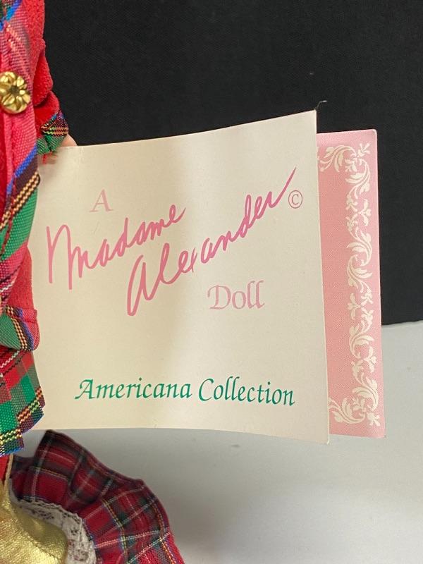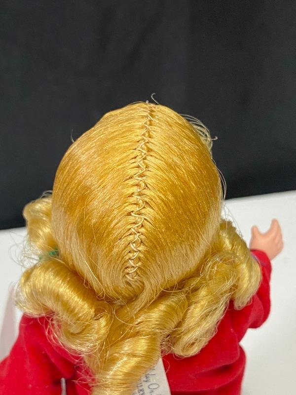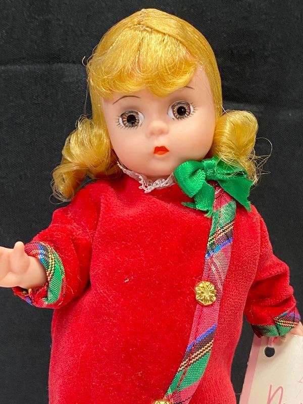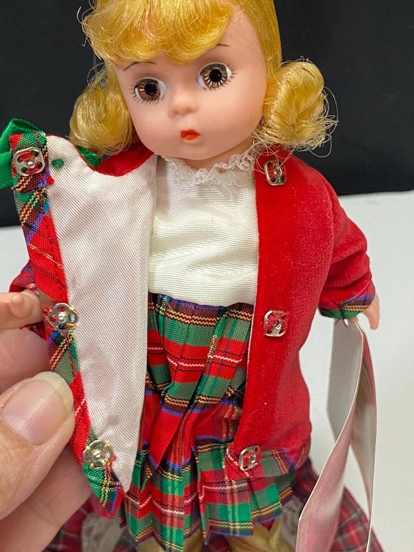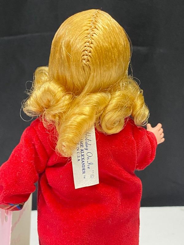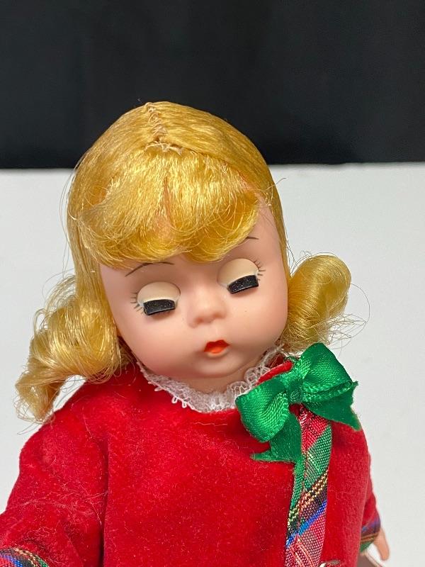 Madame Alexander Americana Collection doll, "Holiday on Ice". Blonde doll with festive red and green clothes. In really good condition. Comes with original hang tag and stand. Stand has been upgraded with the plaid fabric base. She does have sleep eyes, lashes are good. Unfortunately, she is missing her hat and fur hand muff. 8" size.