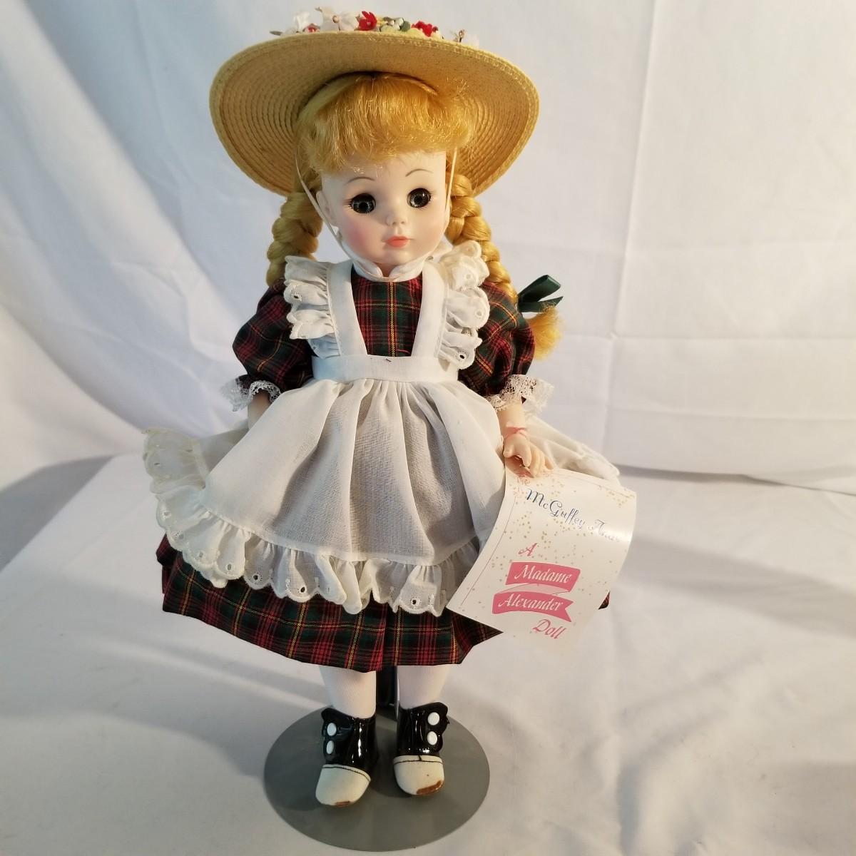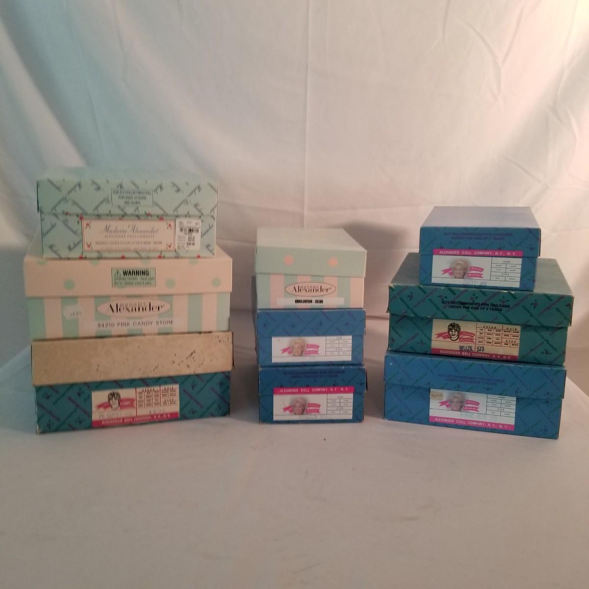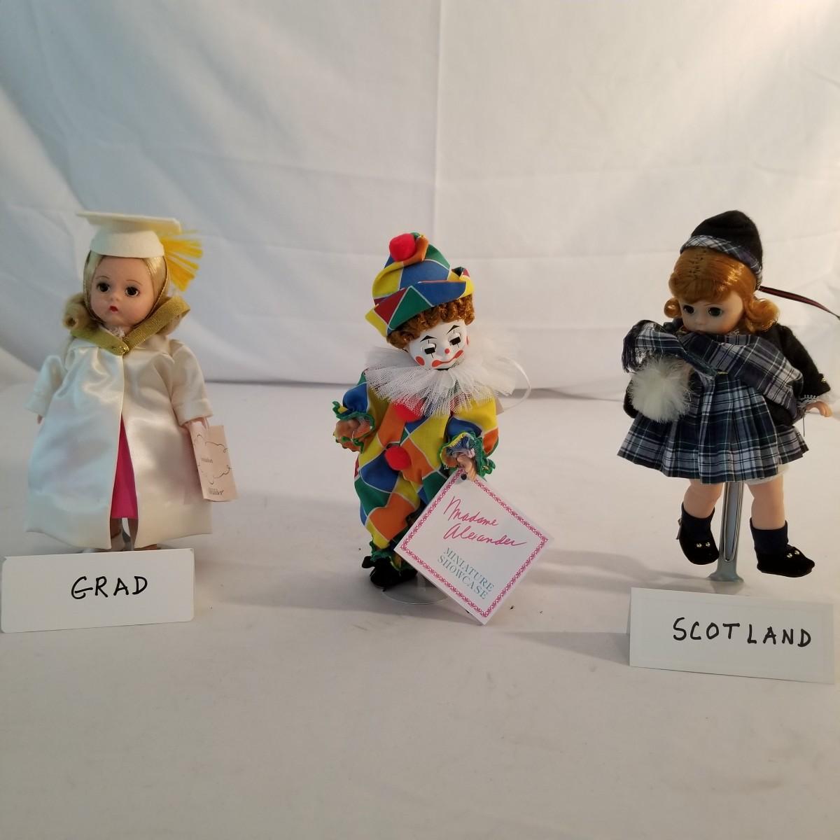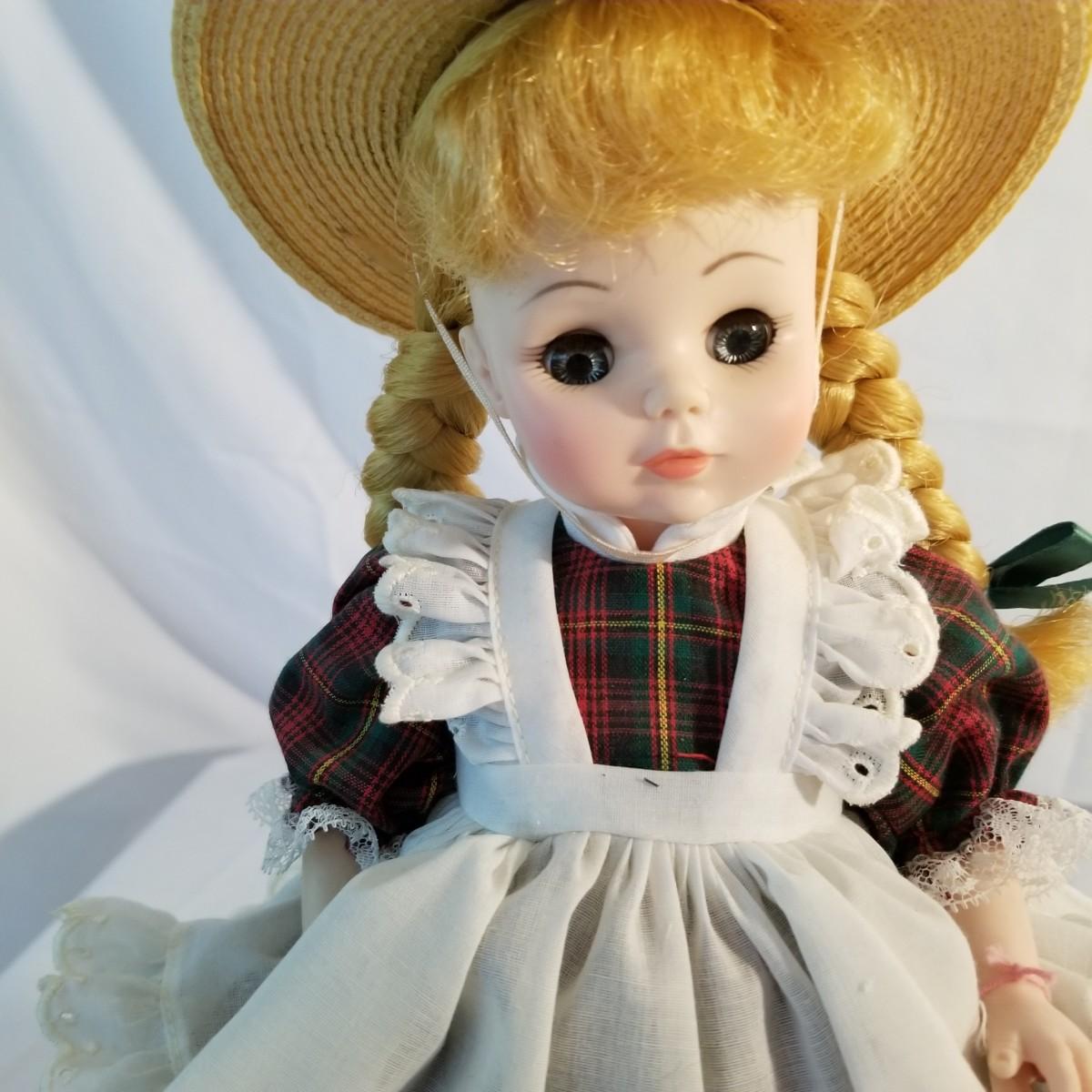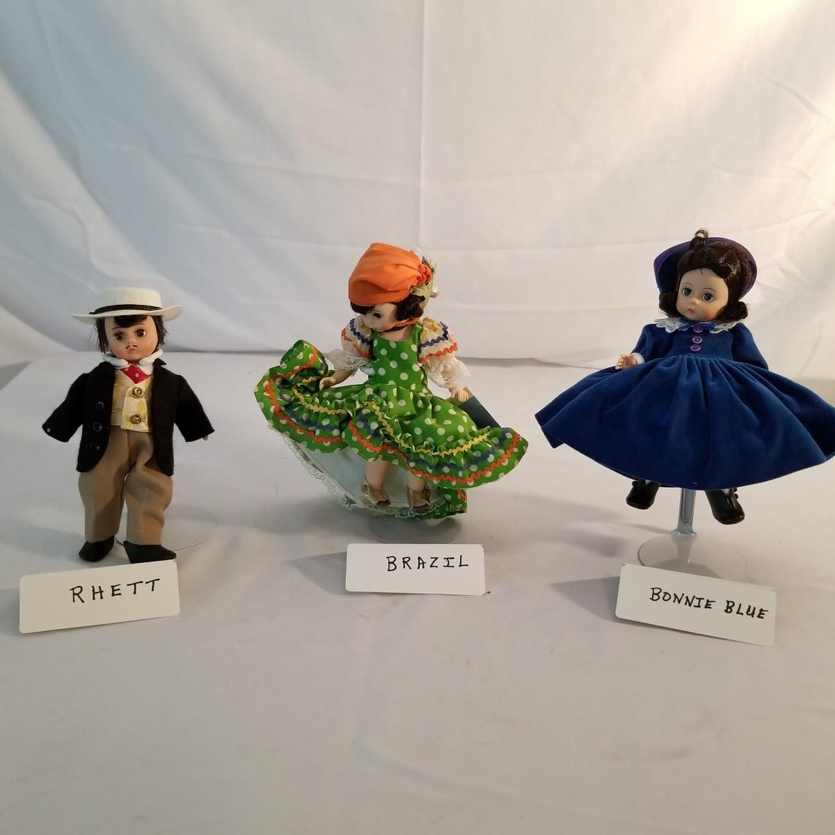 Second lot of Madame Alexander dolls in this auction with nine total dolls in this lot. Most dolls have stands, Pink Candy Store doll does not. Smaller dolls are 8", larger are 13". There are two other lots of Madame Alexander dolls found in this auction. Please see photos for detail. Shipping available.