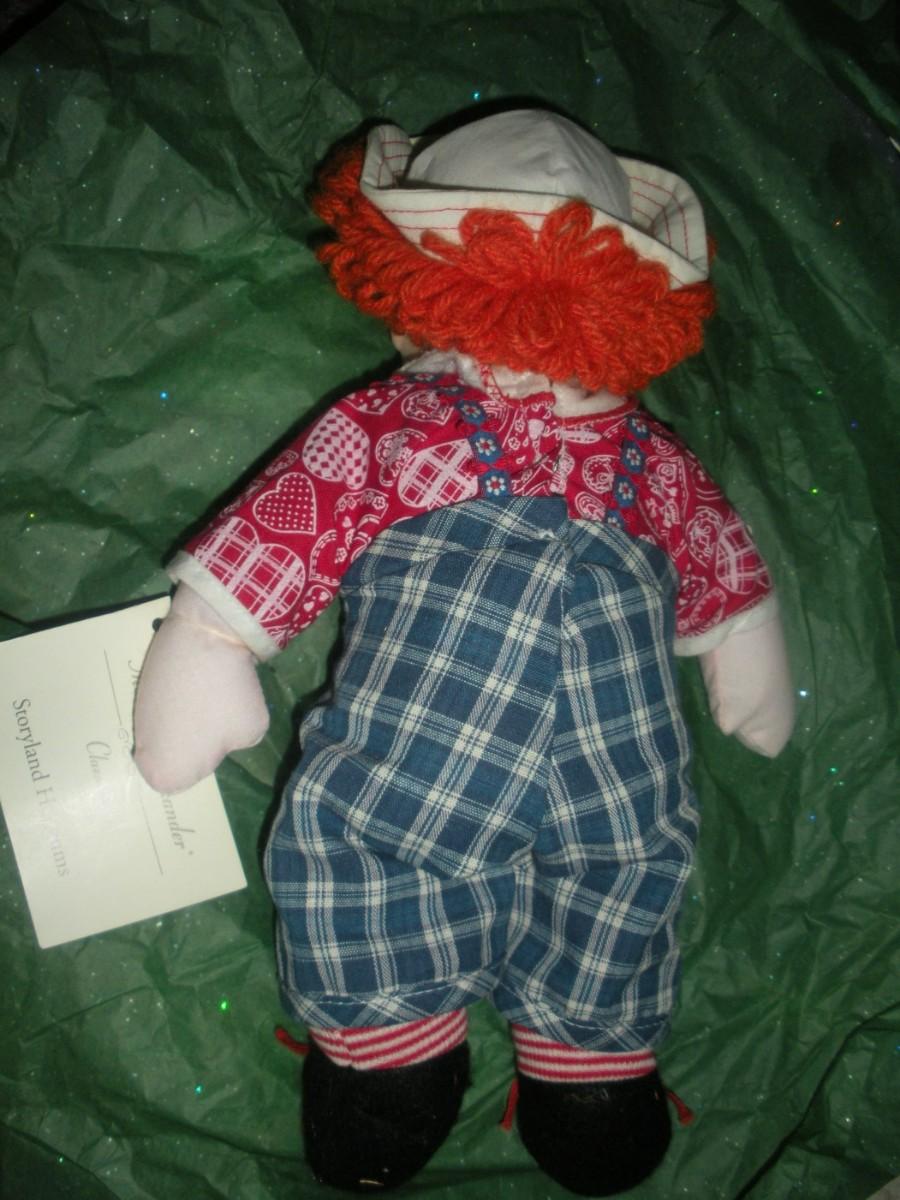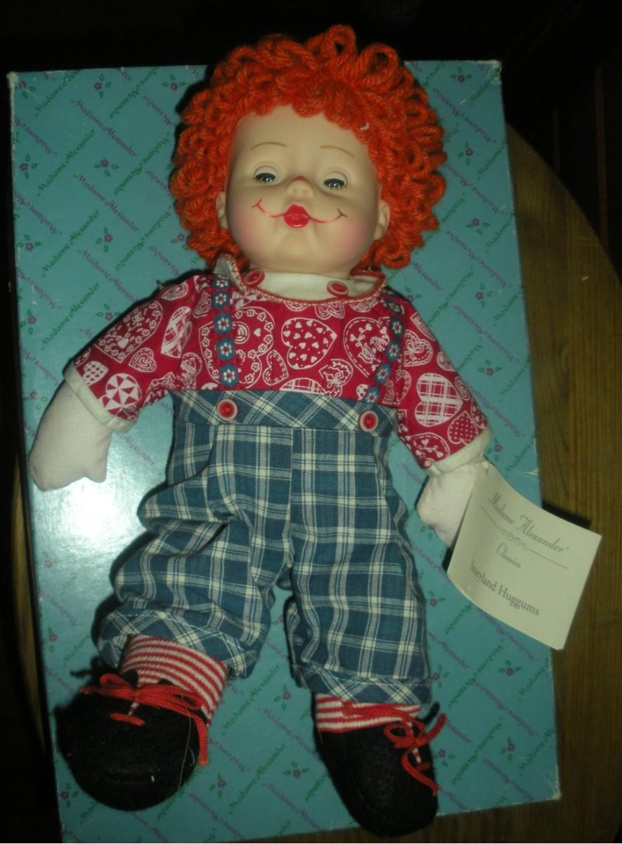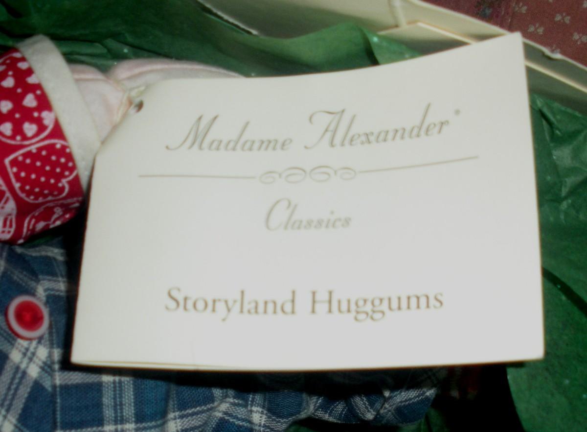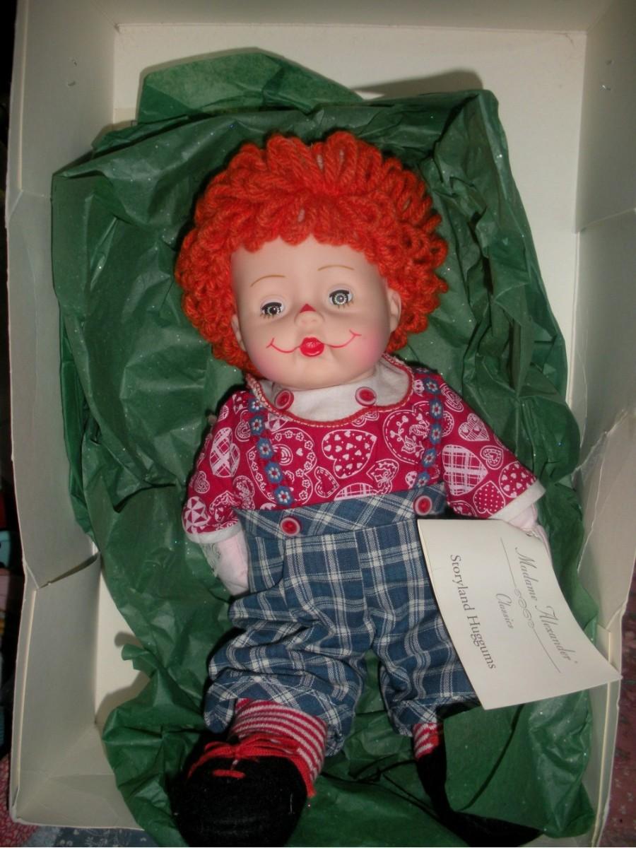 Adorable Mop Top Huggums Baby Boy from the Storyland Huggums Series. 12" Cloth body and a Raggedy Andy style head. In original box which is a bit rough. Doll is great and has original wrist tag still.
