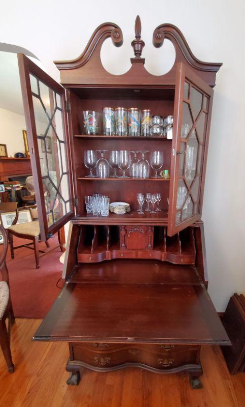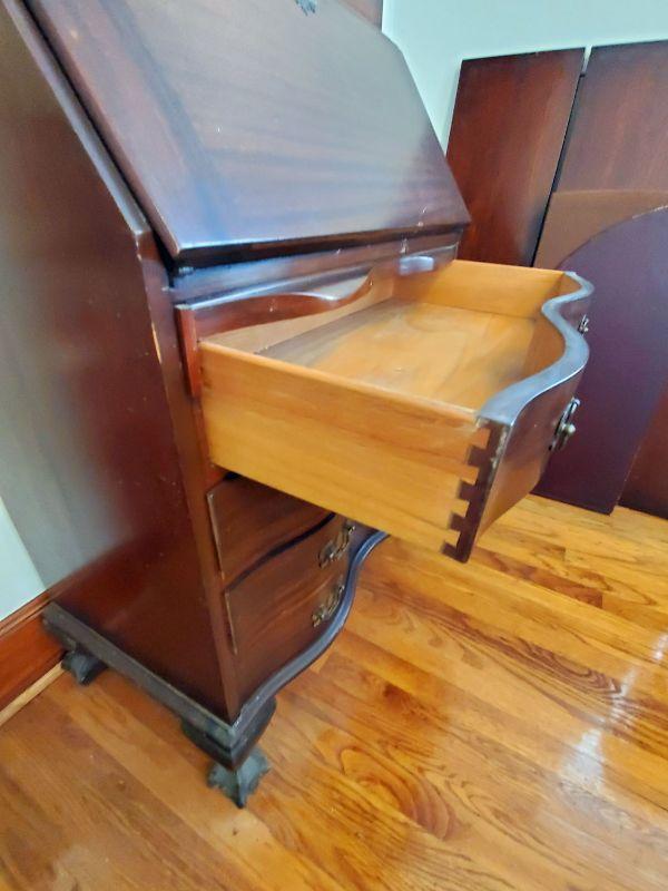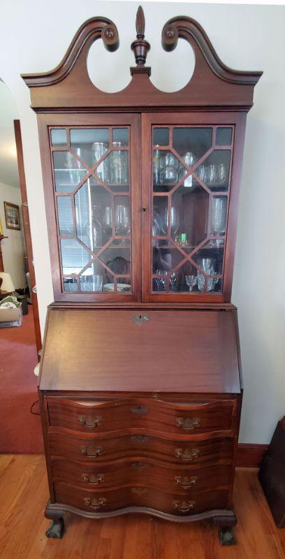 Beautiful secretary in great condition. some signs of wear at corners that can easily be repsired (see photo of drawer). Drawers are dove tailed and the upper doors lock. There are 2 secret compartments in the desk section.