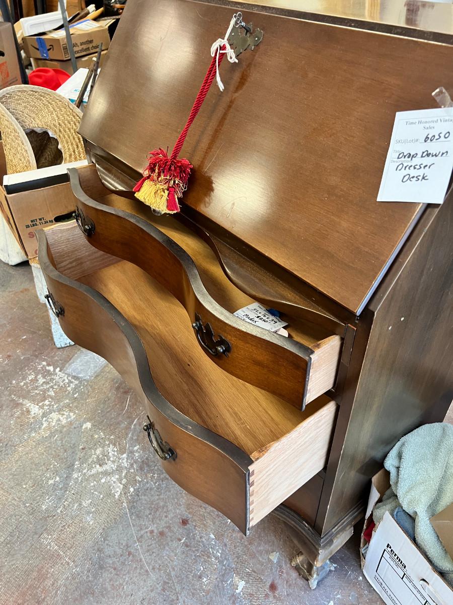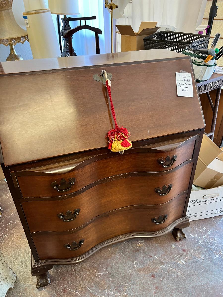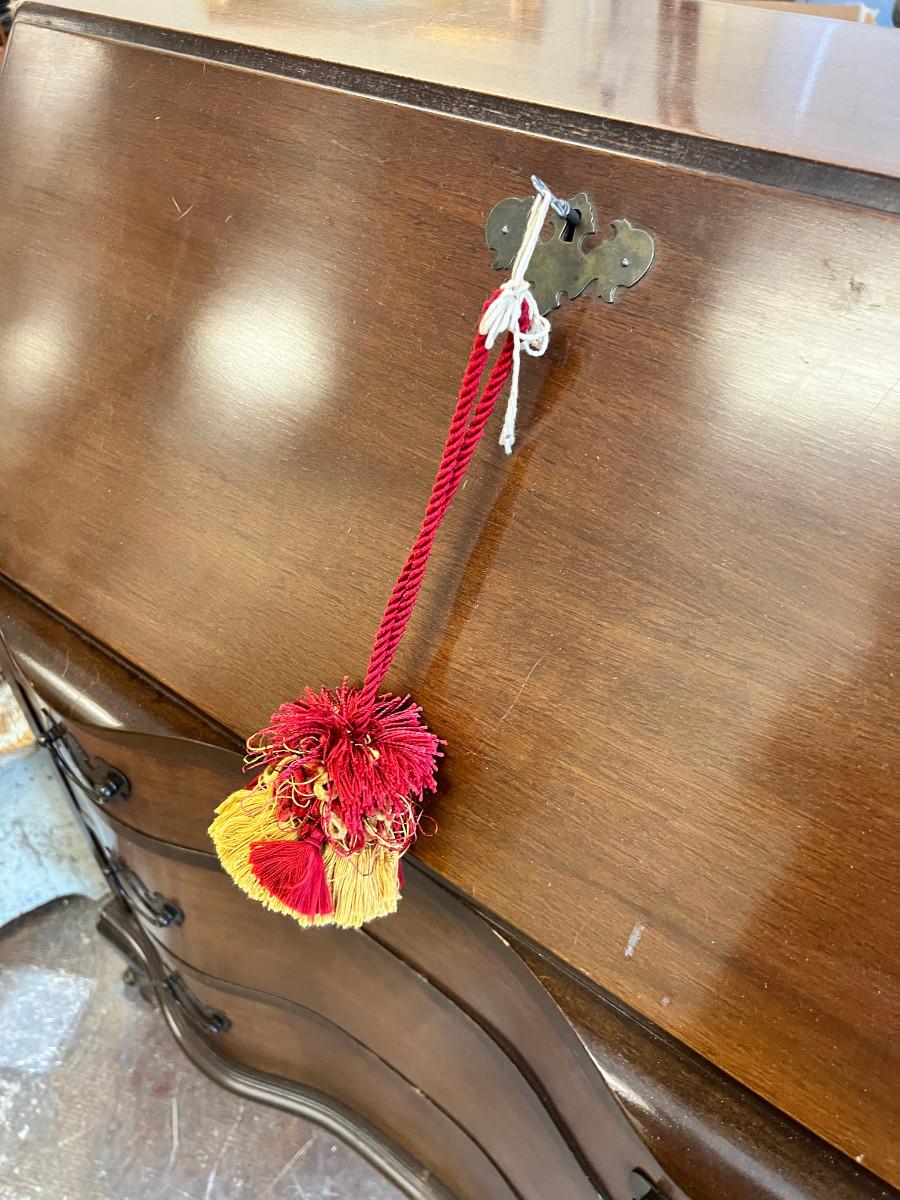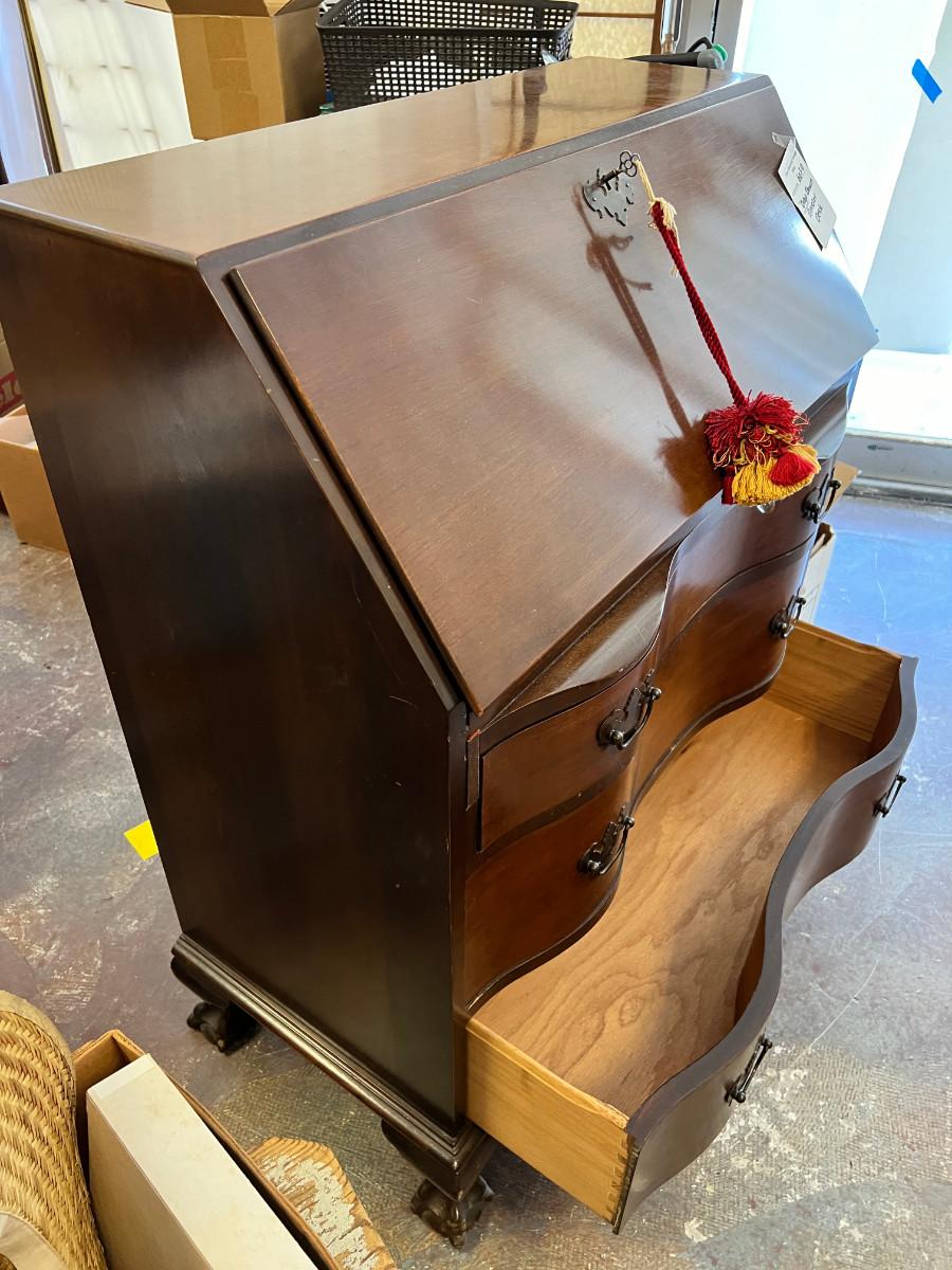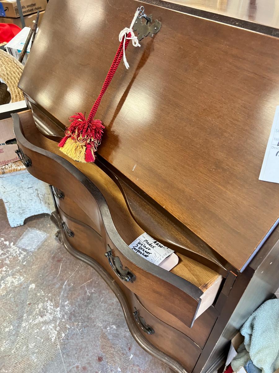Antique claw foot with skeleton key, tassel. Serpentine front with 3 drawers. In good condition with original tags. measurements in pictures.
