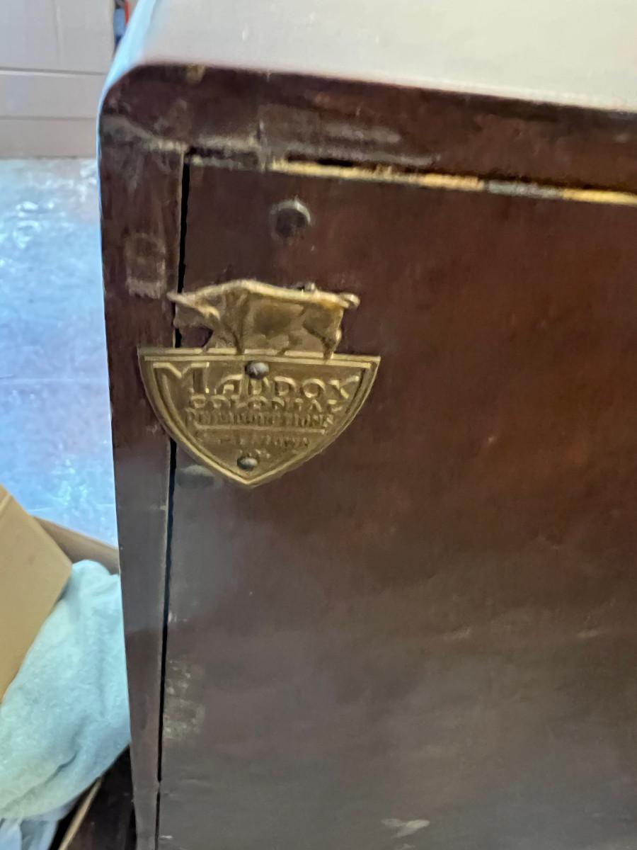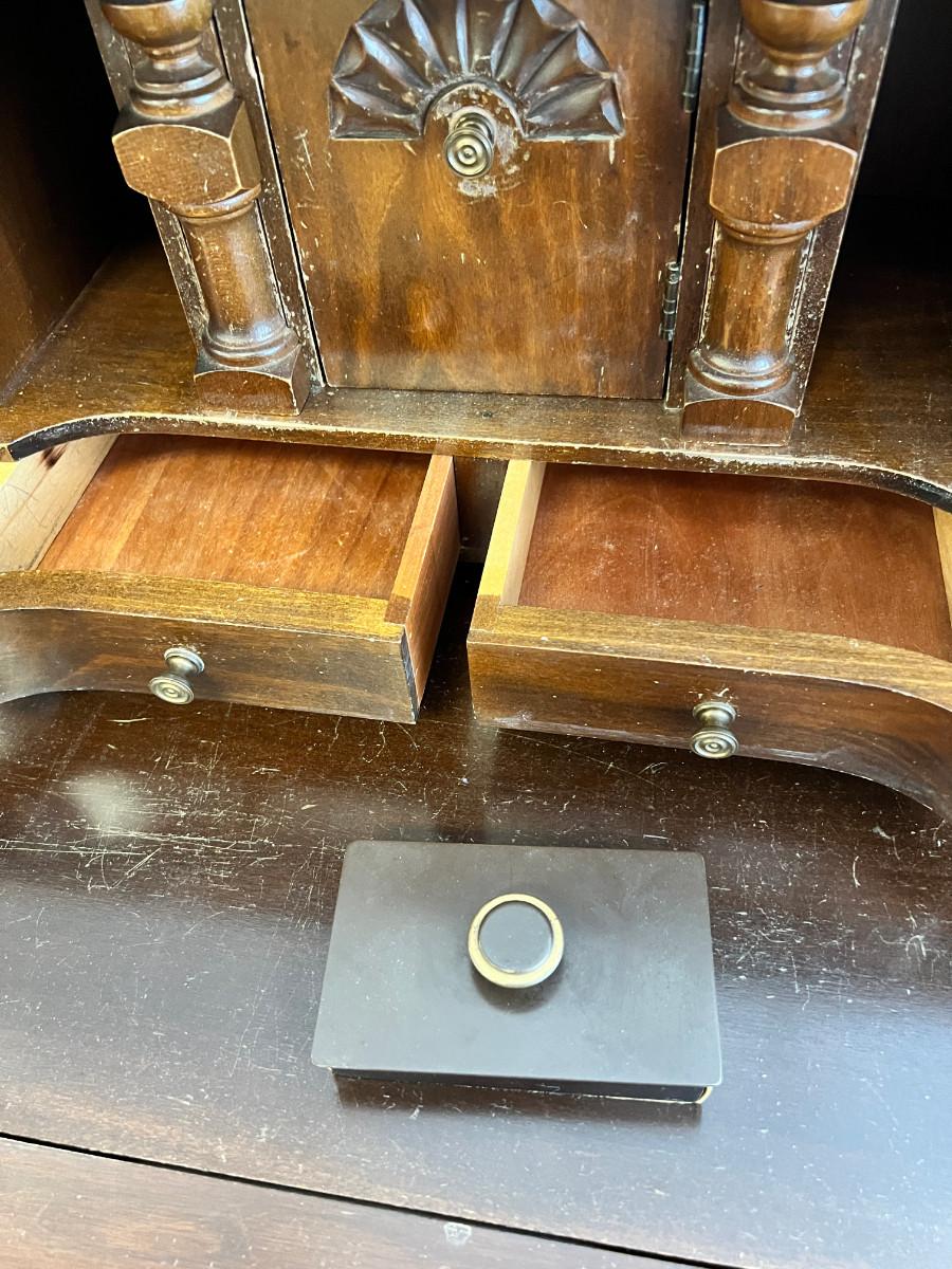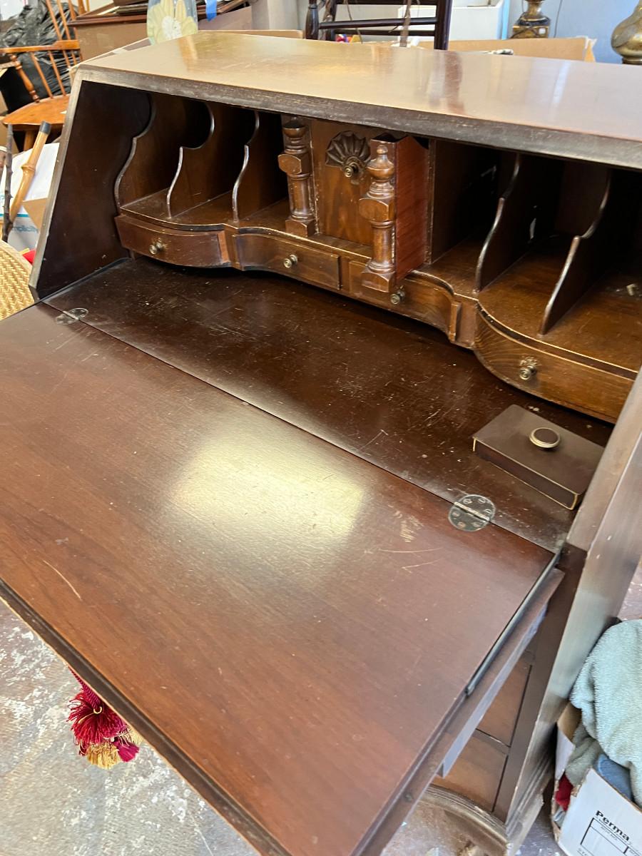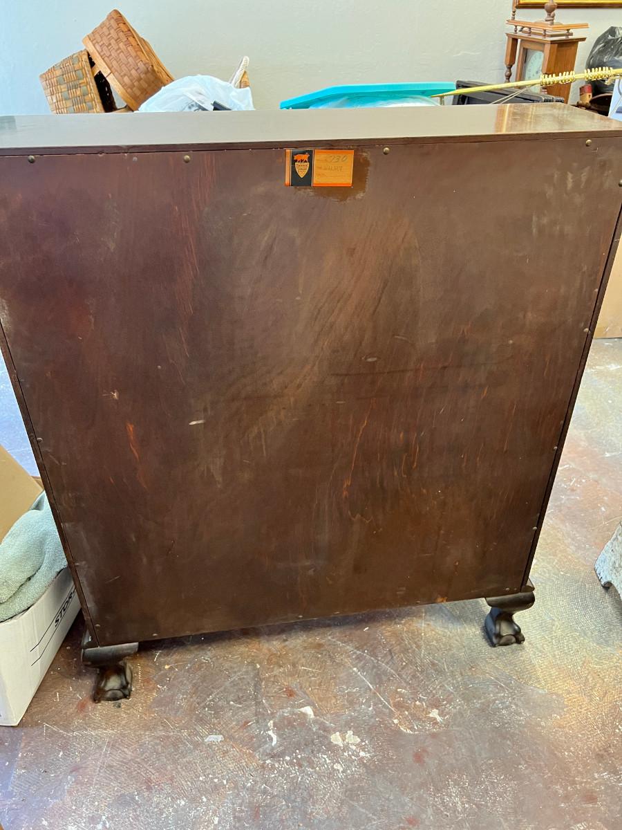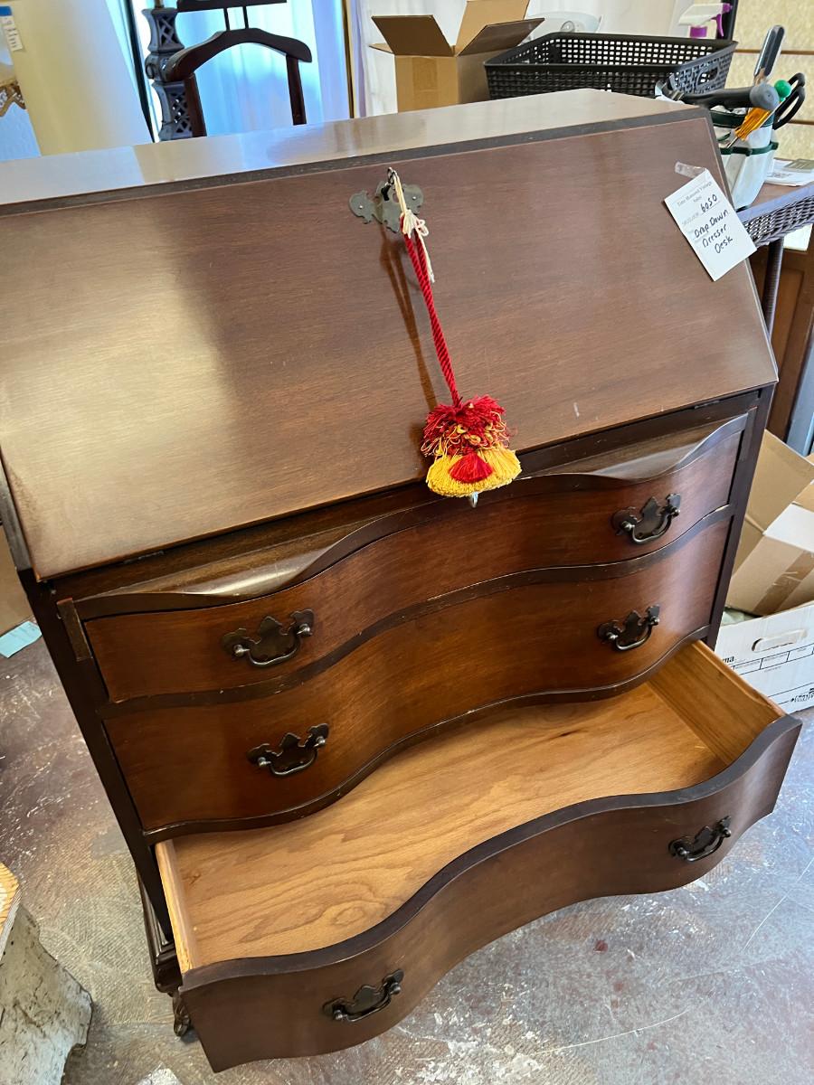 Antique claw foot with skeleton key, tassel. Serpentine front with 3 drawers. In good condition with original tags. measurements in pictures.