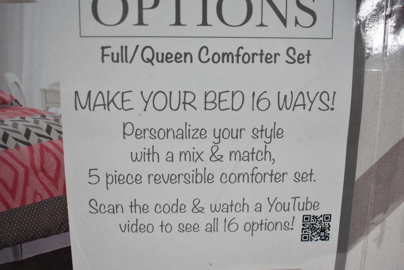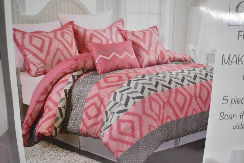 Maddy Reversible Comforter Set by Nanshing, Full/Queen 5 pc Set. Pink/Gray/White with Chevron/Ikat Patterns, $70 Retail - New
