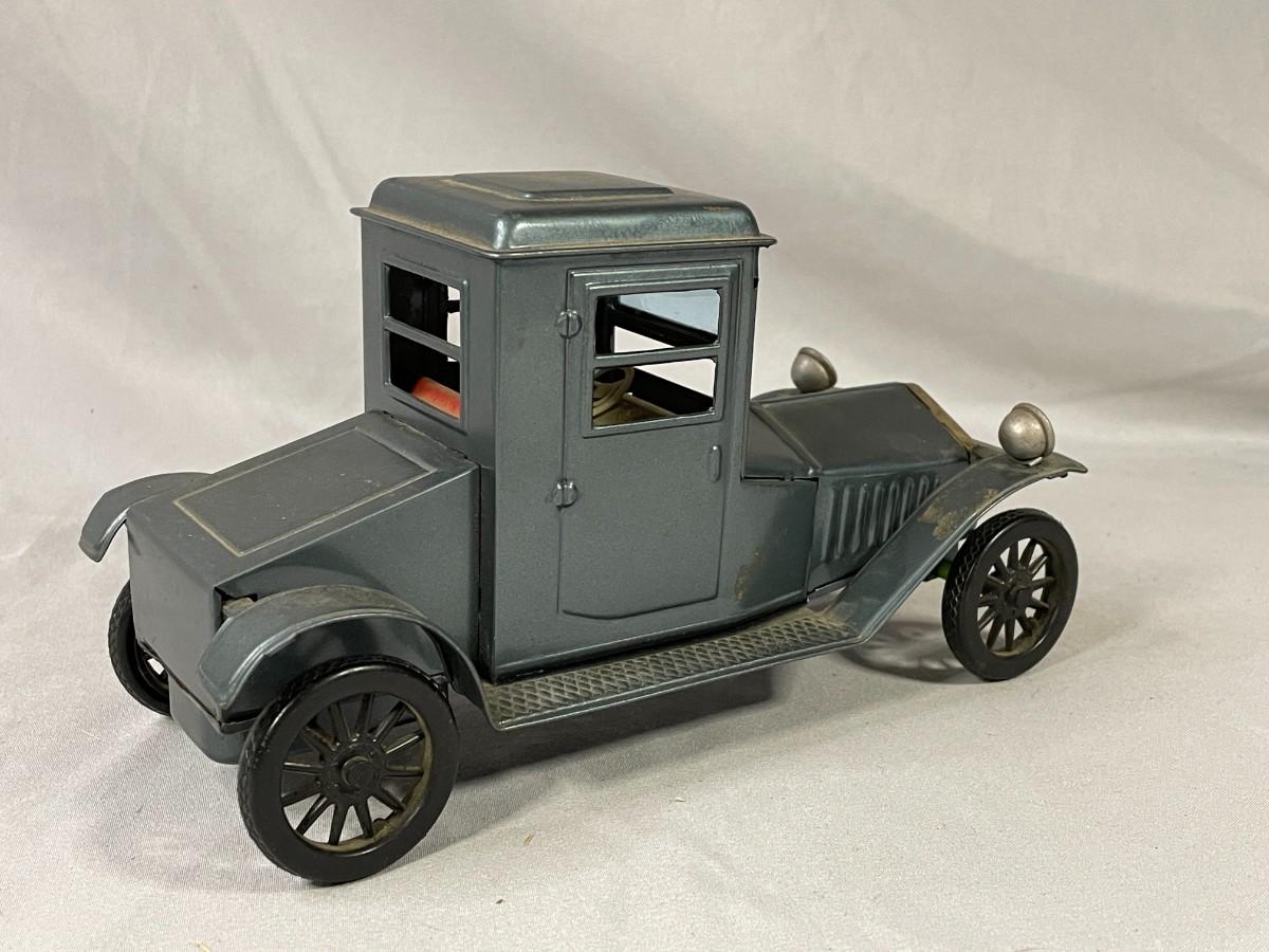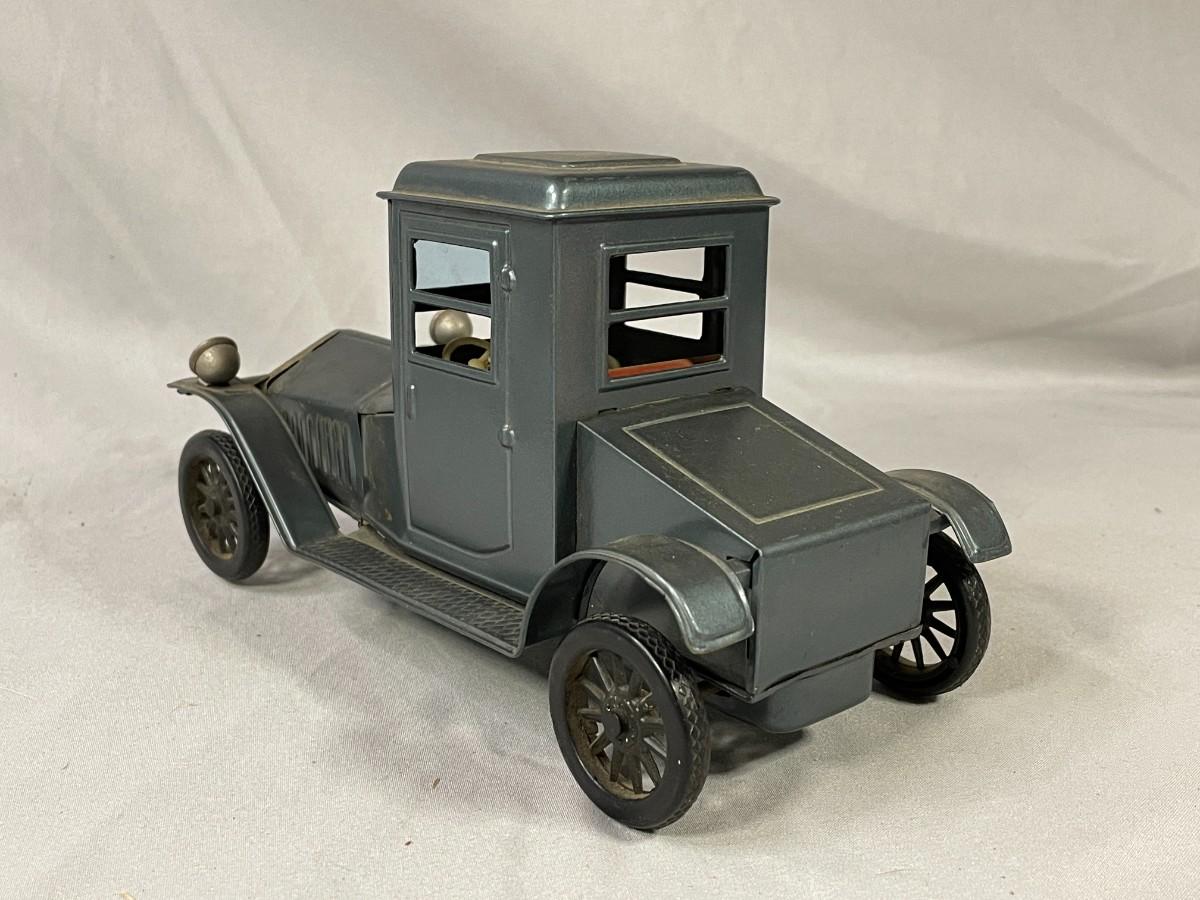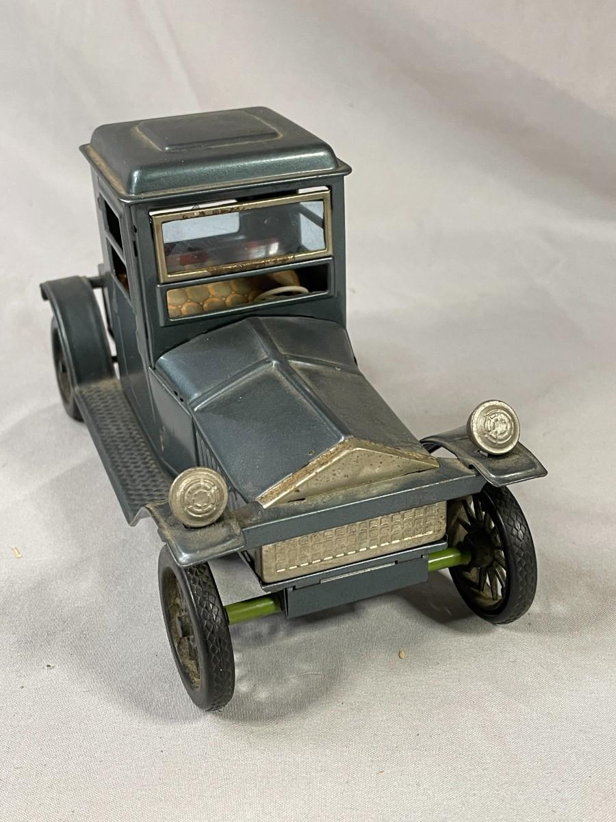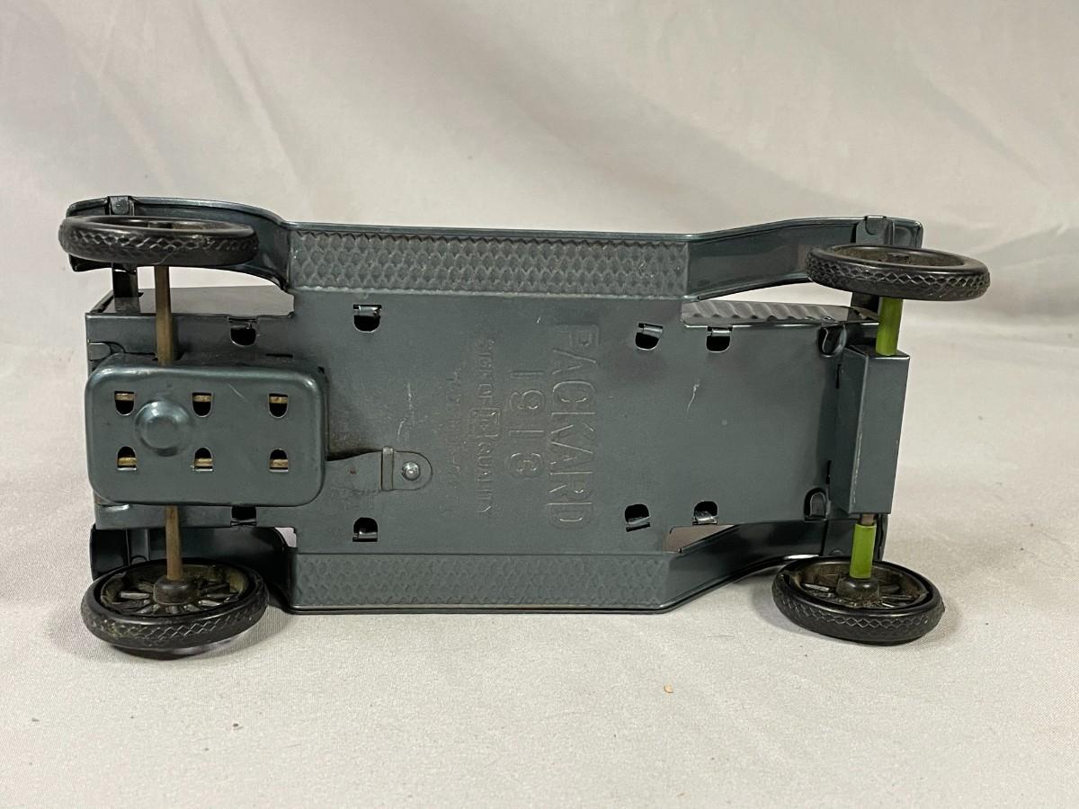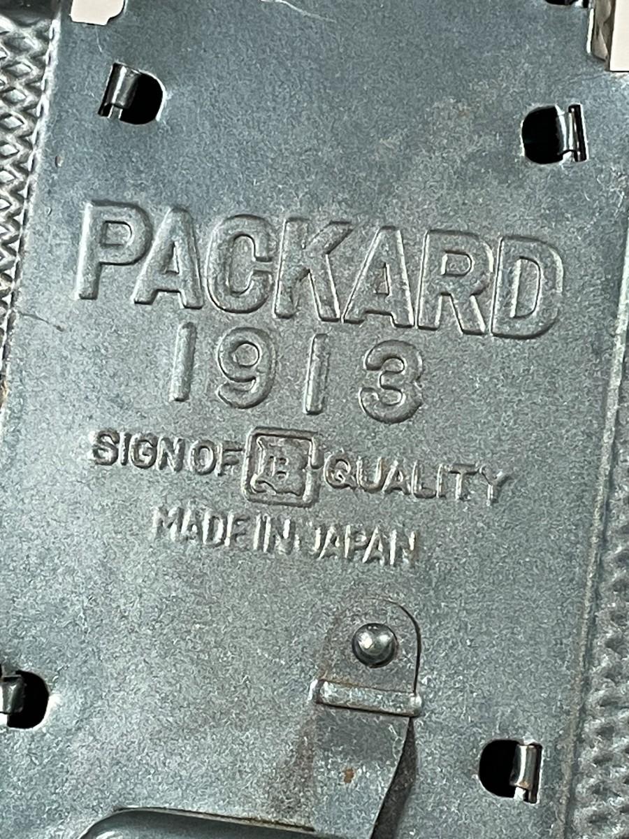 This car is about 7.75" x 4.5" and made of a lightweigh tin. The underside has Packard 1913 Sing of Quality Made in Japan. The friction tries to work, but just can't get going.