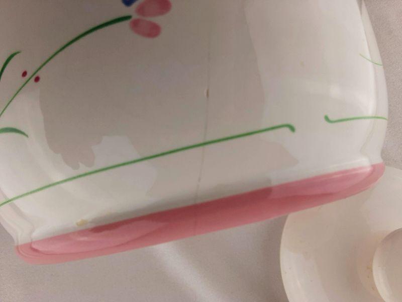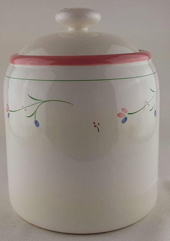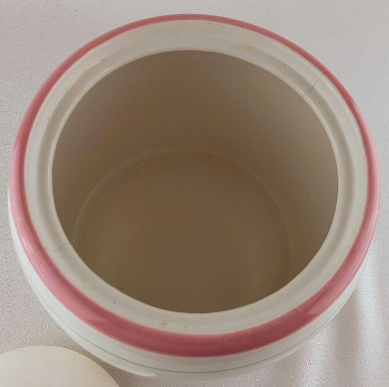 Lidded cannister including lid measures 7.25in tall and 5.75in diameter. There are two minor cracks ad shown in the photo.