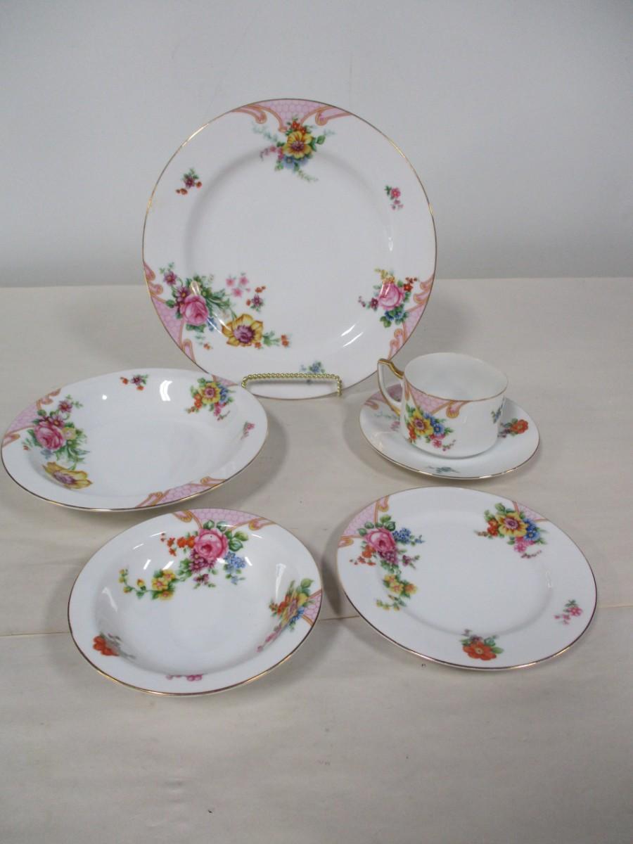 6 - dinner plates, 8 - 5 1/2" small bowls, 6 - 7 3/4" bowls, 8 - cups, 7 - saucers and 8 - 6 1/4" plates