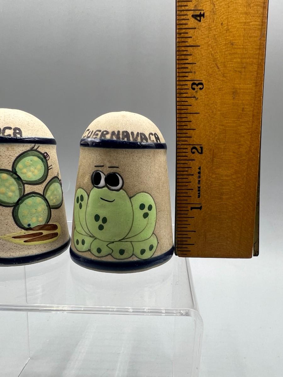 Made in Mexico Souvenir Collectible Miniature Salt and Pepper Shakers Cactus and Frog Cuernavaca. In good condition. About 2.5" size.