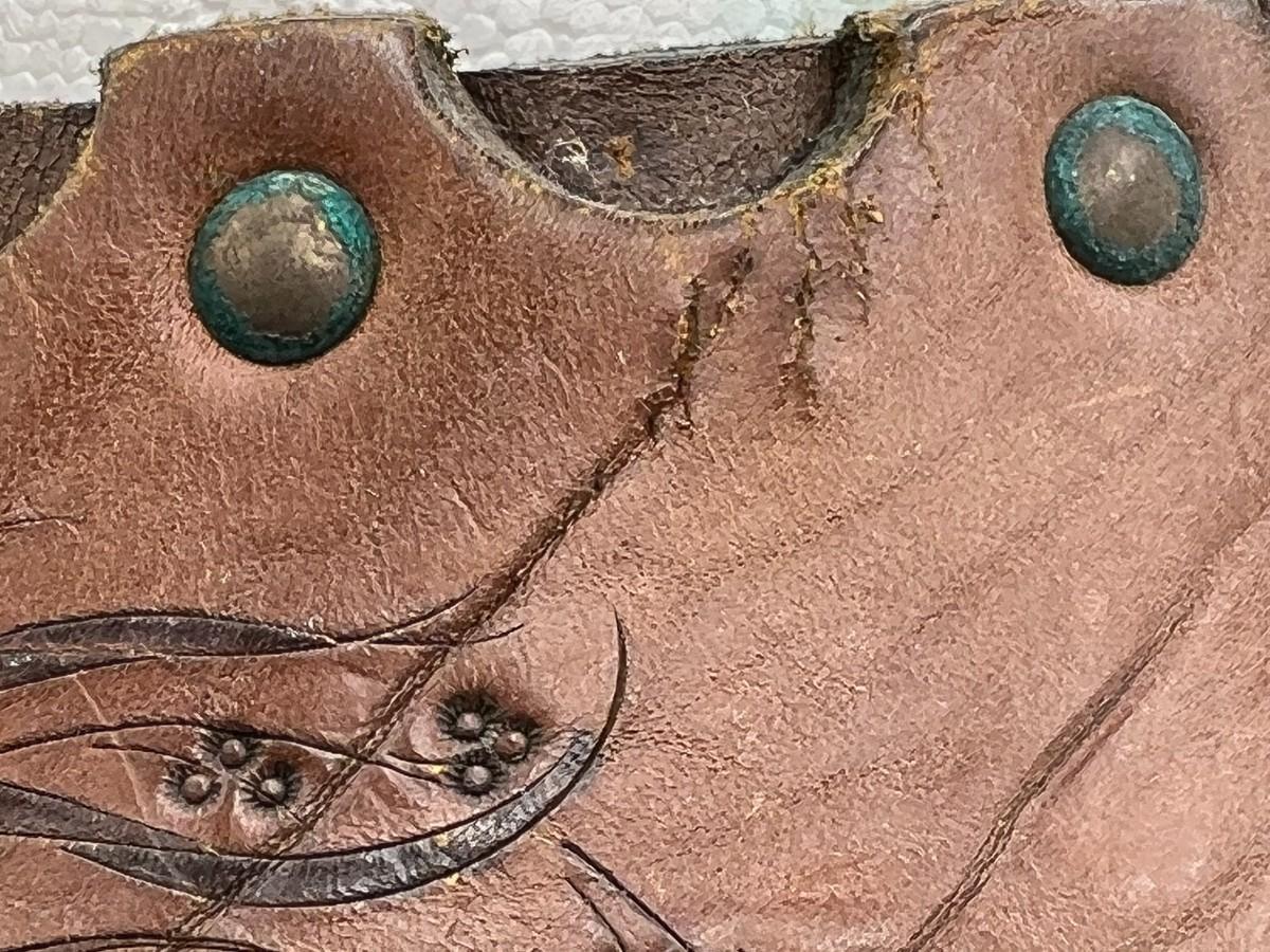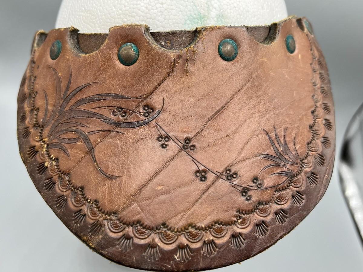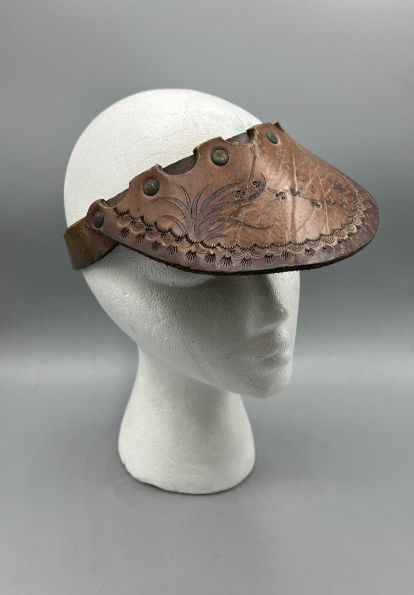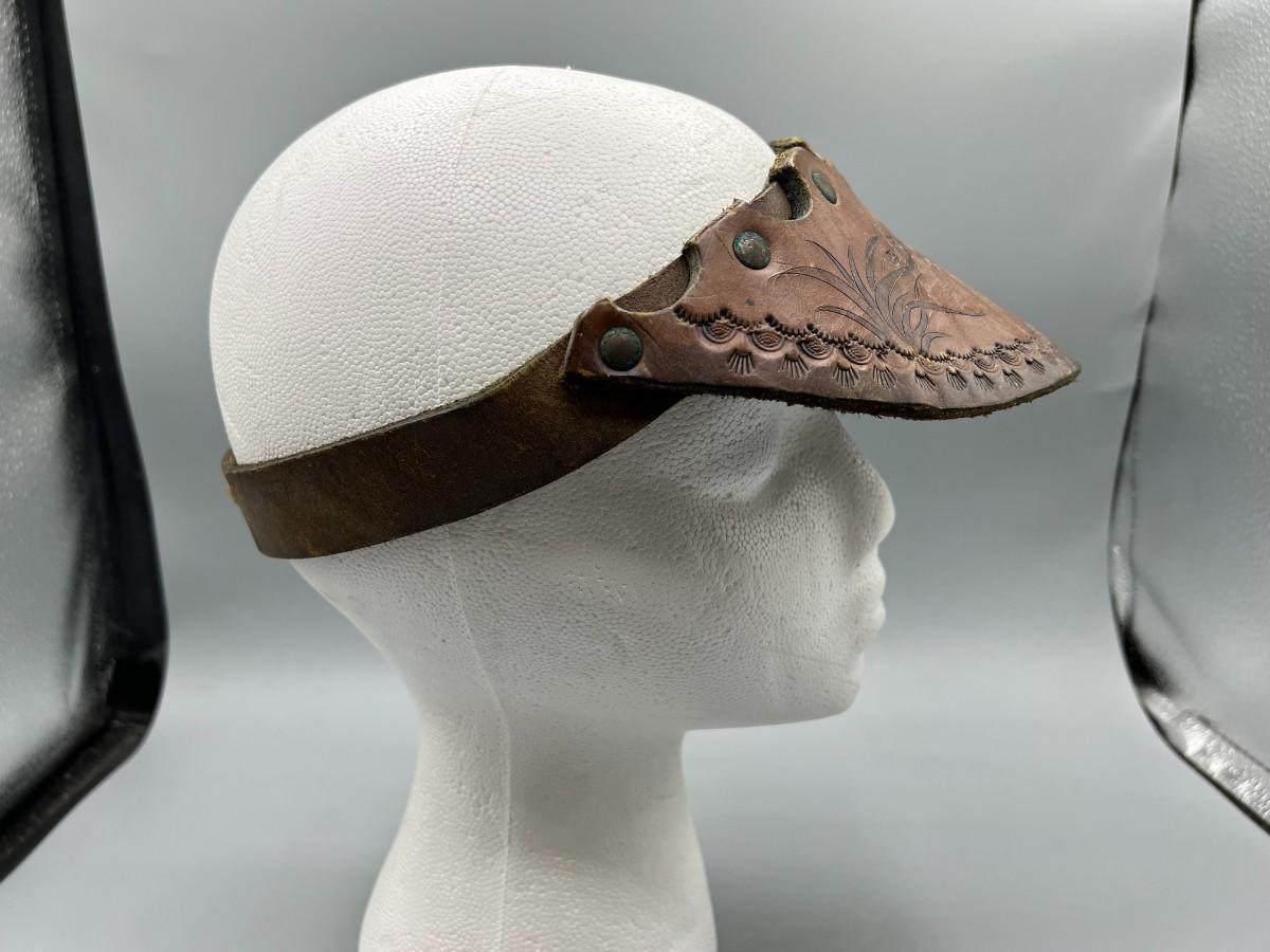 Made in Mexico Souvenir Leather Sun Visor Cap, there is some wear and some minor tearing to the leather, but there is no significant damage and is in good useable condition. Check pictures for more details and for sizing.