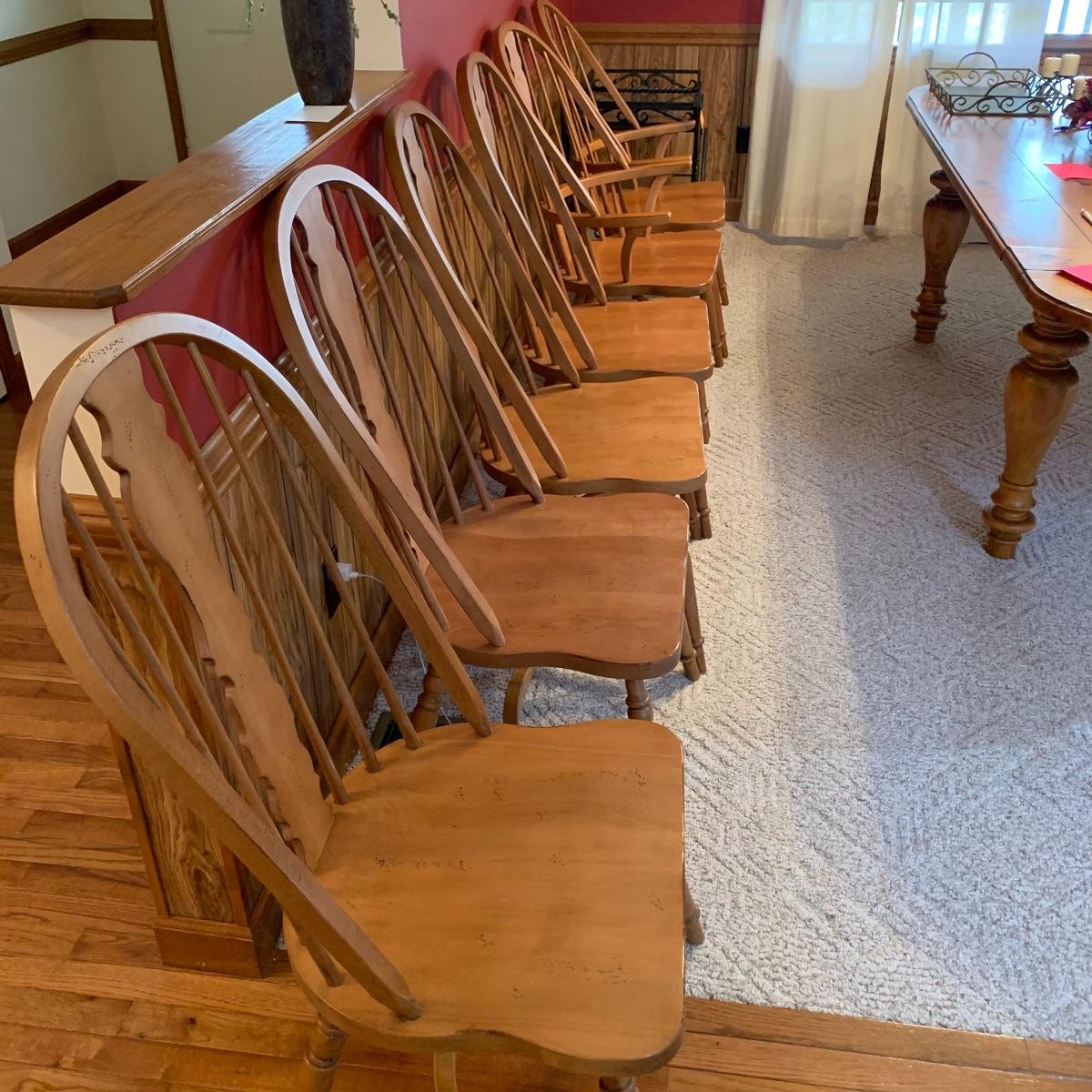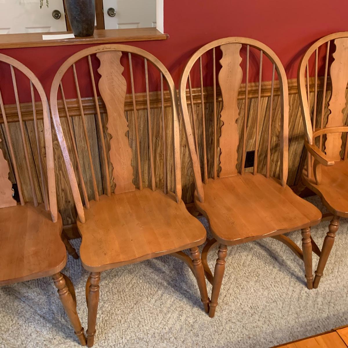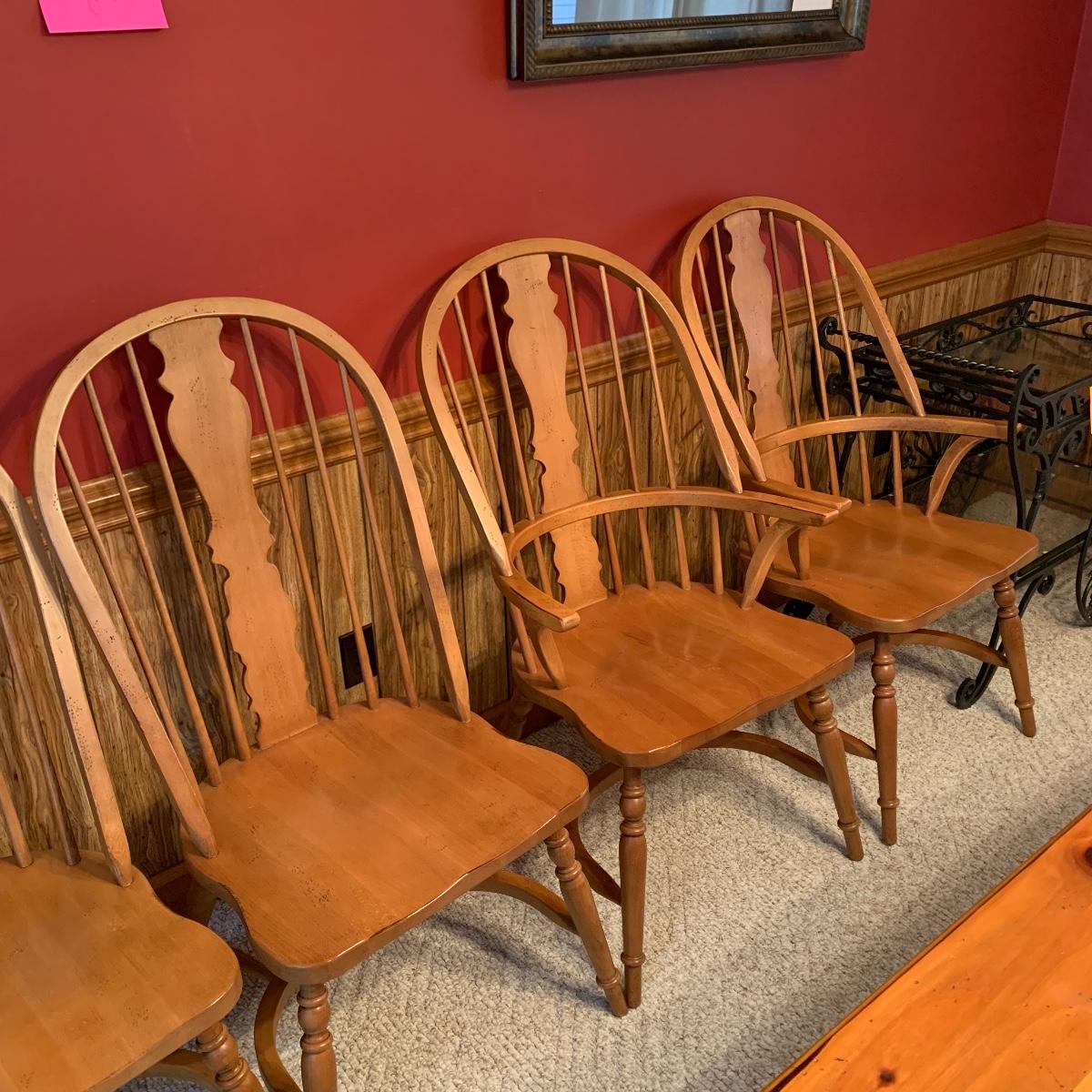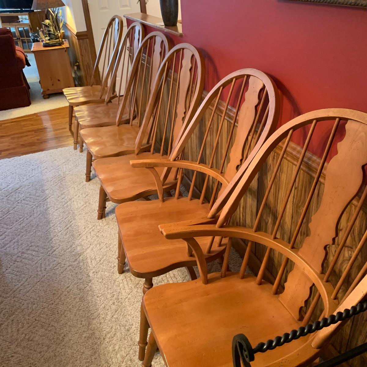 Made In Slavonia, lot includes six solid wood dining chairs. Two chairs feature Windsor style armrests and the others do not. Each chair measures 20” wide X 18” depth X 42” tall with a 17” seat height. All are in good condition. Local pickup only.