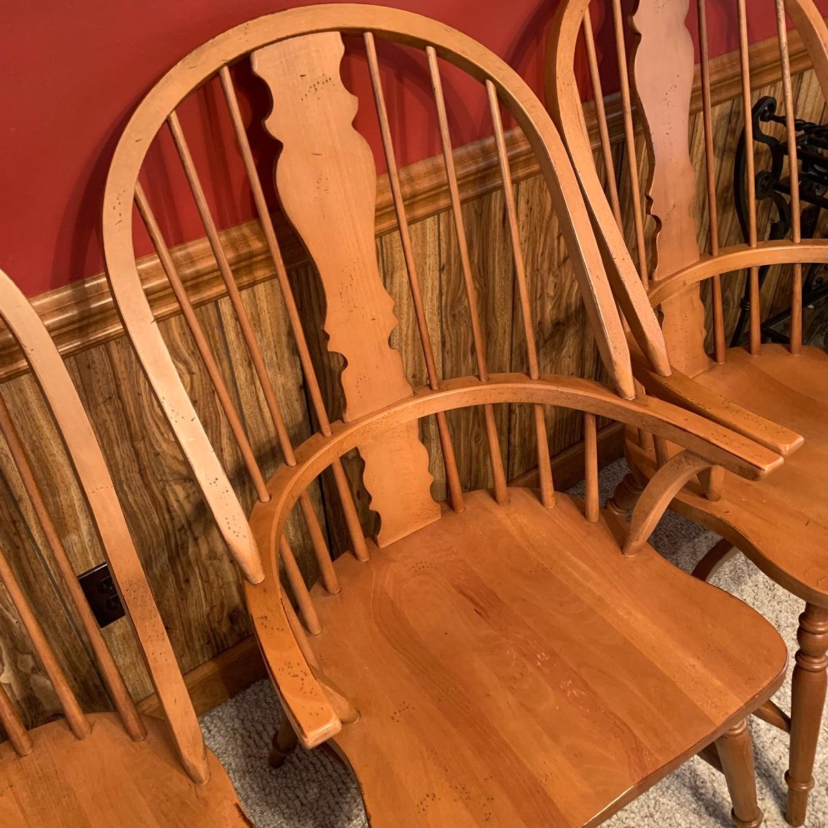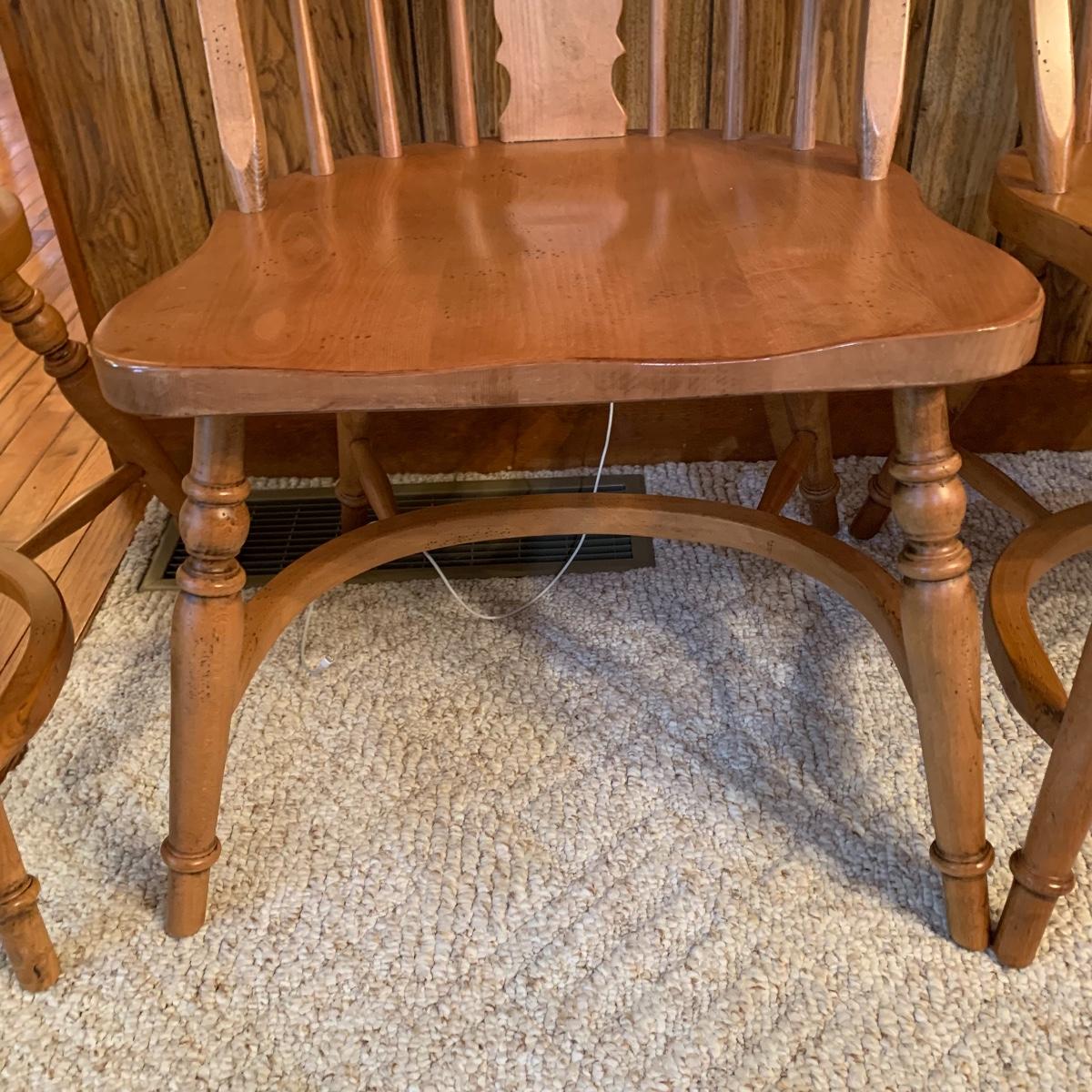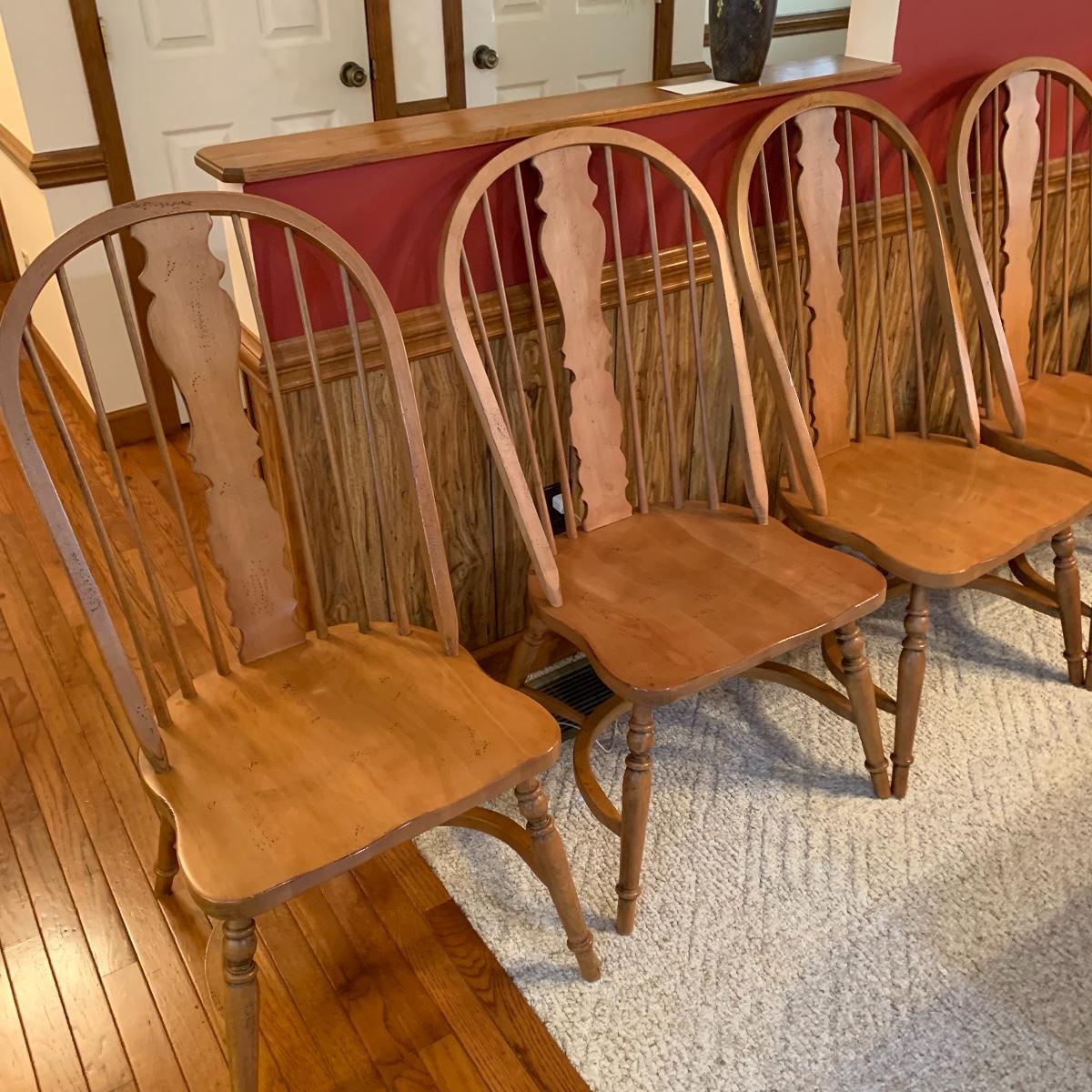 Made In Slavonia, lot includes six solid wood dining chairs. Two chairs feature Windsor style armrests and the others do not. Each chair measures 20” wide X 18” depth X 42” tall with a 17” seat height. All are in good condition. Local pickup only.