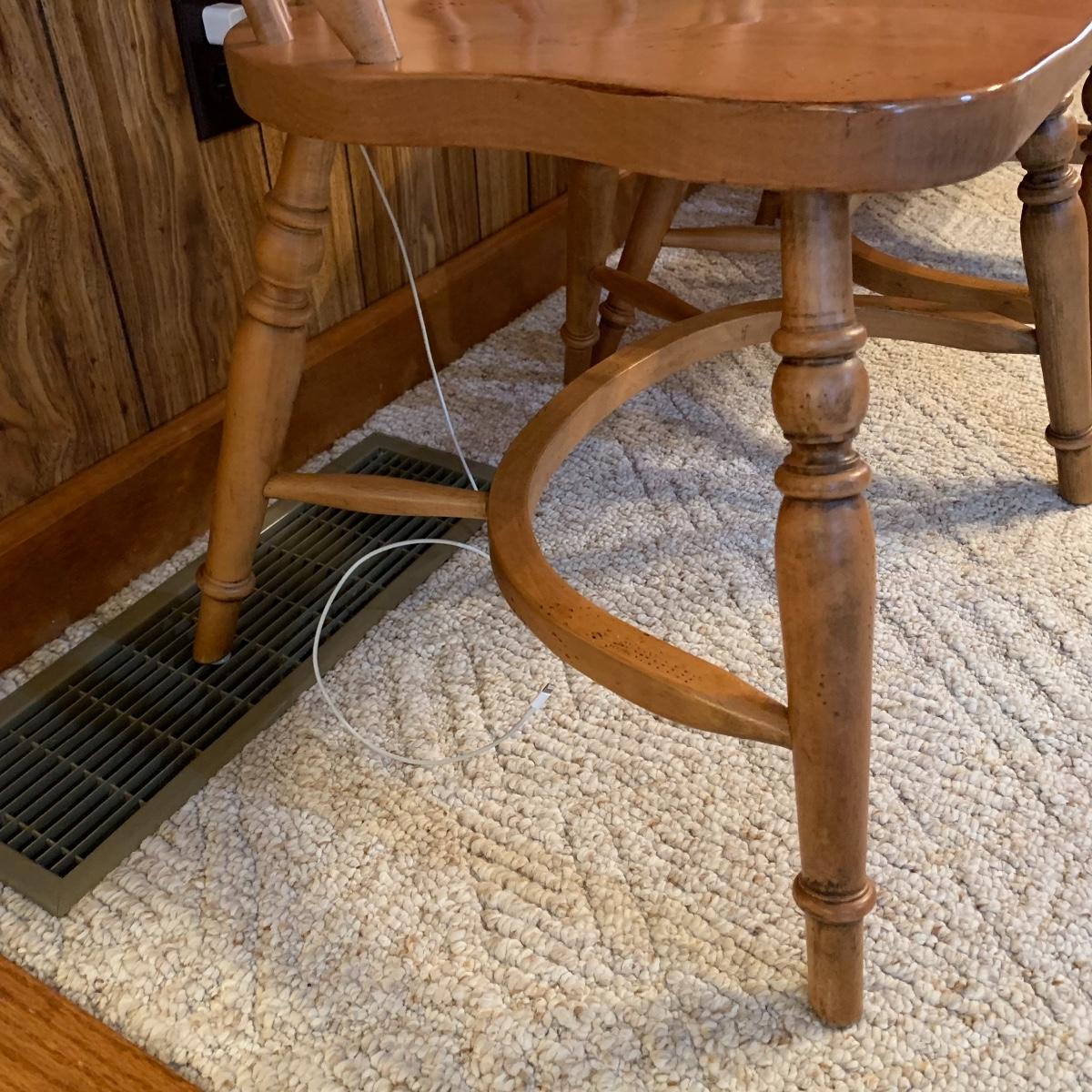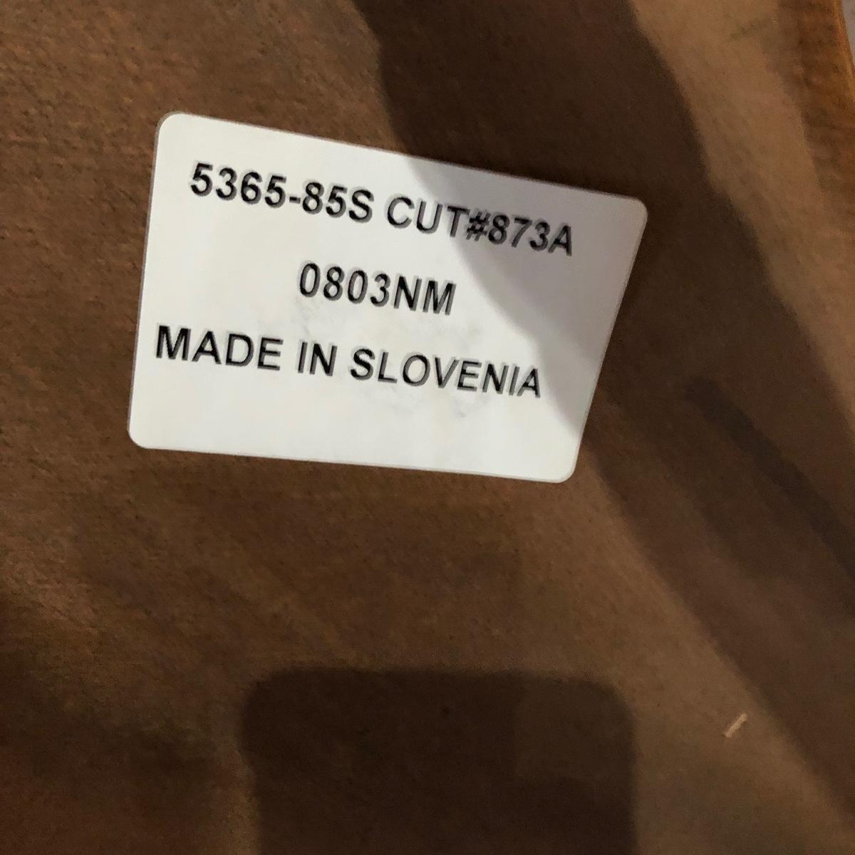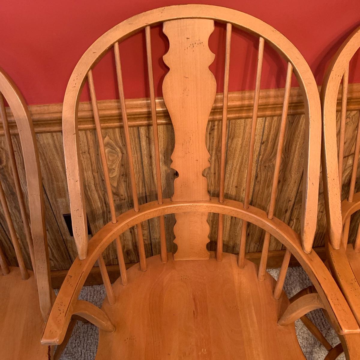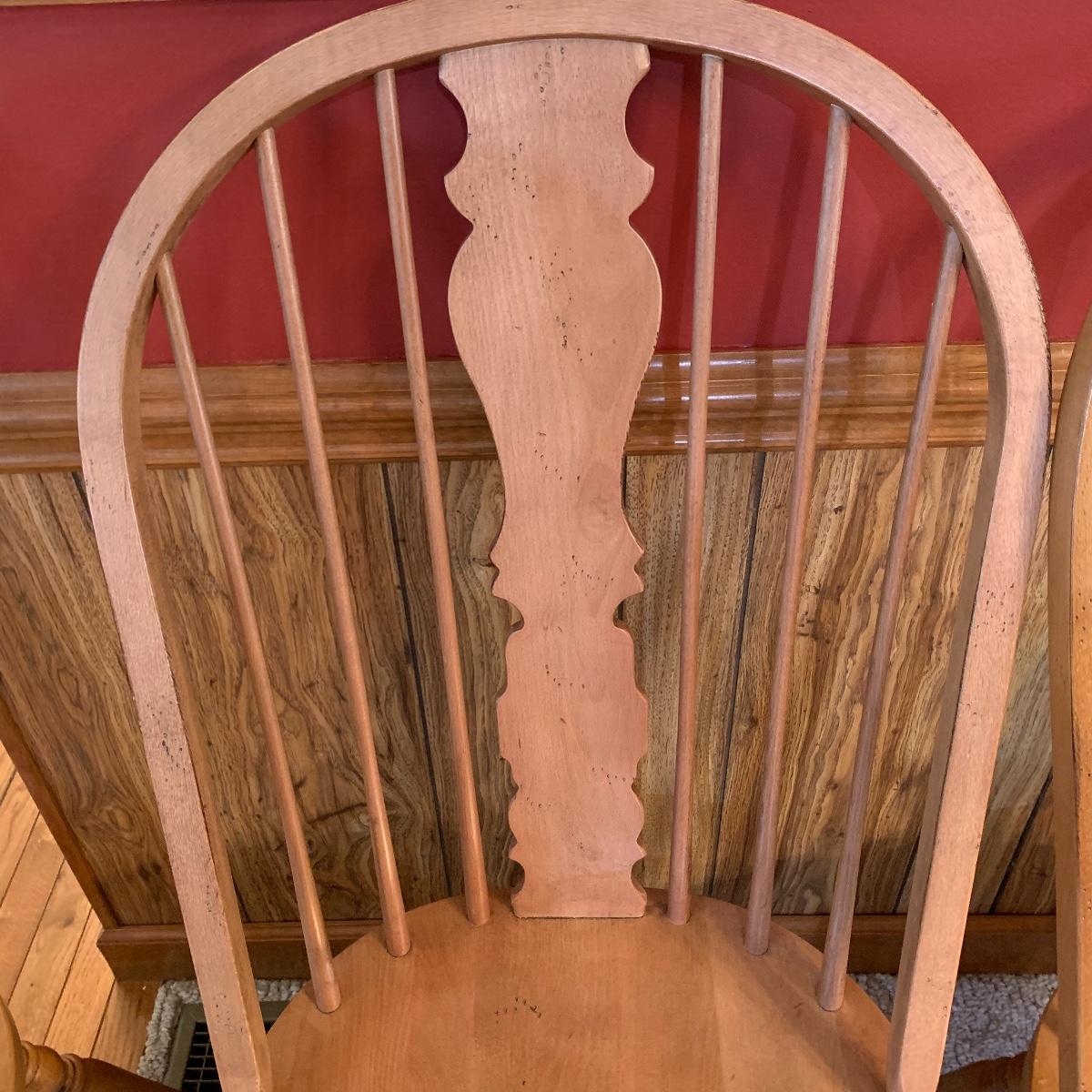 Made In Slavonia, lot includes six solid wood dining chairs. Two chairs feature Windsor style armrests and the others do not. Each chair measures 20” wide X 18” depth X 42” tall with a 17” seat height. All are in good condition. Local pickup only.