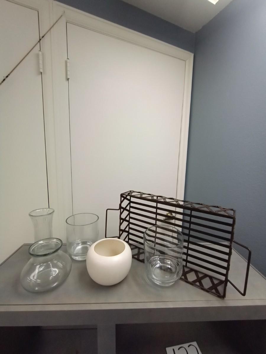 PLANTING POT STAMPED USA-METAL BASKET MEASURES APPROX. 19X10 AND GLASS VASES