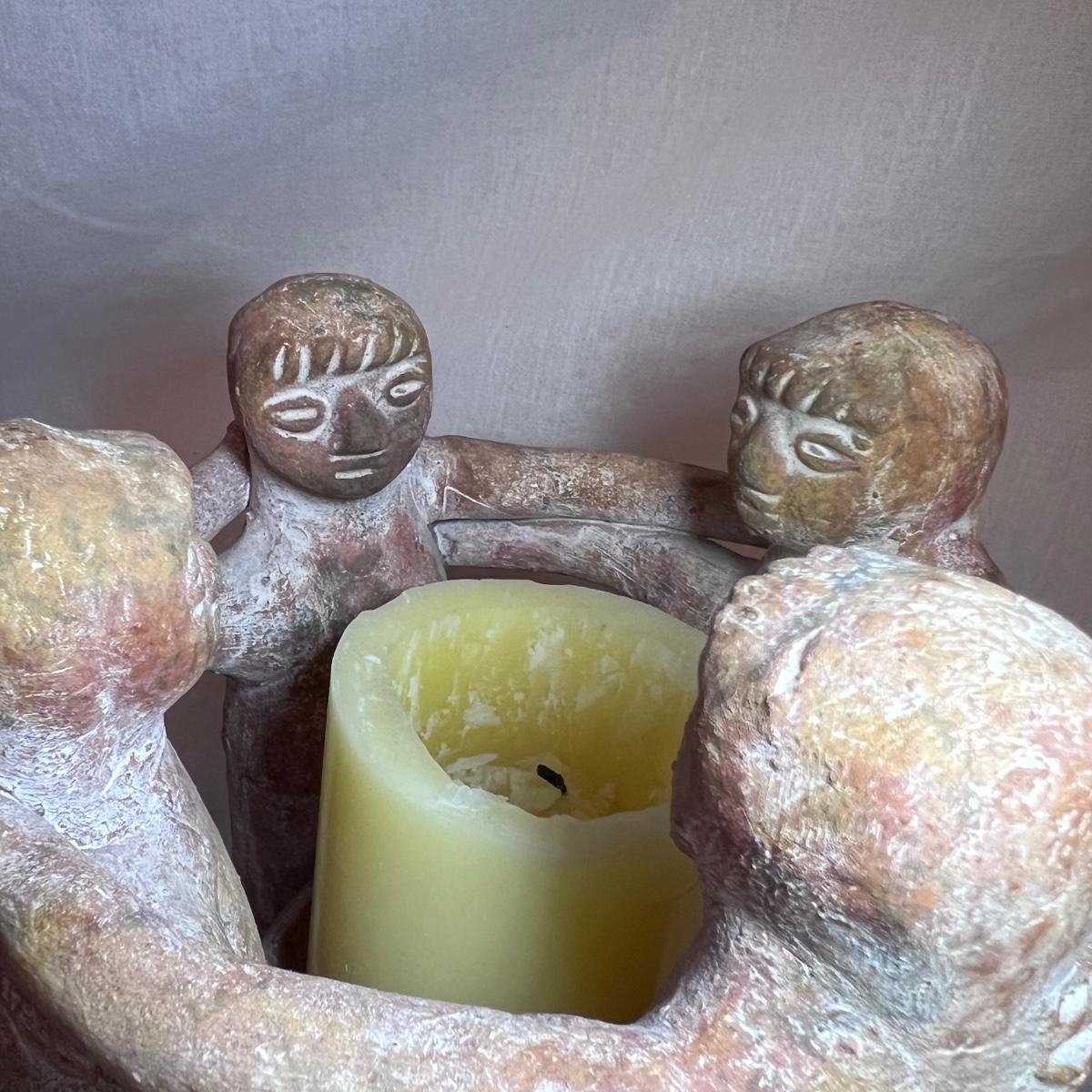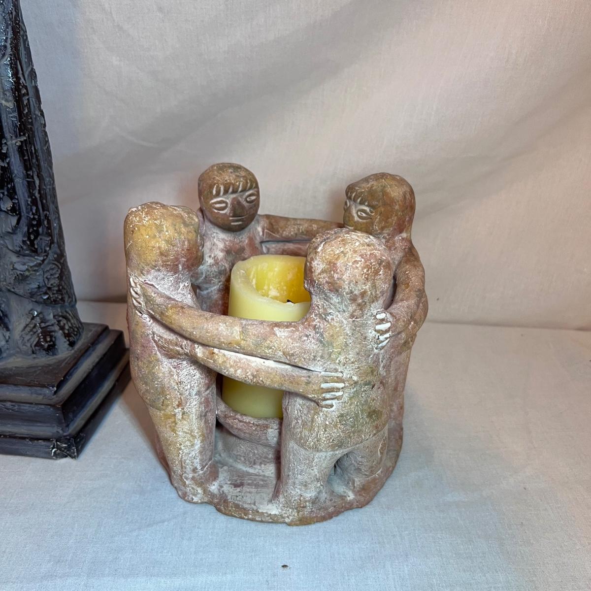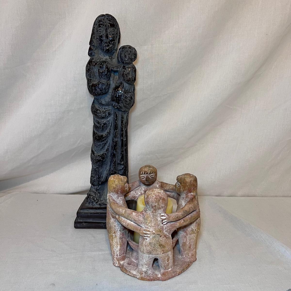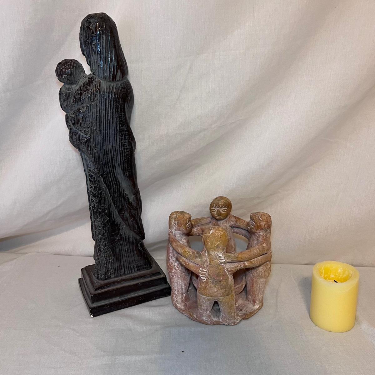 The Madonna and child statue measures 6” x 4” x 19.5”H and appears to be made of a hard resin like material. Note the small chip n the base. The Circle of Friends candle holder is ceramic.