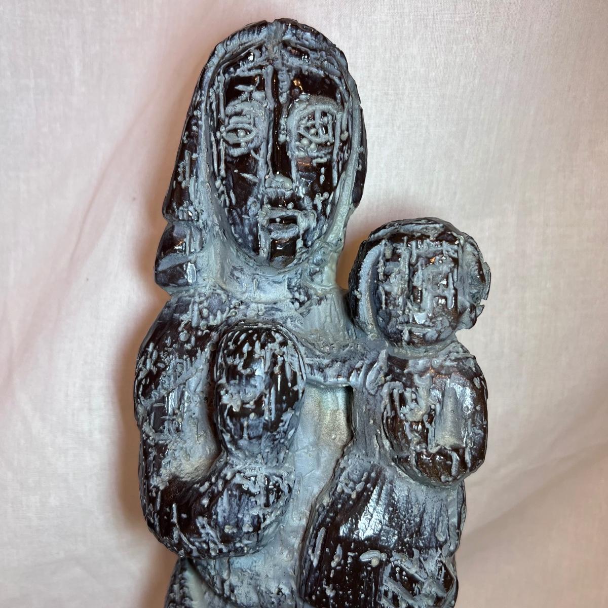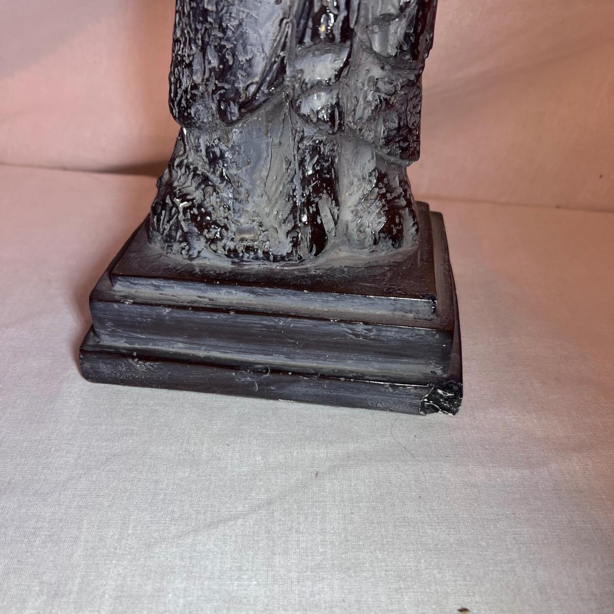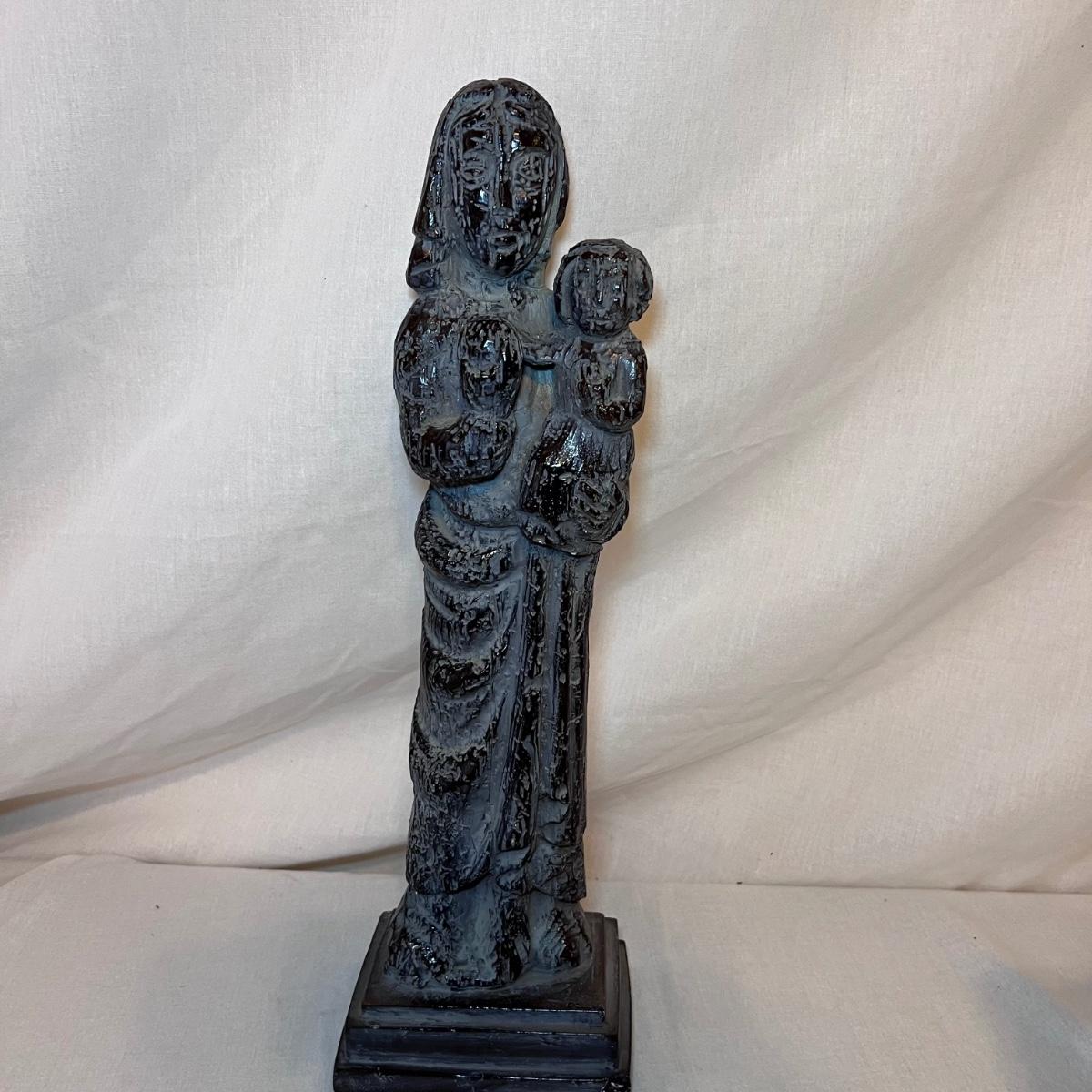 The Madonna and child statue measures 6” x 4” x 19.5”H and appears to be made of a hard resin like material. Note the small chip n the base. The Circle of Friends candle holder is ceramic.