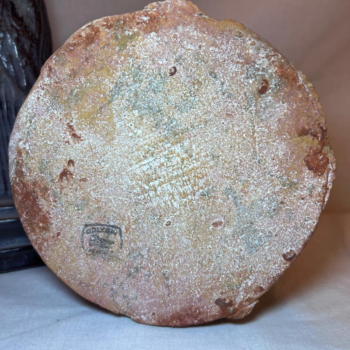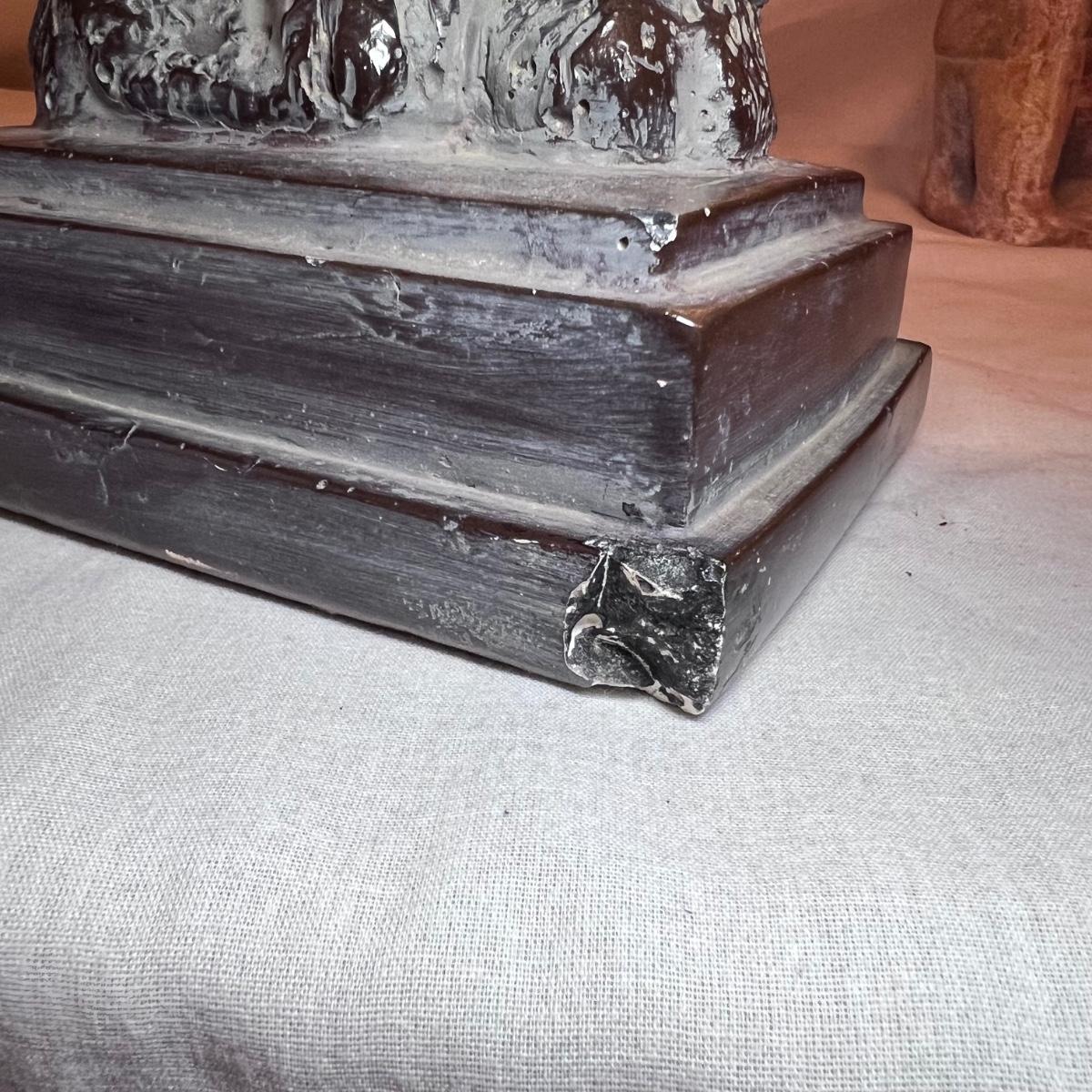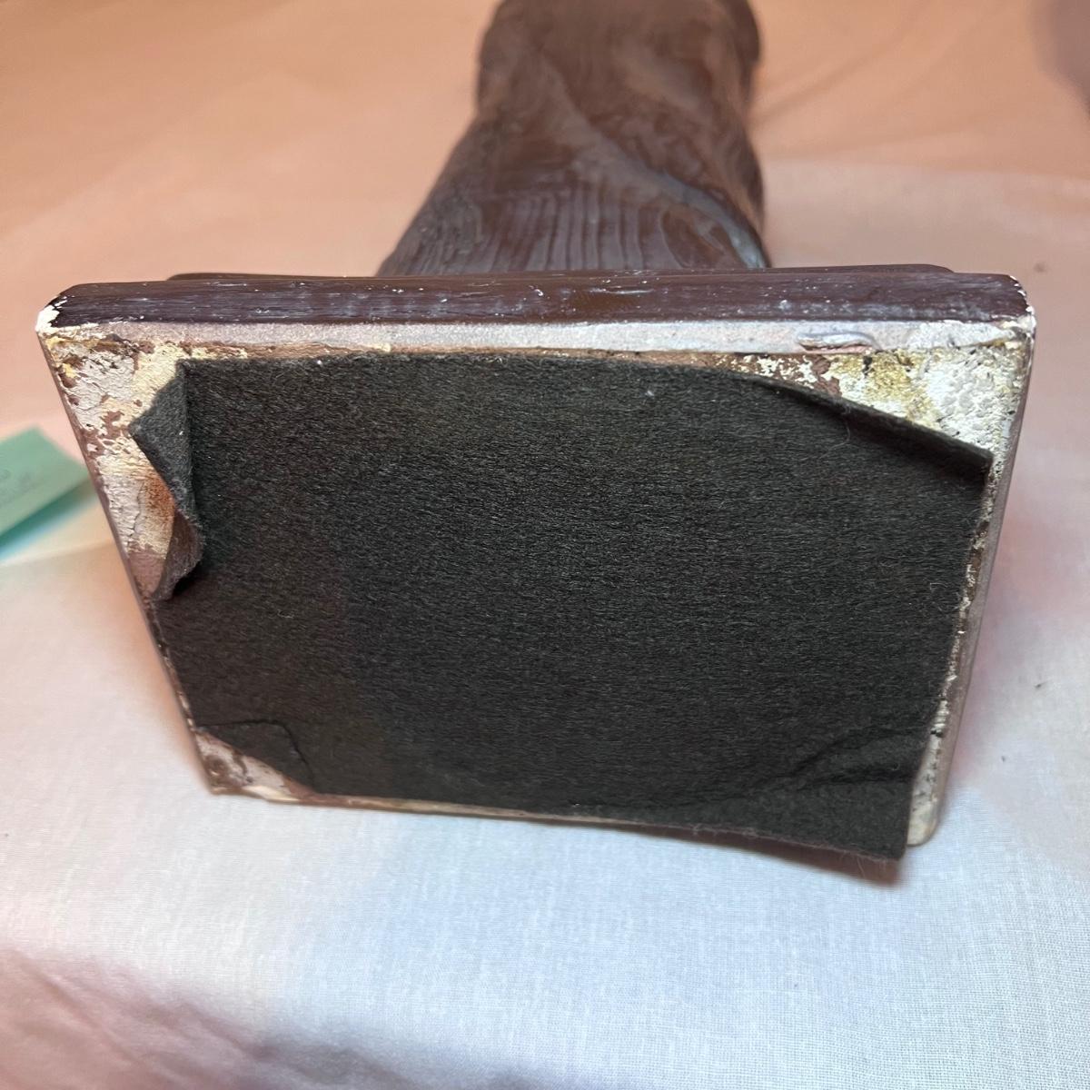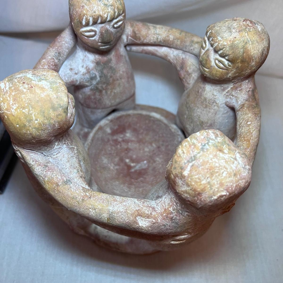 The Madonna and child statue measures 6” x 4” x 19.5”H and appears to be made of a hard resin like material. Note the small chip n the base. The Circle of Friends candle holder is ceramic.