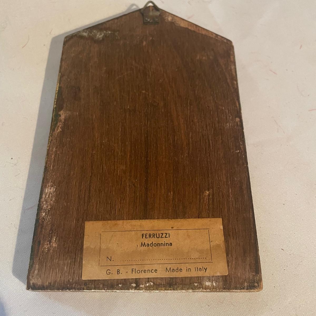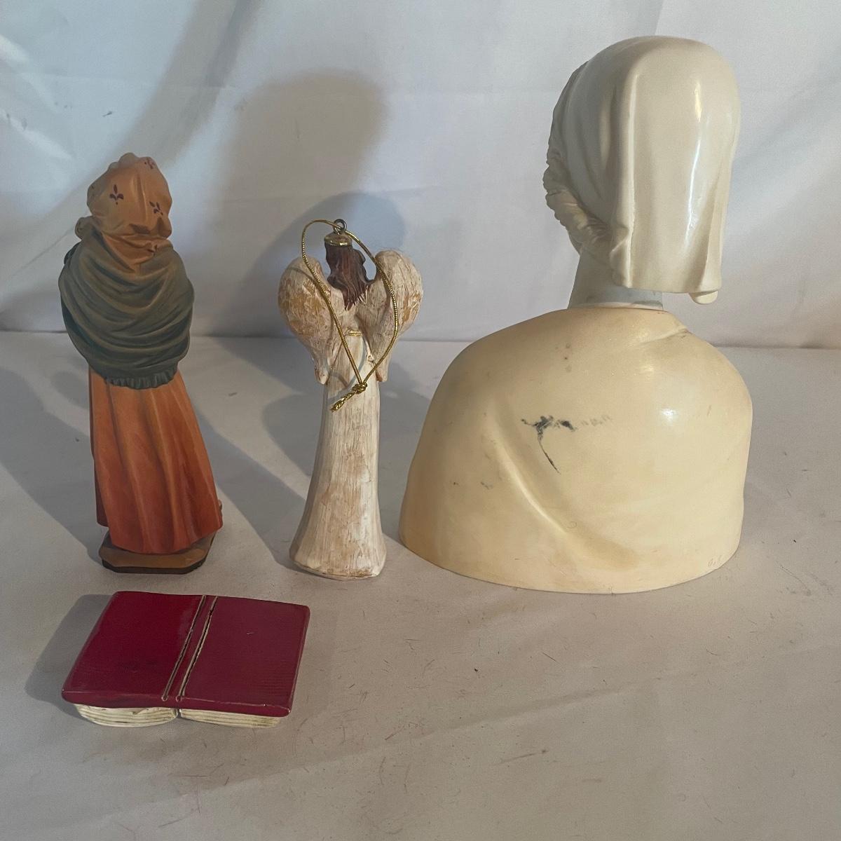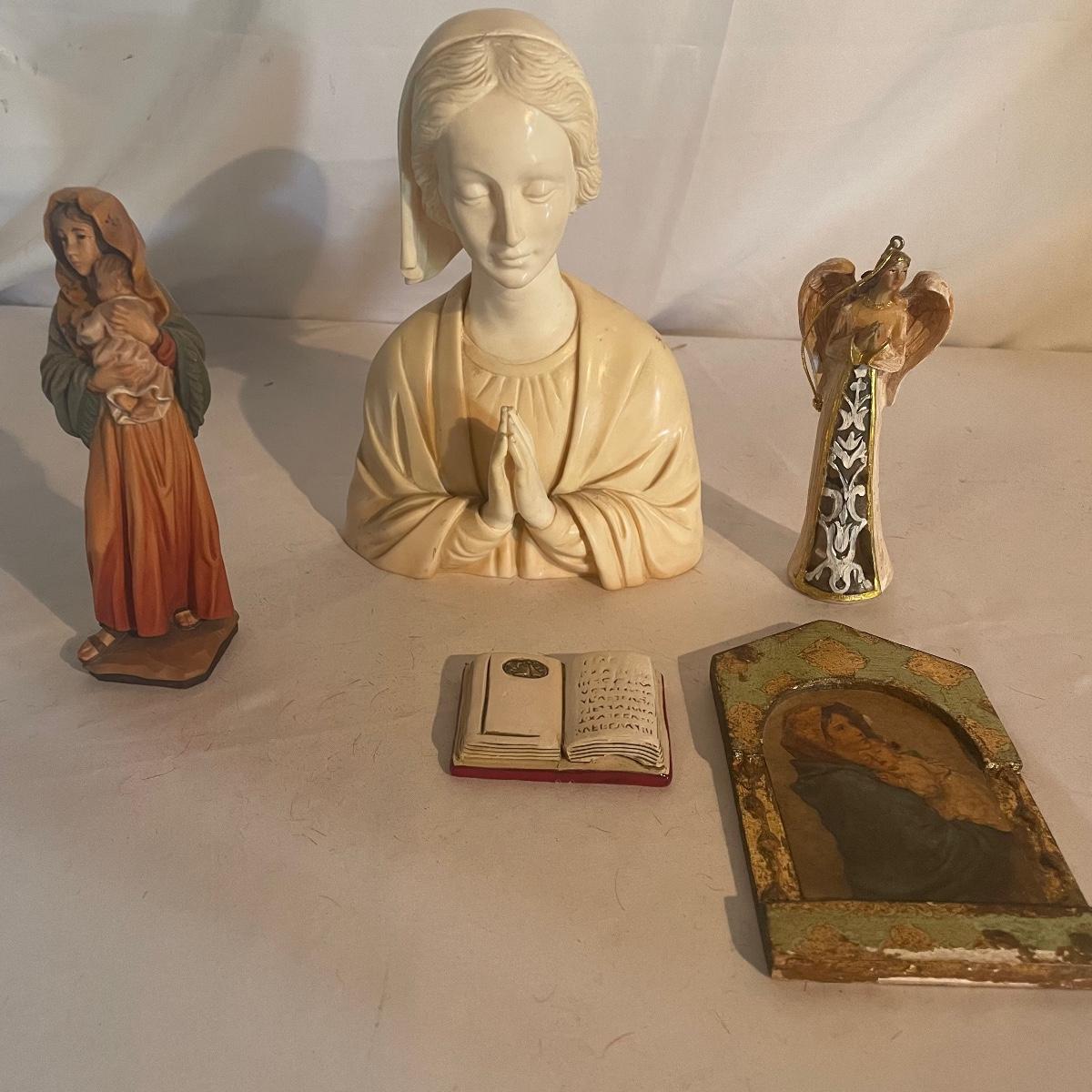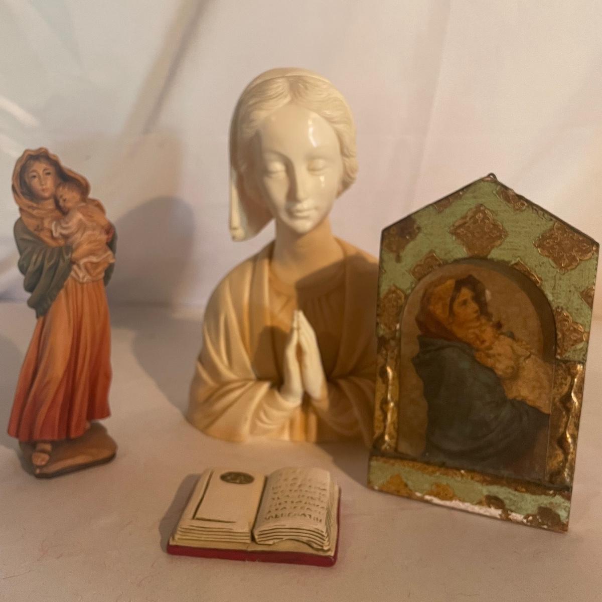 There are five items in this lot: The wooden plaque art of Madonnina is by Feruzzi and was made in Italy; there is an area that is white that looks like the paint has worn away, see image. Also included is another Madonna figurine made of wood, a wood angel hanging ornament, a miniature ceramic book and a Bianchi bust sculpture (also Made in Italy by Bianchi) that appears to be made of a heavy resin; it has a small ink mark on the back shown in an image.