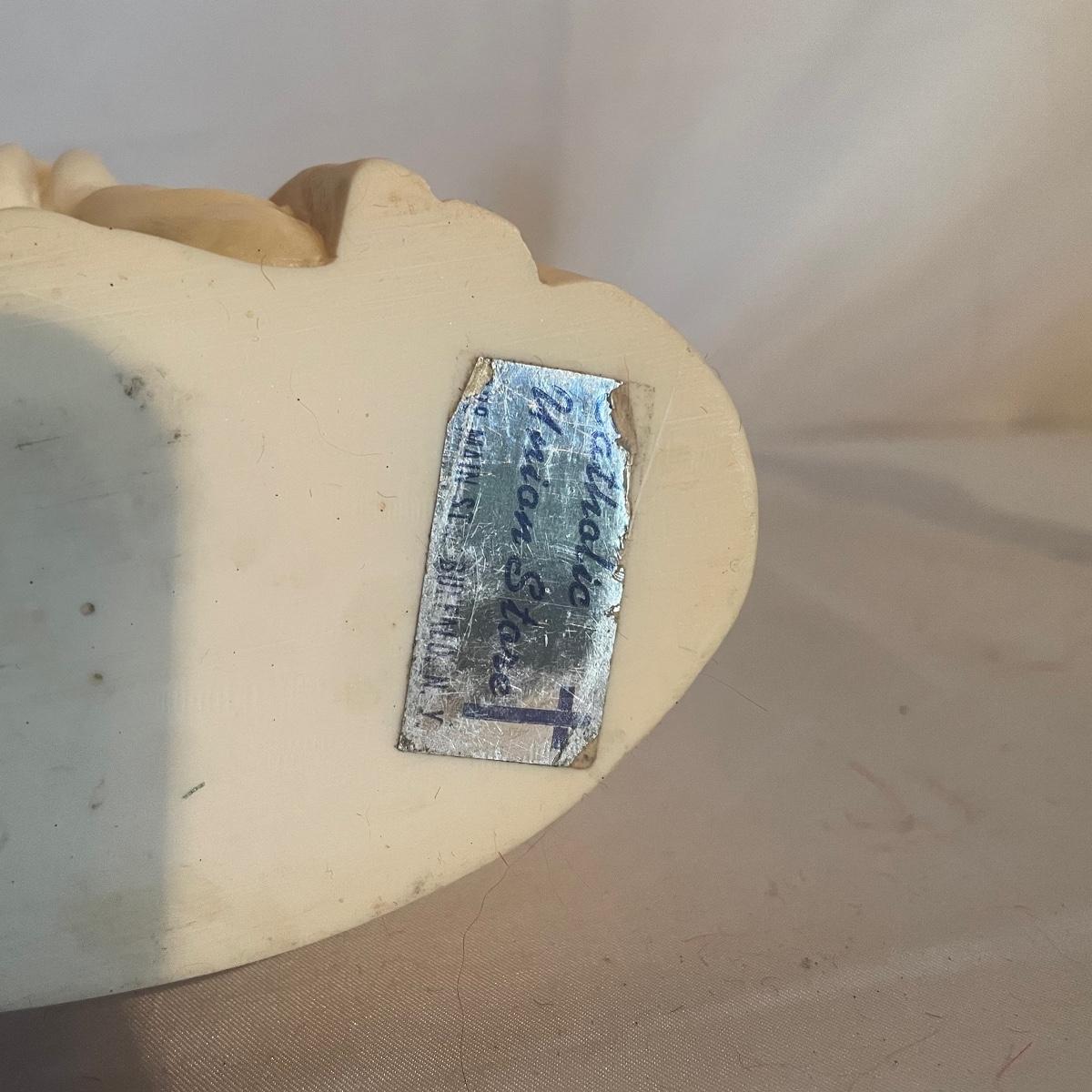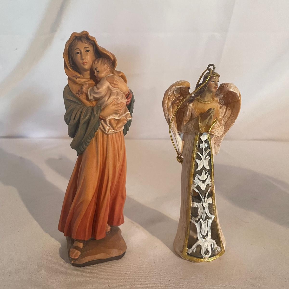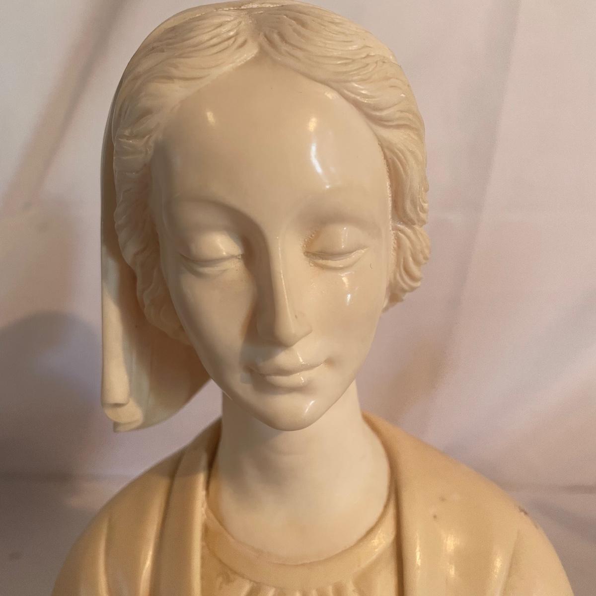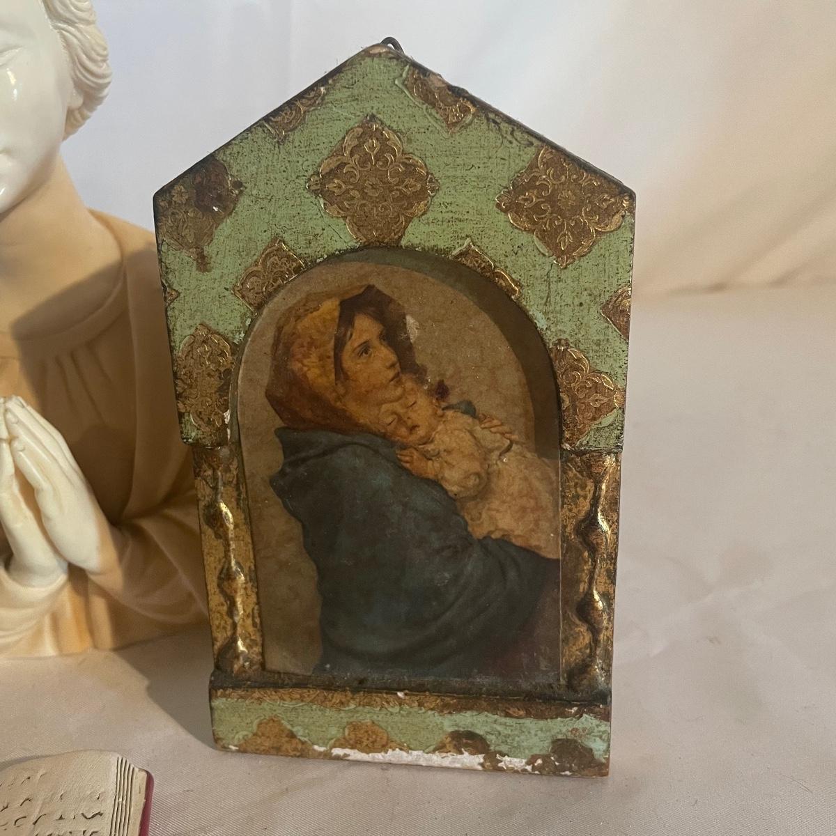 There are five items in this lot: The wooden plaque art of Madonnina is by Feruzzi and was made in Italy; there is an area that is white that looks like the paint has worn away, see image. Also included is another Madonna figurine made of wood, a wood angel hanging ornament, a miniature ceramic book and a Bianchi bust sculpture (also Made in Italy by Bianchi) that appears to be made of a heavy resin; it has a small ink mark on the back shown in an image.