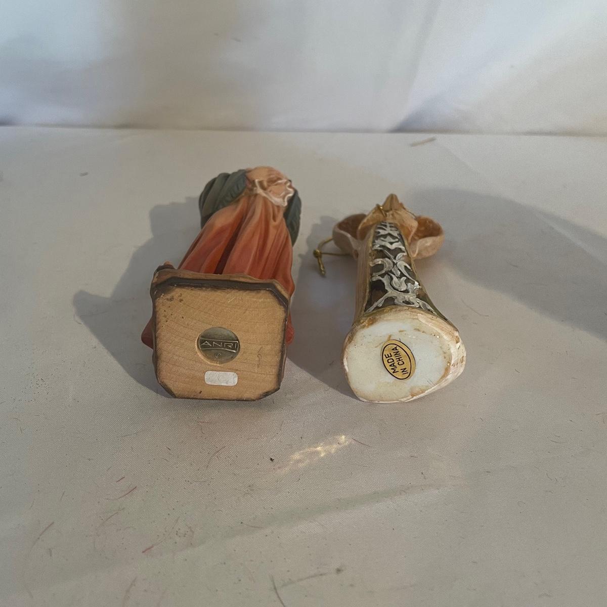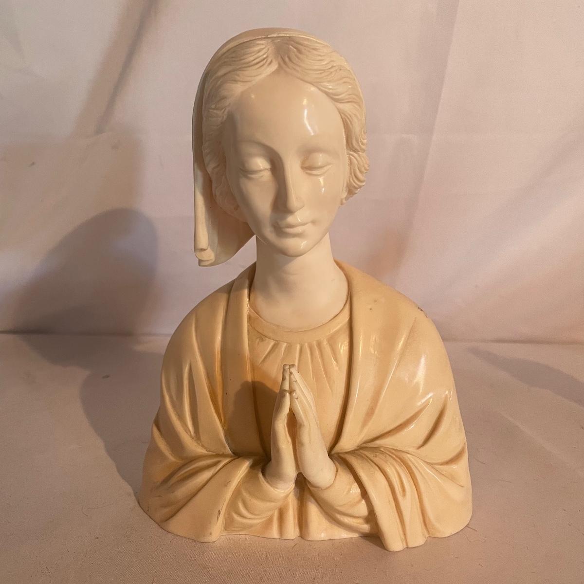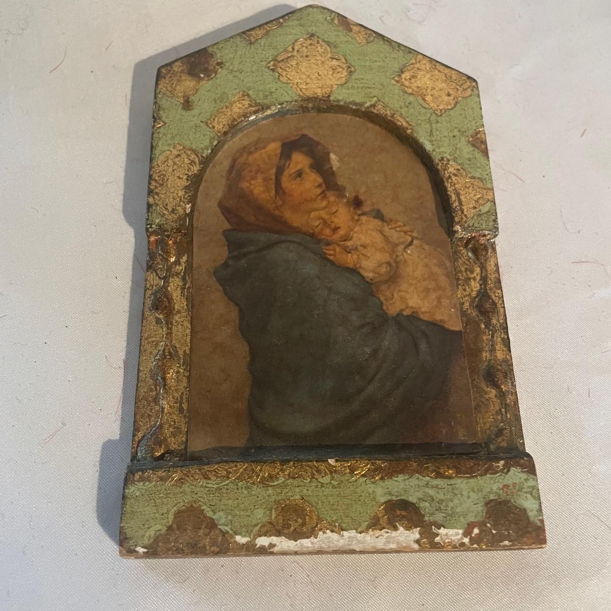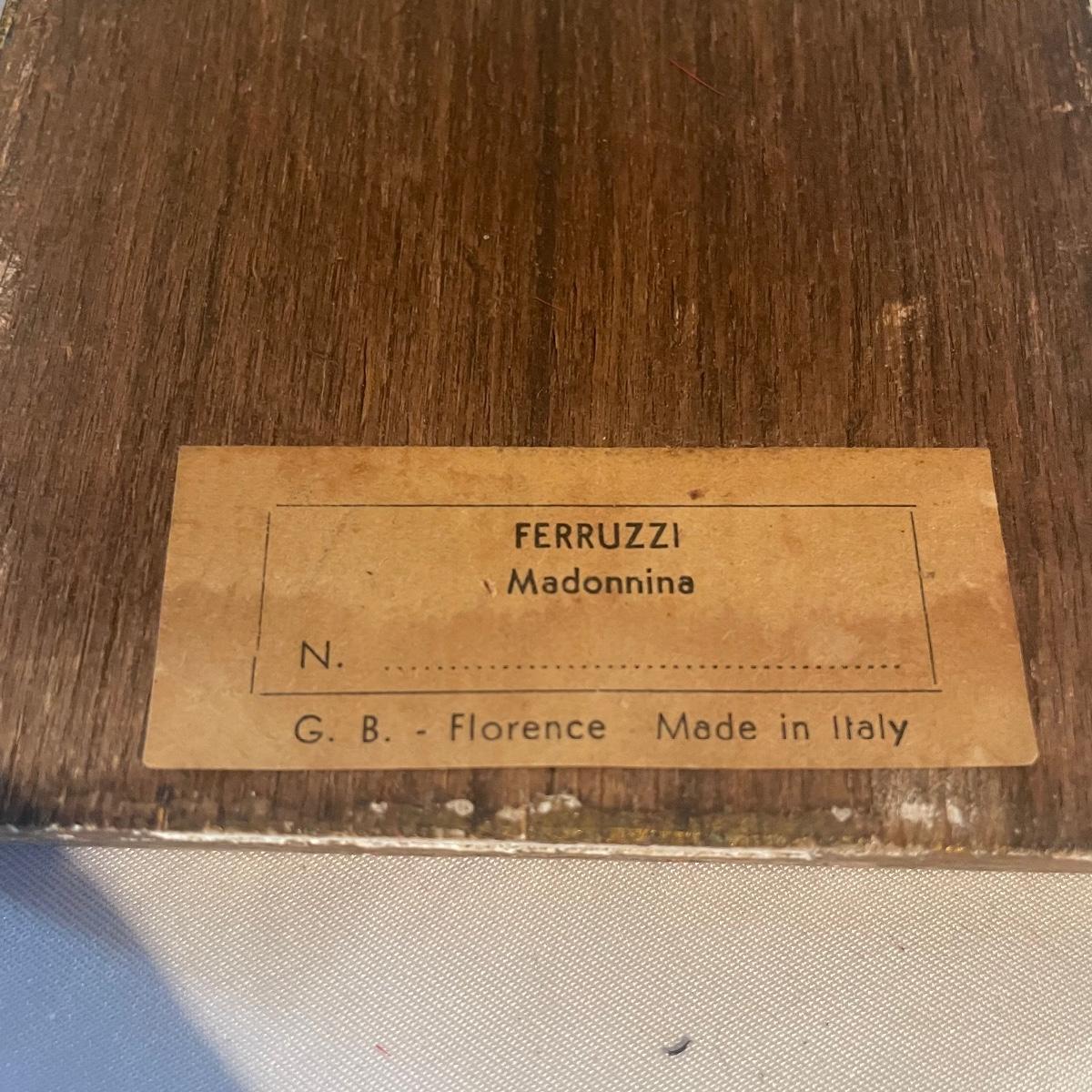 There are five items in this lot: The wooden plaque art of Madonnina is by Feruzzi and was made in Italy; there is an area that is white that looks like the paint has worn away, see image. Also included is another Madonna figurine made of wood, a wood angel hanging ornament, a miniature ceramic book and a Bianchi bust sculpture (also Made in Italy by Bianchi) that appears to be made of a heavy resin; it has a small ink mark on the back shown in an image.