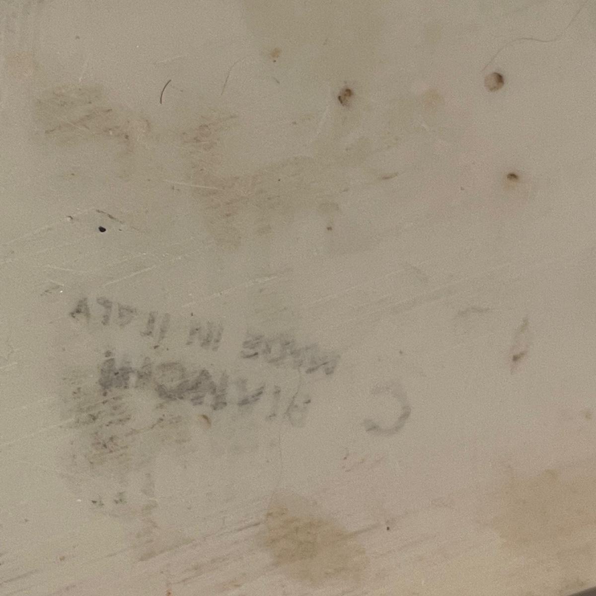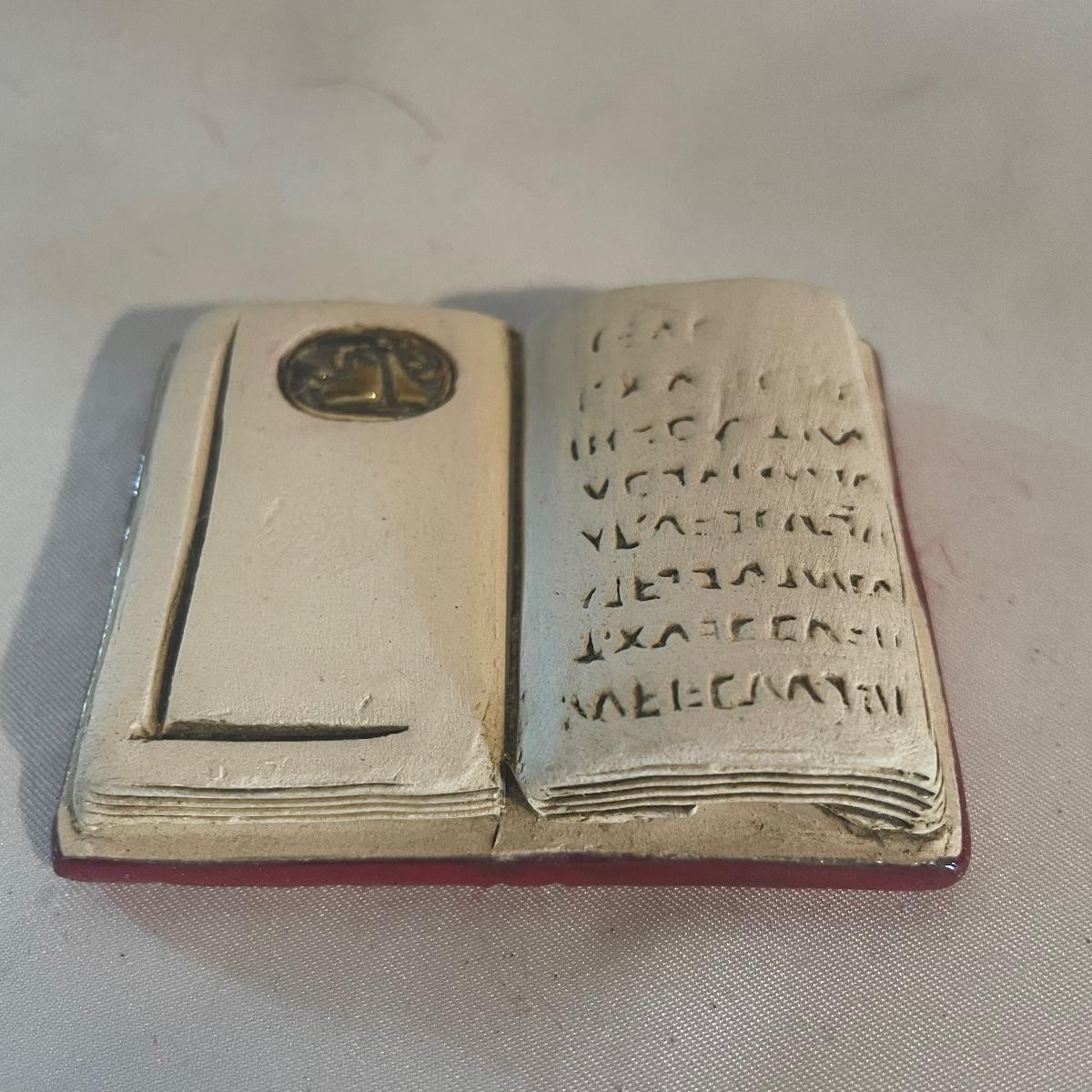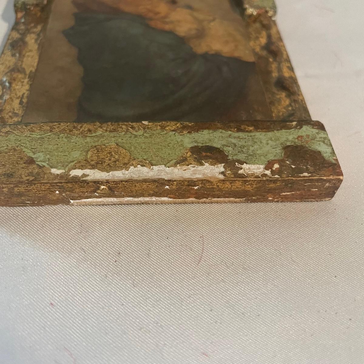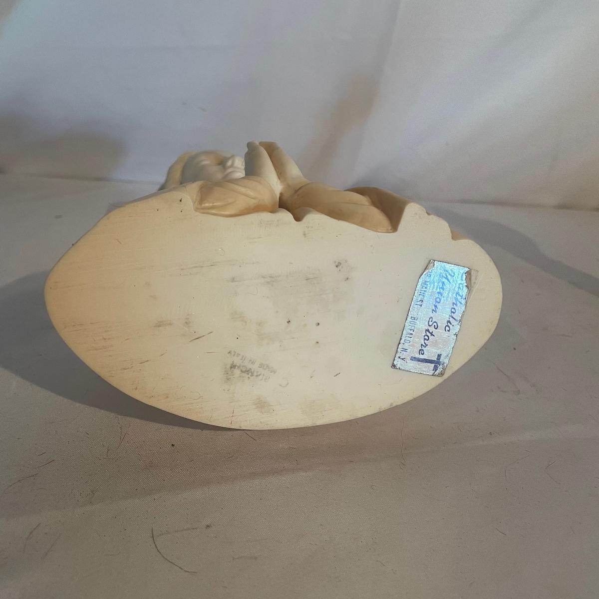 There are five items in this lot: The wooden plaque art of Madonnina is by Feruzzi and was made in Italy; there is an area that is white that looks like the paint has worn away, see image. Also included is another Madonna figurine made of wood, a wood angel hanging ornament, a miniature ceramic book and a Bianchi bust sculpture (also Made in Italy by Bianchi) that appears to be made of a heavy resin; it has a small ink mark on the back shown in an image.