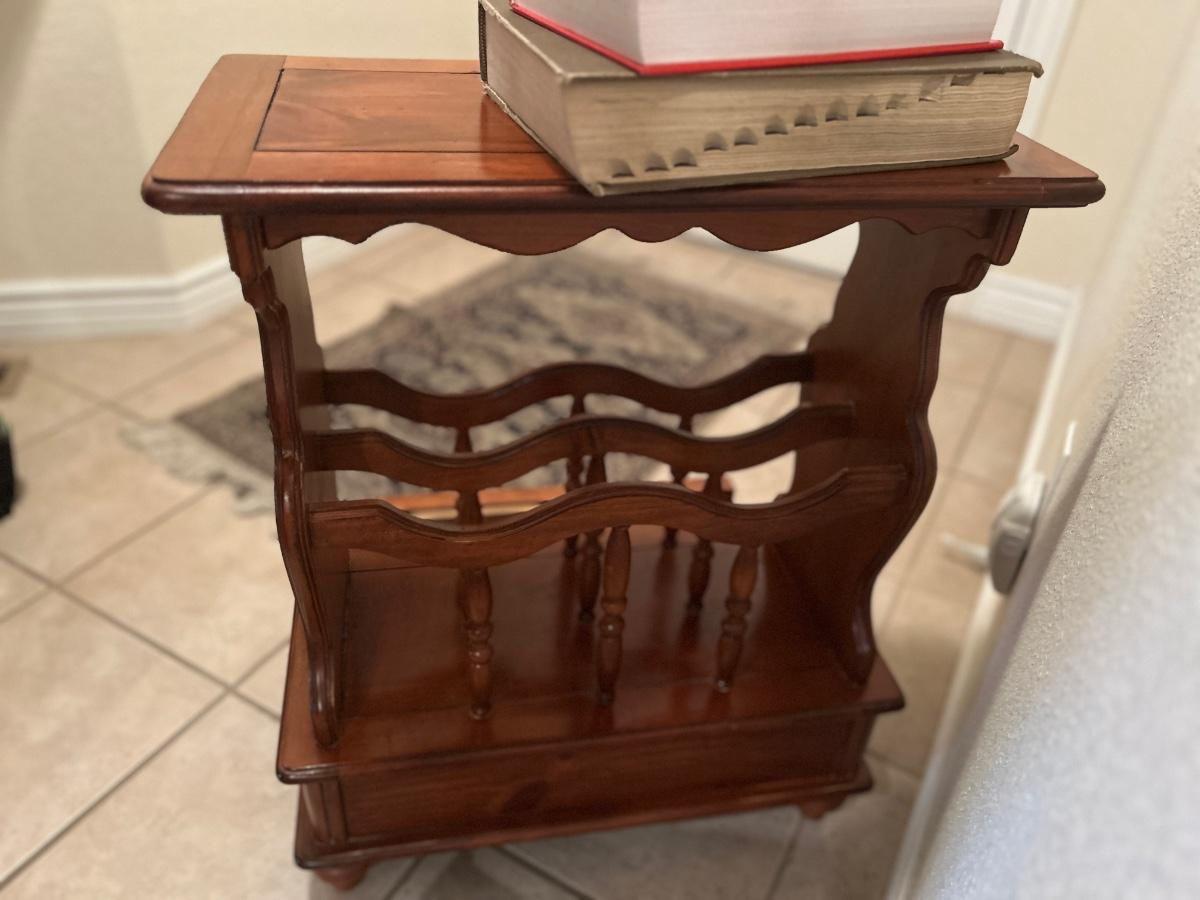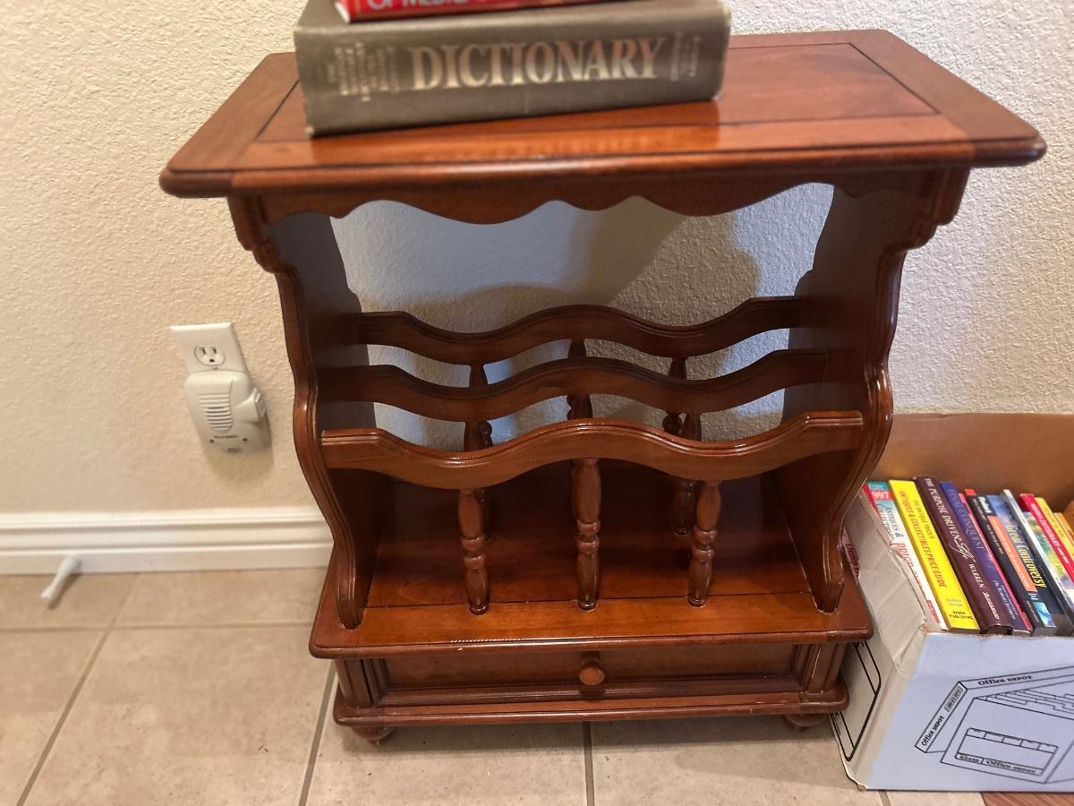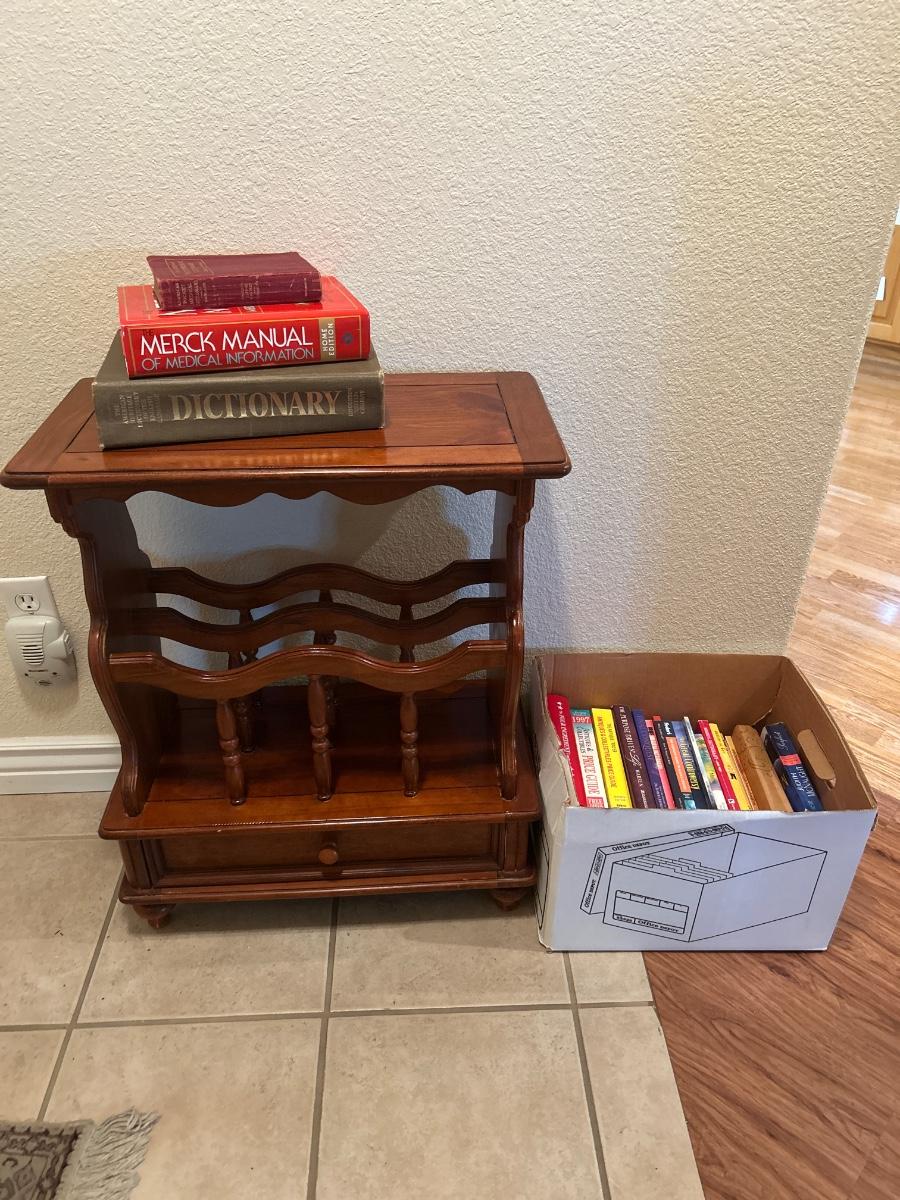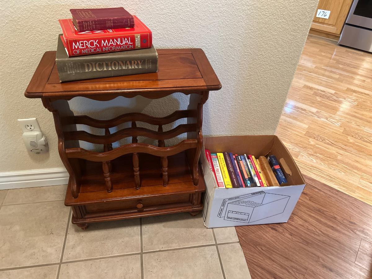 MAGAZINE /BOOK RACK TABLE AND A VARIETY BOX OF BOOKS