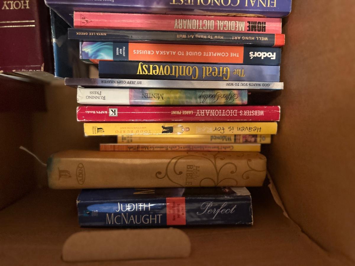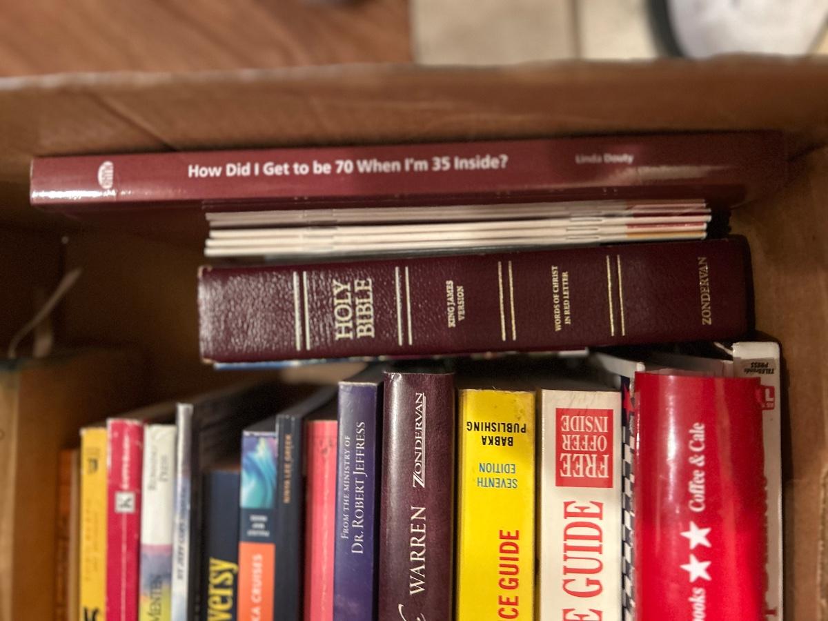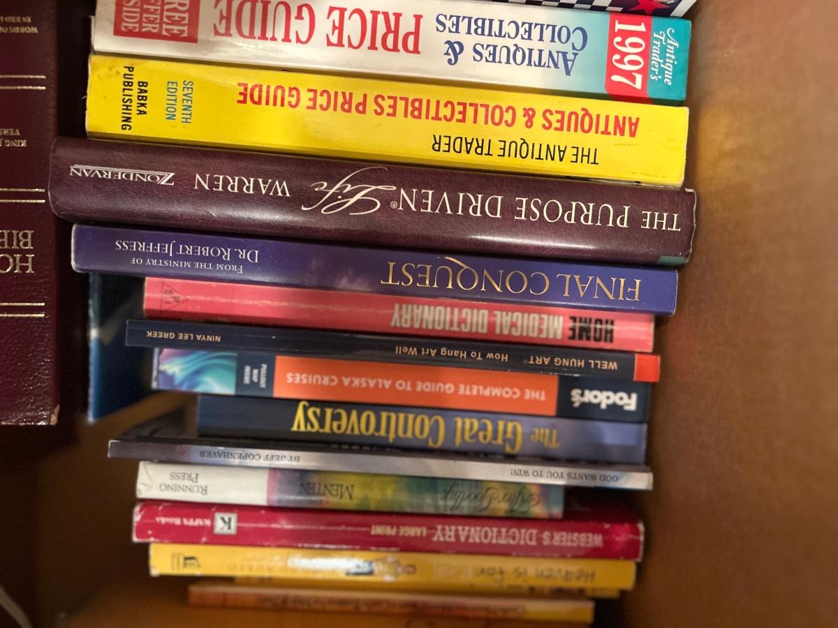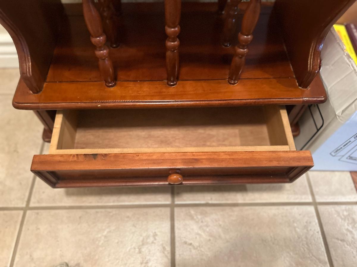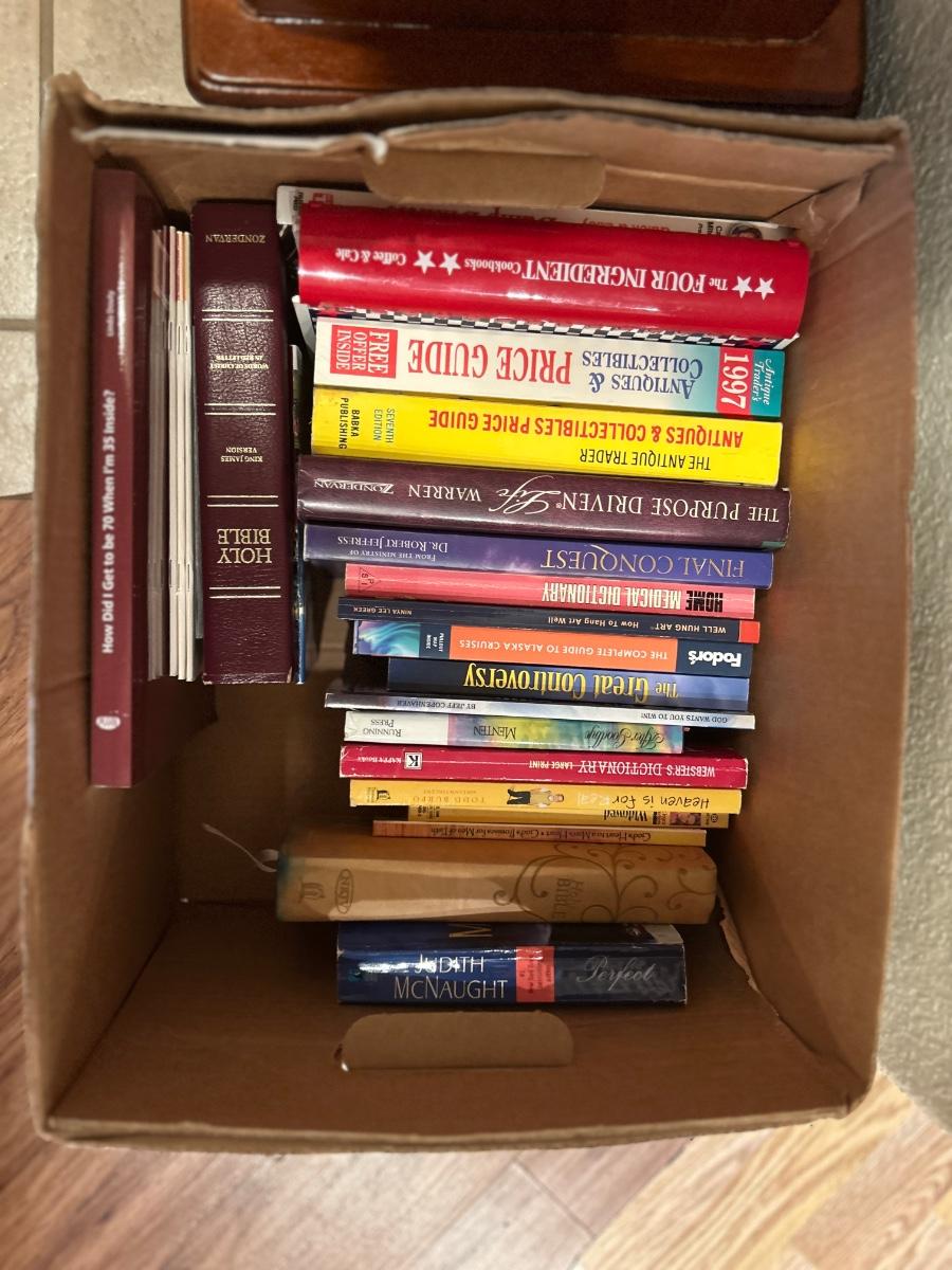 MAGAZINE /BOOK RACK TABLE AND A VARIETY BOX OF BOOKS