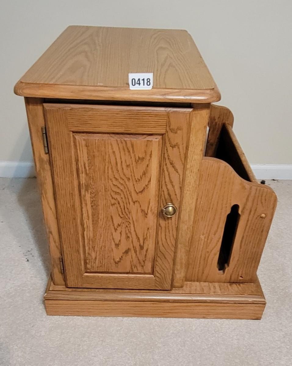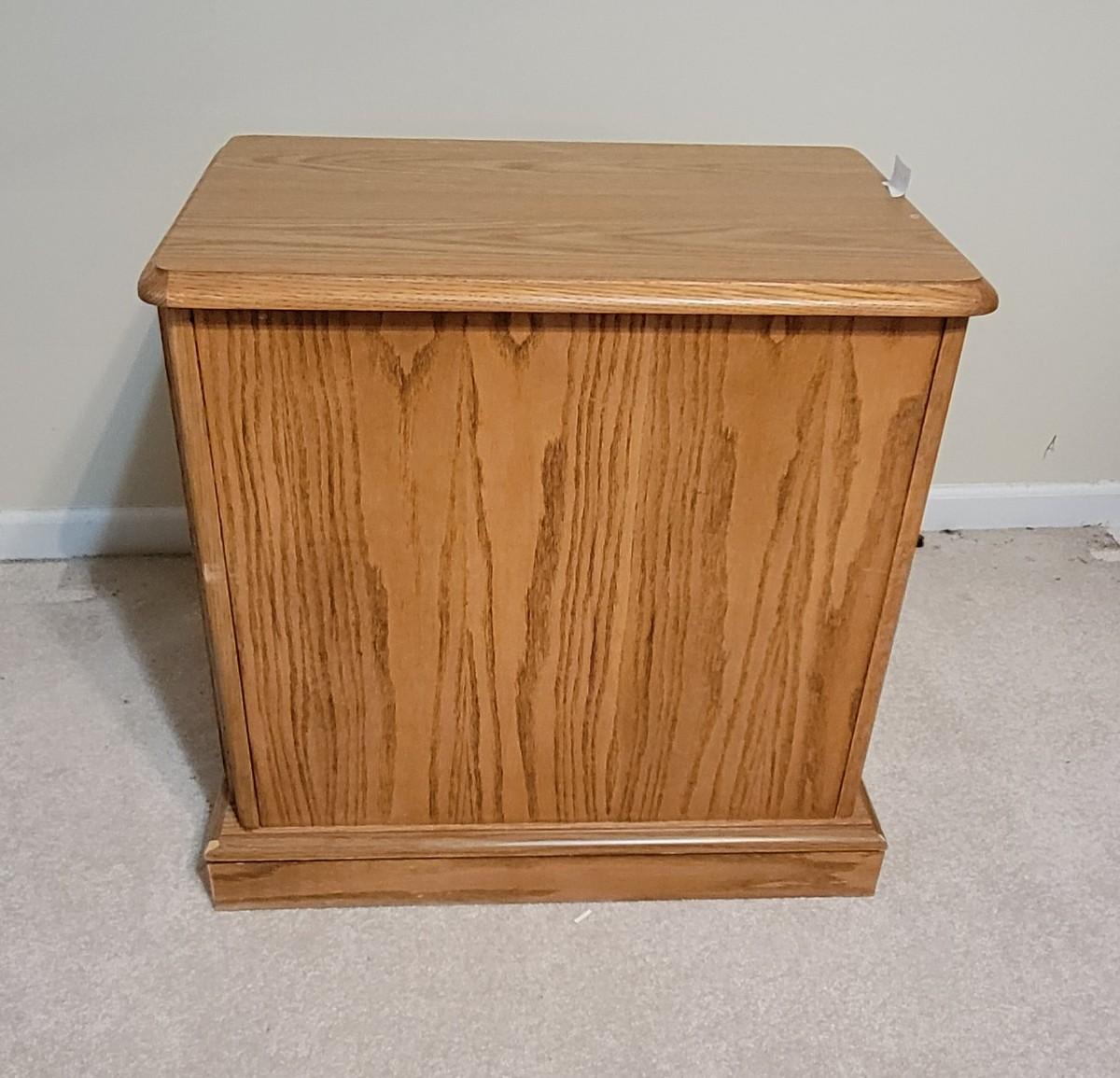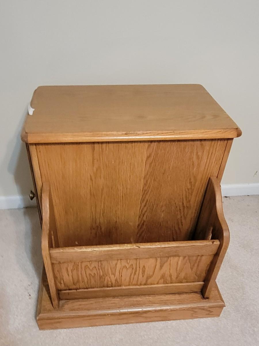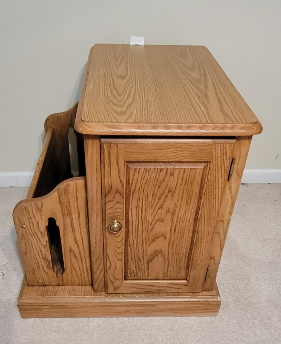 Storage for magazines or other similar items on the side and inside this solid oak piece